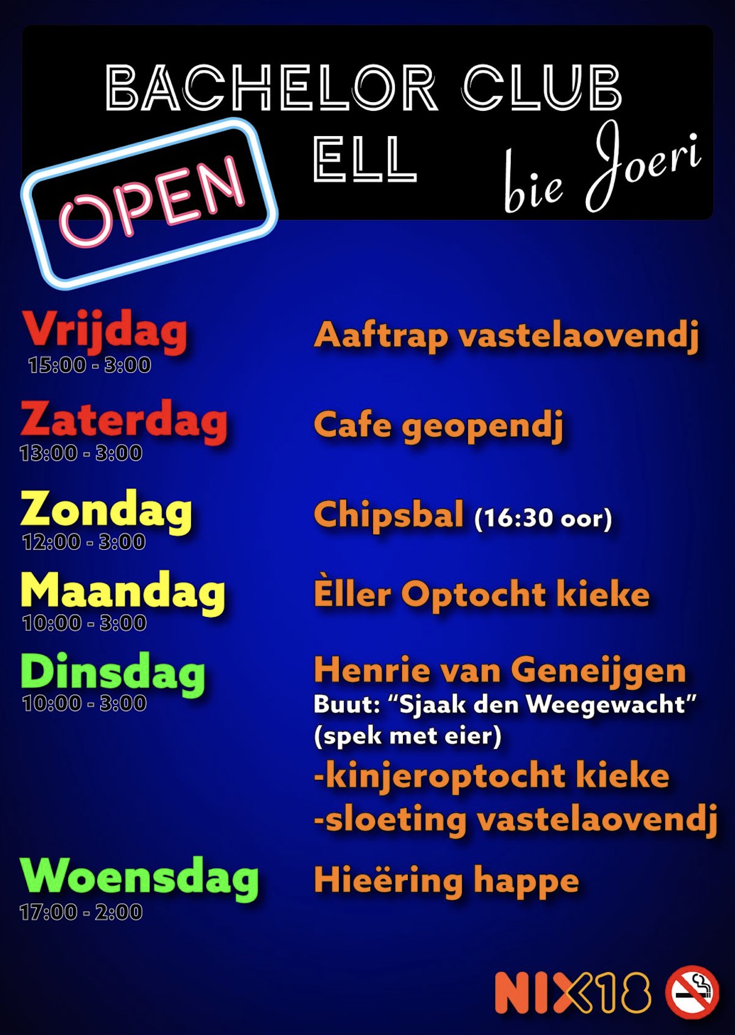 Vrijdag zal er de vastelaovendj afgetrapt worden, zaterdag is het cafe gewoon geopend. Zondag is het cafe geopend en zal er het traditionele chipsbal plaatsvinden. Maandag trekt de Èller optocht door de straat. Dinsdag morgen zal net zoals de voorgaande jaren de brakke ochtend worden afgetrapt met een buut. De reserve winnaar van de Limburgse Buttekampioenschappen Henrie van Geneijgen zal deze morgen de lachspieren flink losmaken met zijn buut “Sjaak den Weegewacht”. s’avonds zal traditioneel de moer worden verbrand en zal daarmee ook een eind komen aan de Vastelaovendj van 2019. Woensdag is er Hieëring happe.