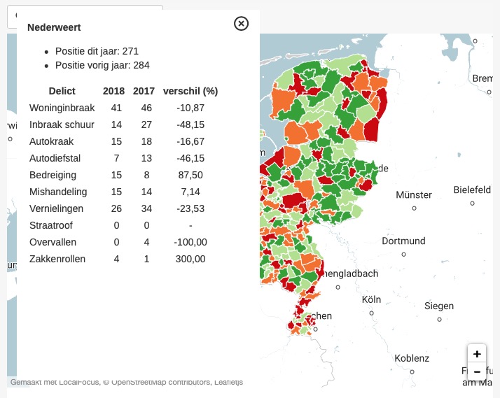 Hoe veilig is het bij jou in de buurt? De Misdaadmeter van het AD laat zien hoe de gemeentes ervoor staan. Nederweert is dit jaar gestegen van plaats 284 naar plaats 271. In totaal zijn er 355 gemeenten in Nederweerland.