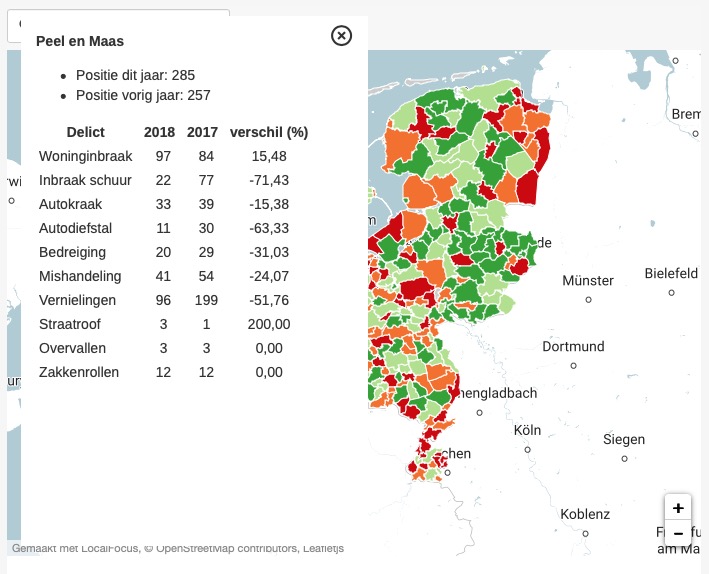De gemeente Peel en Maas is wat veiliger geworden volgens de Misdaadmeter. De gemeente is gestegen van positie 257 naar 285. Op alle gebieden geven de cijfers een positiever beeld. Alleen het aantal straatroven is gestegen van 1 naar 3.