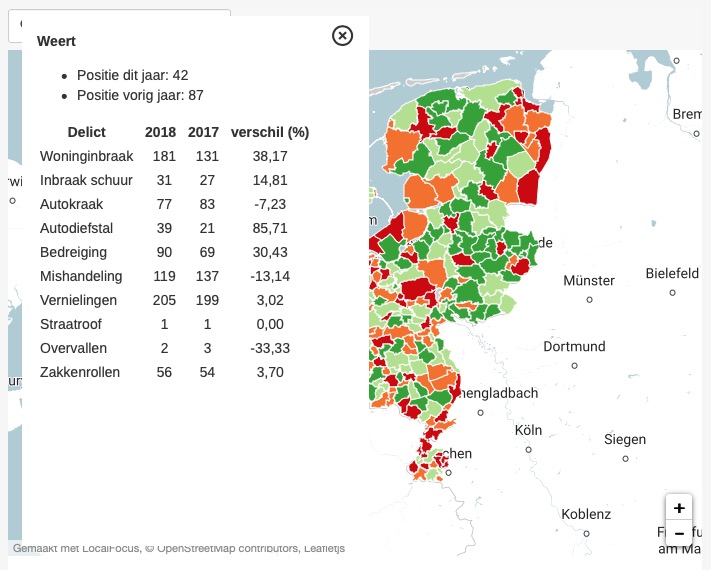 De stijging in de gemeente Nederweert is vooral te danken aan de verdubbeling van het aantal bedreigingen. Vorig jaar waren er 8 terwijl er in 2018 maar liefst 15 bedreigingen zijn gemeld. Verder zijn het aantal woninginbraken, inbraak in schuren, autokraken, autodiefstallen en vernielingen gedaald.