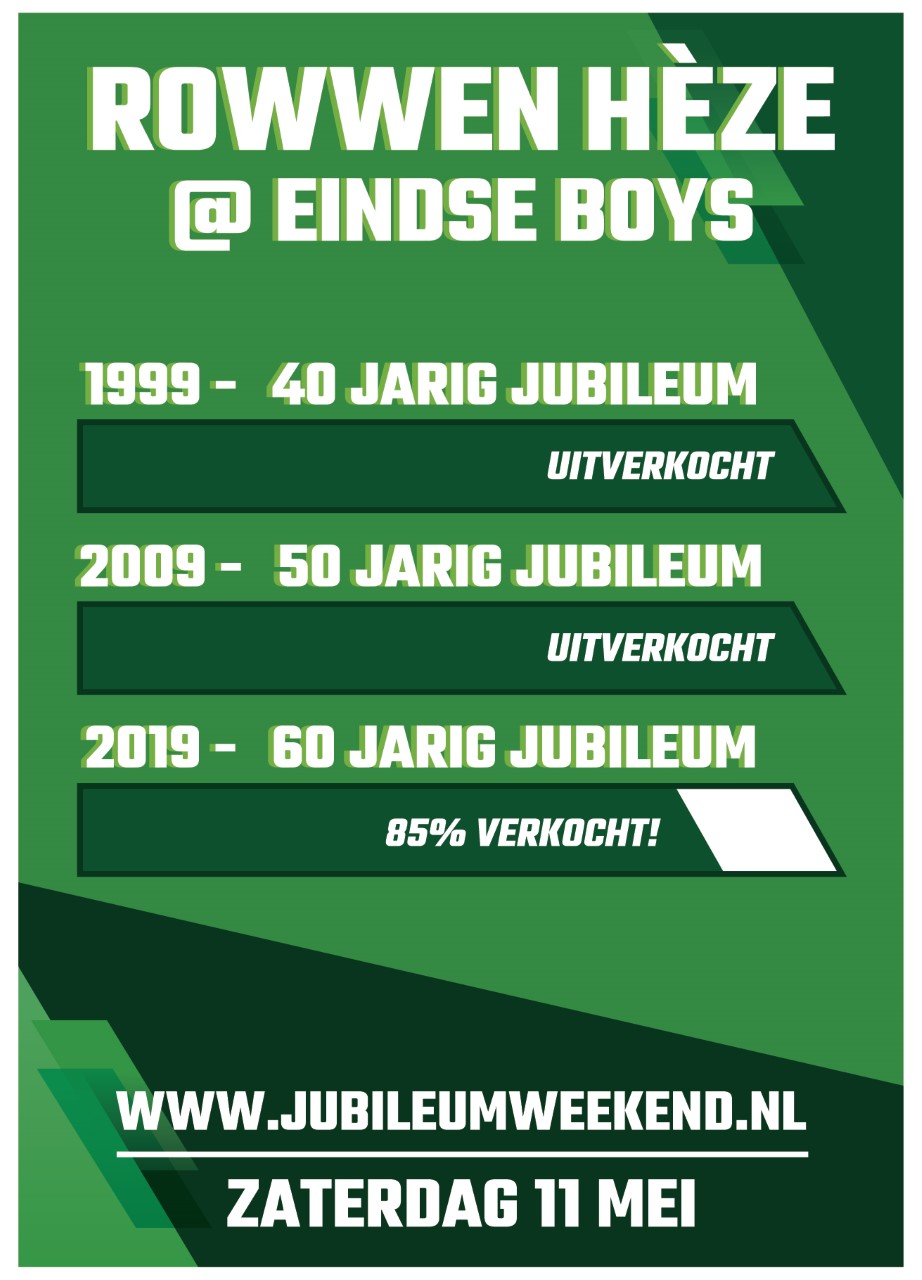 De verkoop verliep al zo voortvarend dat de tent voor 11 mei tussentijds tot 60 meter werd verlengd. De interesse in het concert van Rowwen Hèze blijkt zo groot dat momenteel al 85% van de maximale beschikbaarheid over de digitale toonbank is gegaan. Wil jij er ook bij zijn? Voorkom dan teleurstelling en schaf je tickets aan via www.jubileumweekend.nl