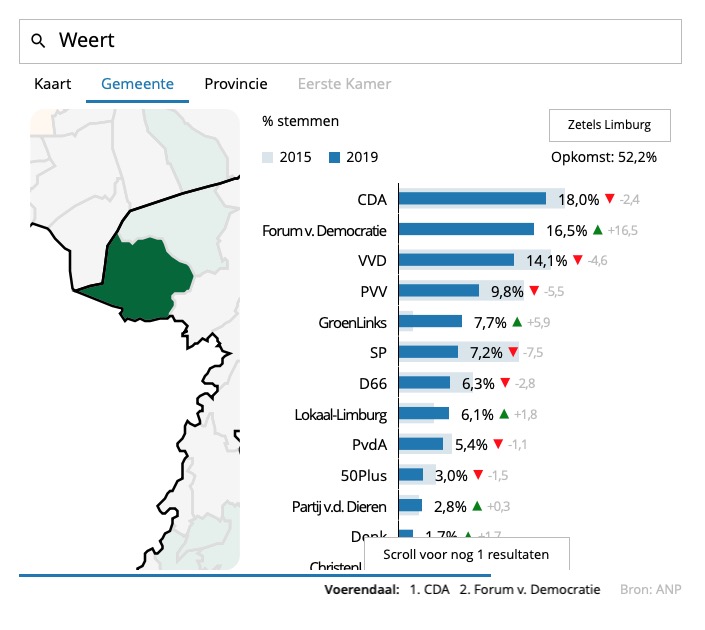 De uitslag van de provinciale verkiezingen in Weert is bekend. De opkomst in Weert was dit jaar 52,2%. In total gingen 20.383 mensen naar de stembus in Weert.