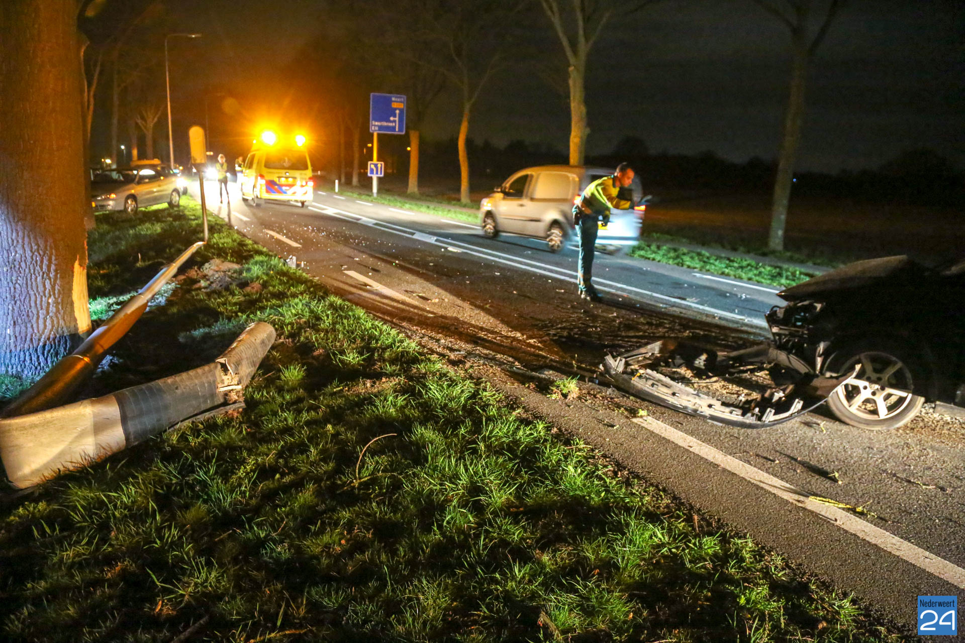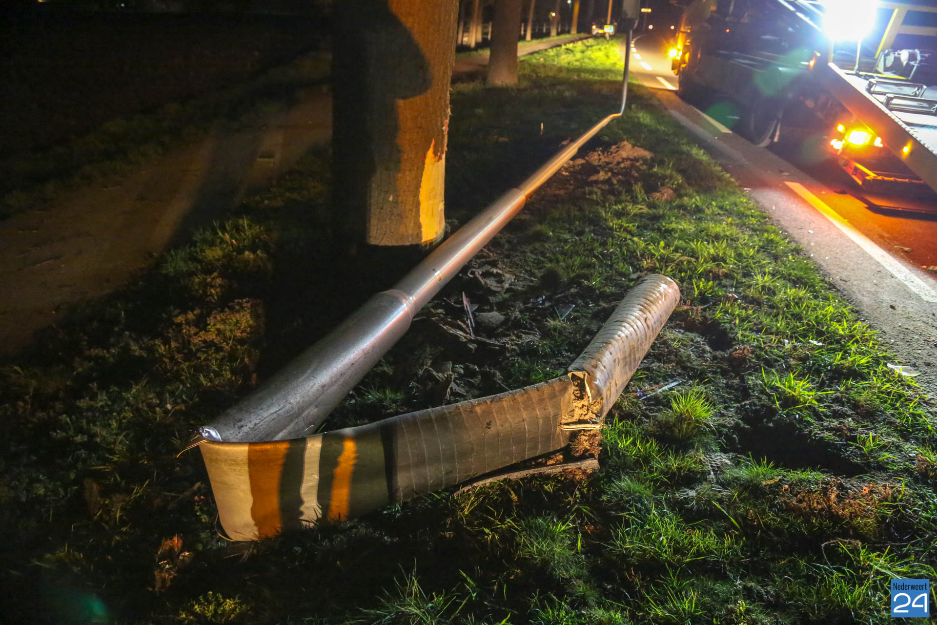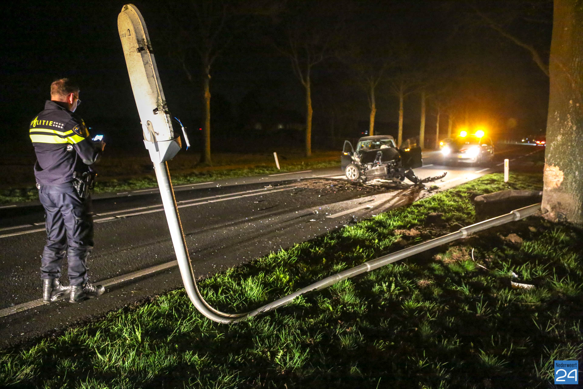 De personenauto kwam door nog een onbekende oorzaak in botsing met een lichtmast en een boom. Het voertuig raakte zwaar beschadigd en de lichtmast brak af en kwam vervolgens in de berm terecht.