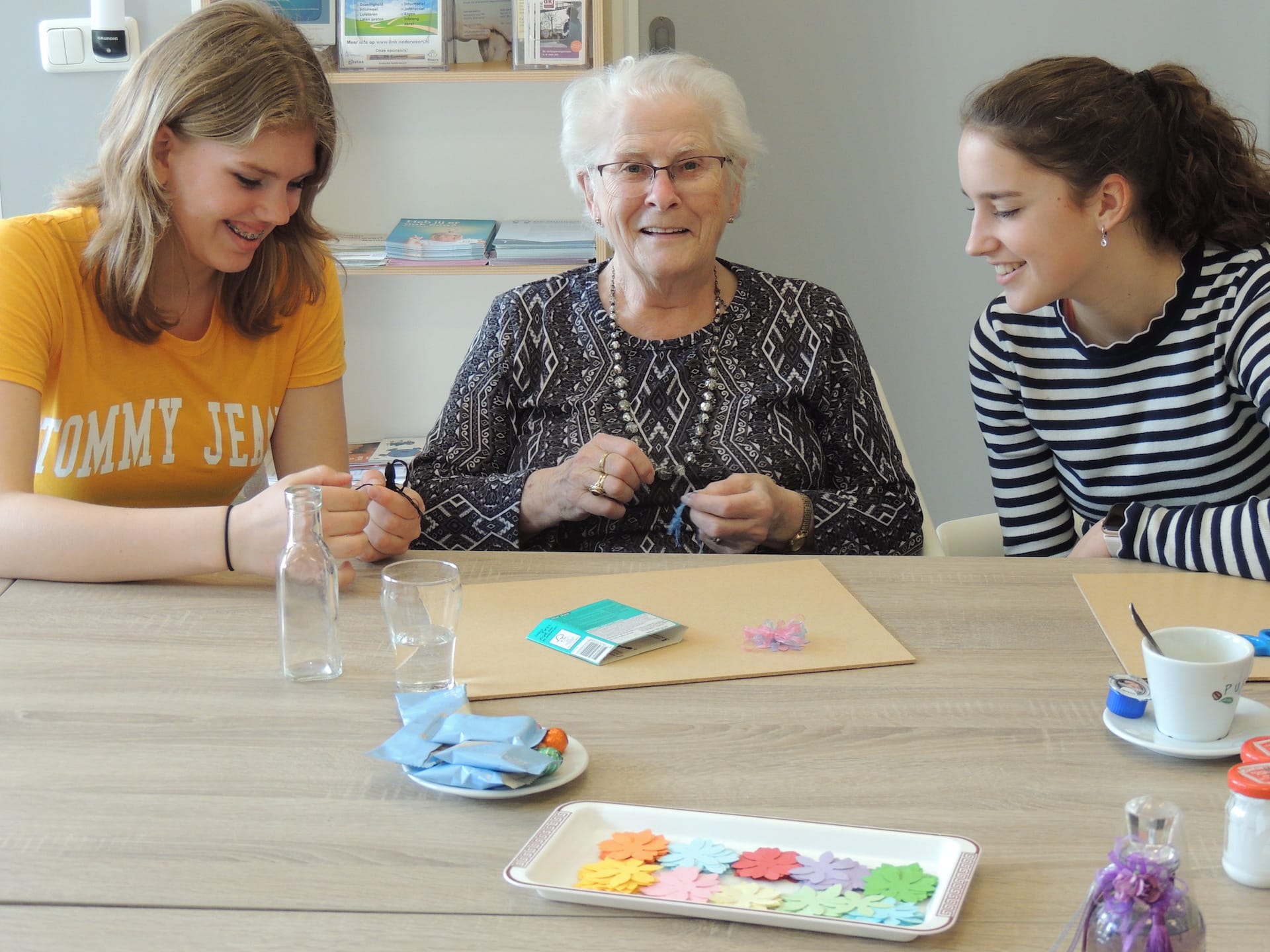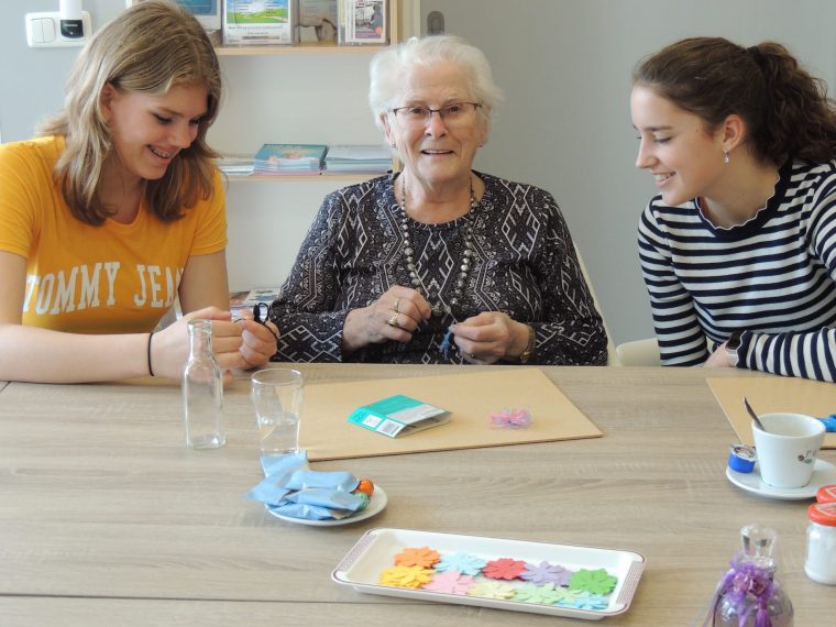 Sandra: “Een mooie gelegenheid om onze jeugd te laten ervaren hoe zij ouderen op een simpele en ongedwongen manier kunnen helpen.” De crea gasten reageerden aangenaam verrast op deze spontane hulp van Isabelle en Isa, die zichtbaar plezier hadden in het meehelpen en oppimpen van de flesjes met bloemen en kwastjes. “Als U deze draad vastdrukt, draai ik de andere er omheen.  Zo klonk de enthousiaste stem van Isa tijdens een creatief samenspel van respect en gezelligheid.