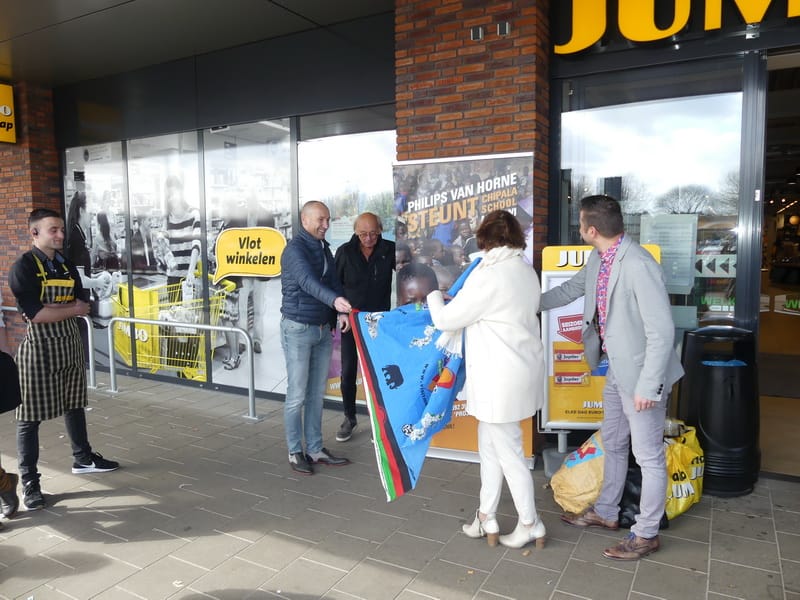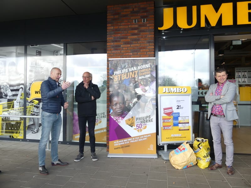 In het kader van het 50-jarig bestaan van de Philips van Horne is maandagochtend officieel de grote emballage-actie voor het jubileumonderwijsproject van de Philips van Horne in Malawi van start gegaan. Directeur Stan Heerschap en de Weerter wethouder (en oud-leerling) Geert Gabriëls onthulden samen met Antje Award winnares Thérèse Huijbregts, de Malawi banner bij de grote Jumbo supermarkt op Leuken.