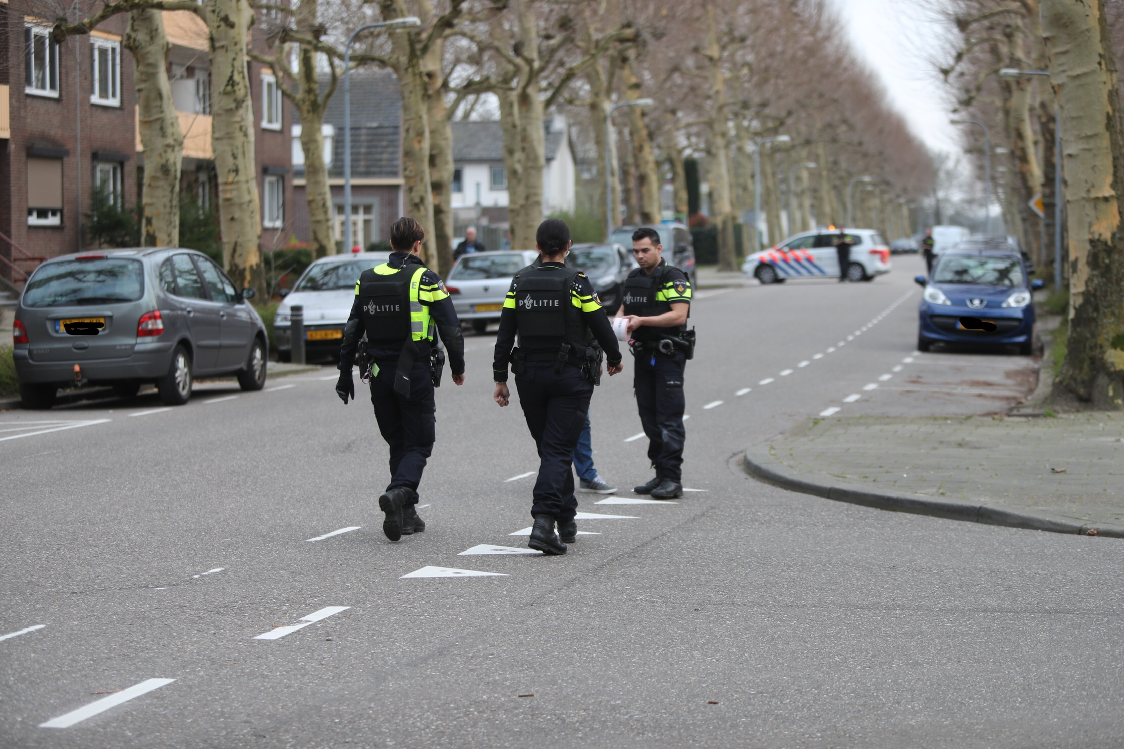 De politie heeft een groot gedeelte van de straat met rood-wit lint afgezet. Meerdere patrouilles zijn aanwezig om te onderzoeken wat er precies gebeurd is.