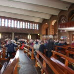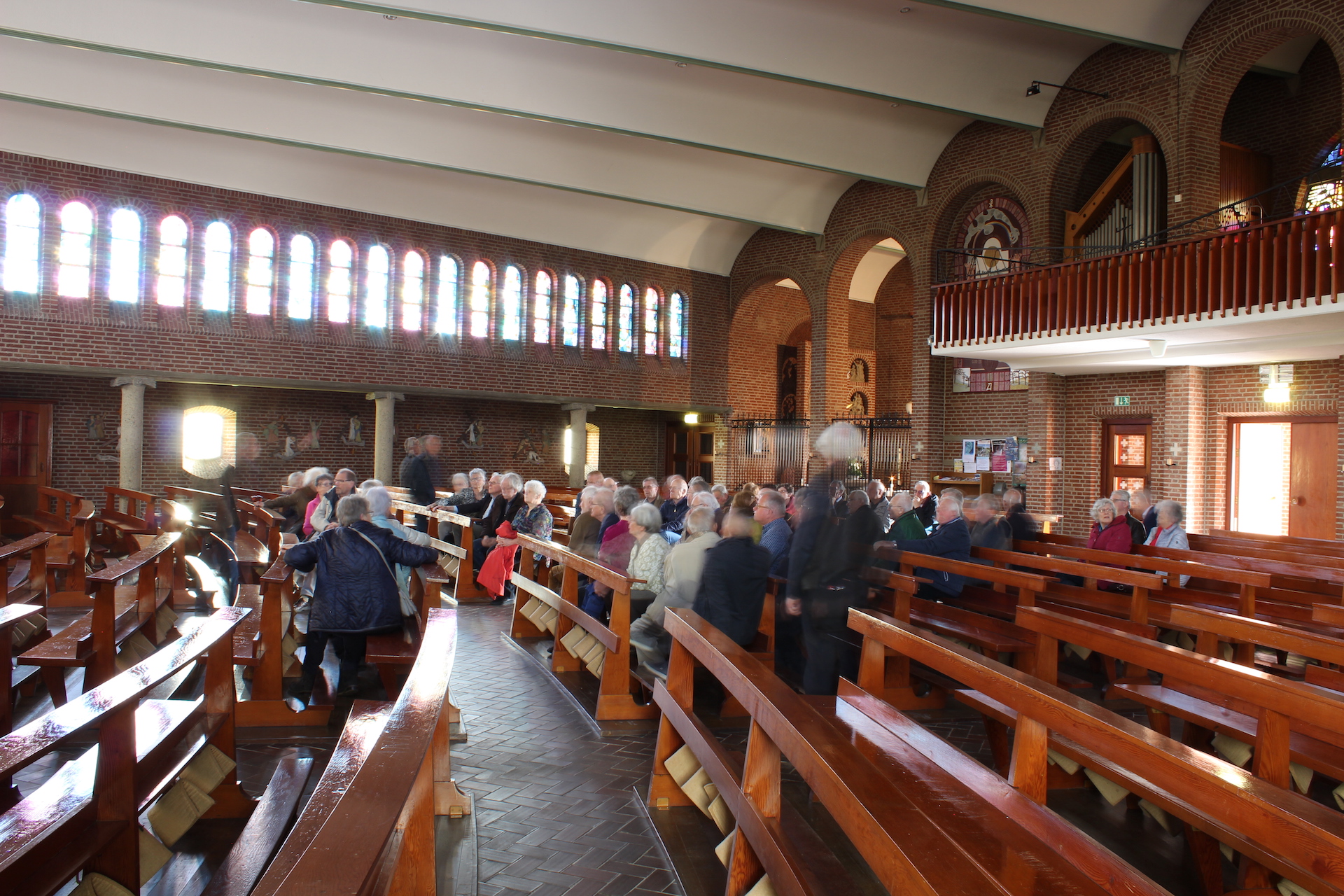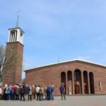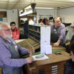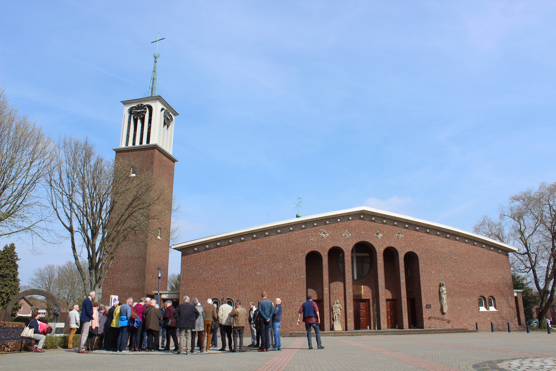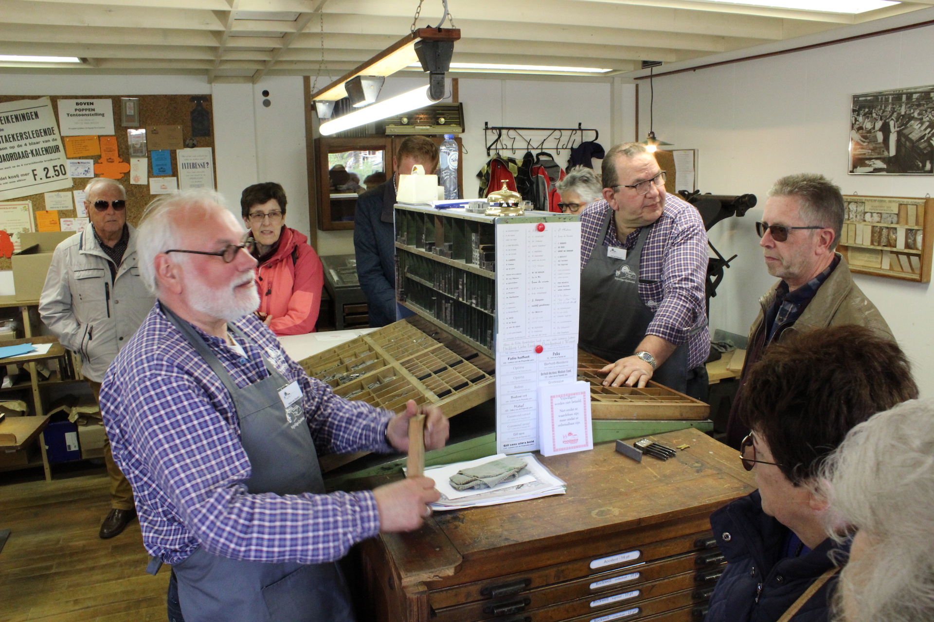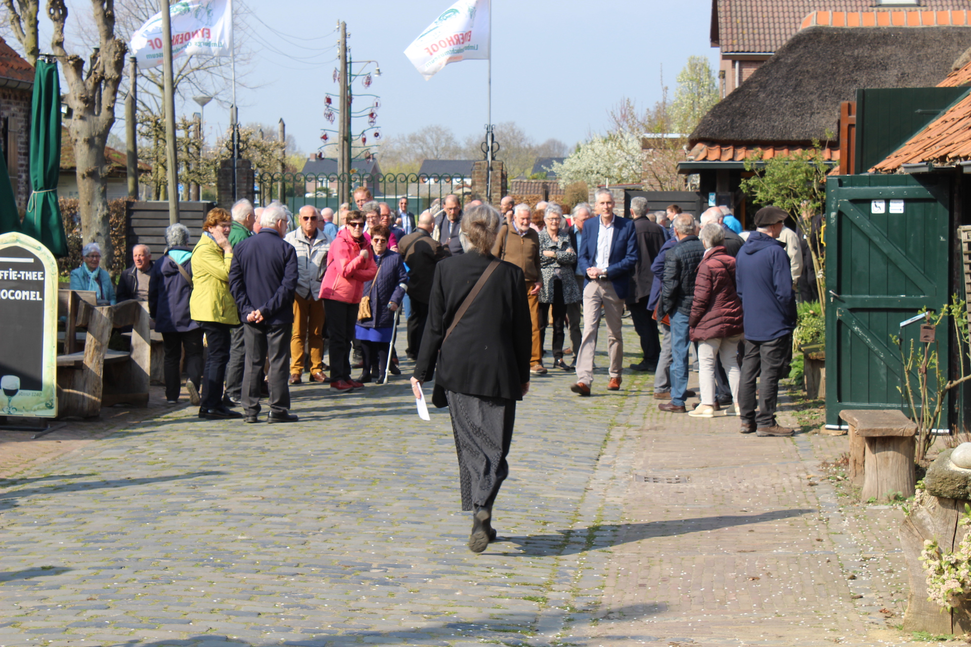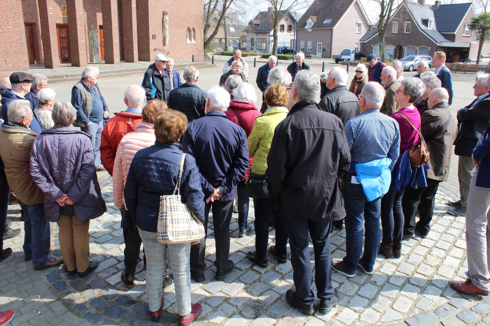 Hoofdgerecht van de middag was een geleide excursie naar de St. Gerardus Majellakerk. Zowel de bouwkunst als de beeldentaal van deze kerk zijn uniek in Limburg. Gids Henk Verheijen wist zijn publiek van de eerste tot de laatste minuut te boeien met zijn uitleg. Dat gold ook voor de enthousiaste gidsen van het openluchtmuseum, die de vrijwilligers langs een selectie van de vele bezienswaardige ambachten en bouwwerken van Eynderhoof leidden. Waarna het goed toeven was op het buitenterras, genietend van de milde lentezon. Na afloop kreeg elke bezoeker een gedrukte attentie mee naar huis; een ambachtelijke meesterproef van de drukkersgroep van het museum.