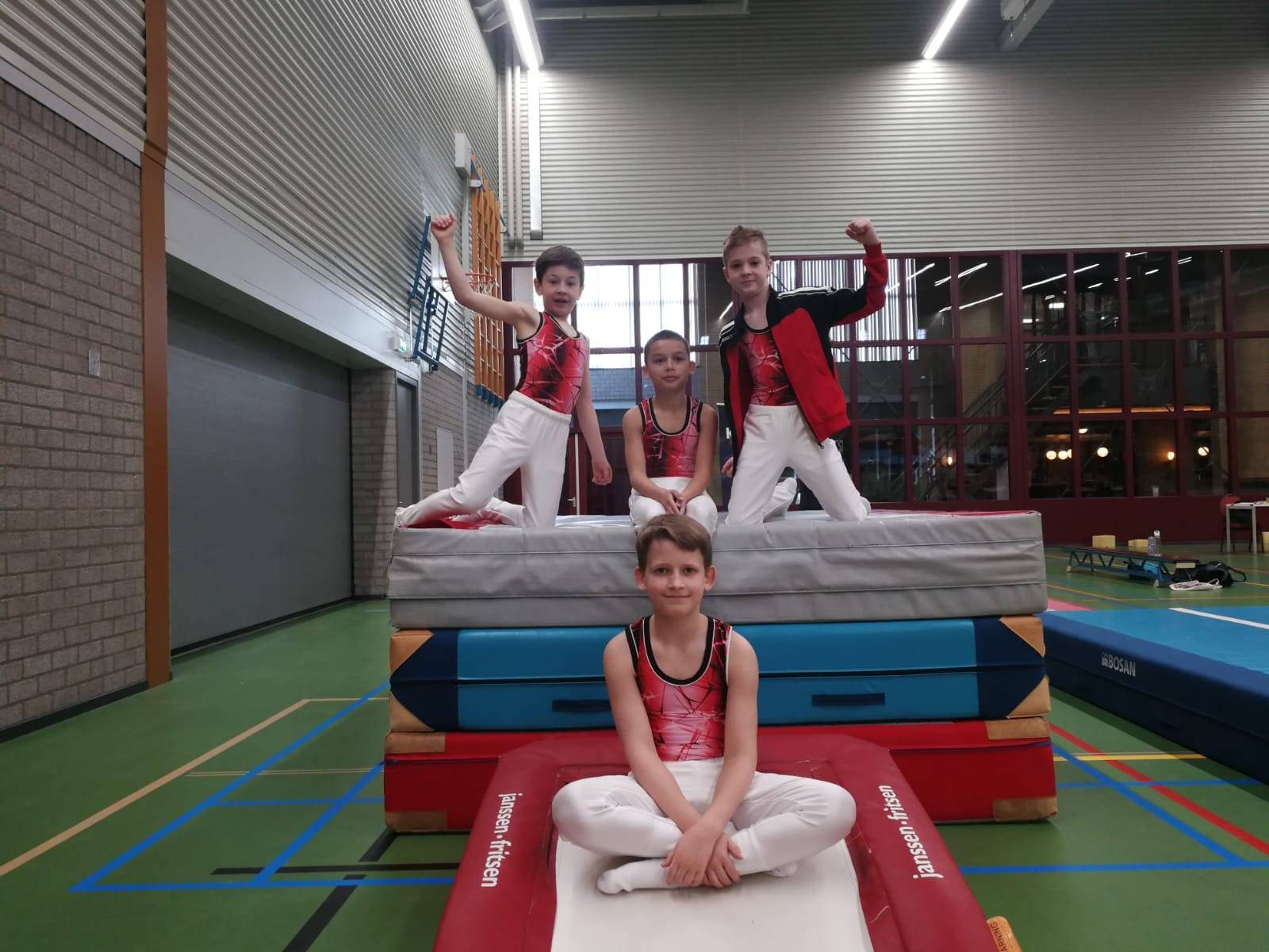 In de ochtend mochten de jongens Martijn Nies, Tiën Taman, Mats Liplijn en Thijs van Mersbergen in actie komen bij de instap 4e divisie. Voor alle jongens begon de wedstrijd goed. Ze turnden een mooie vloer oefening gevolgd door voltige, ringen en sprong. Op het einde van de wedstrijd slopen er een paar foutjes in maar dat mocht de pret niet drukken. Met het enthousiasme en de inzet kunnen deze heren terug kijken op een mooie wedstrijd waarbij uiteindelijk Tiën 15e, Martijn 19e, Mats 22e en Thijs 27e werd. Ze stonden hun mannetje al was het net niet genoeg om door te gaan.