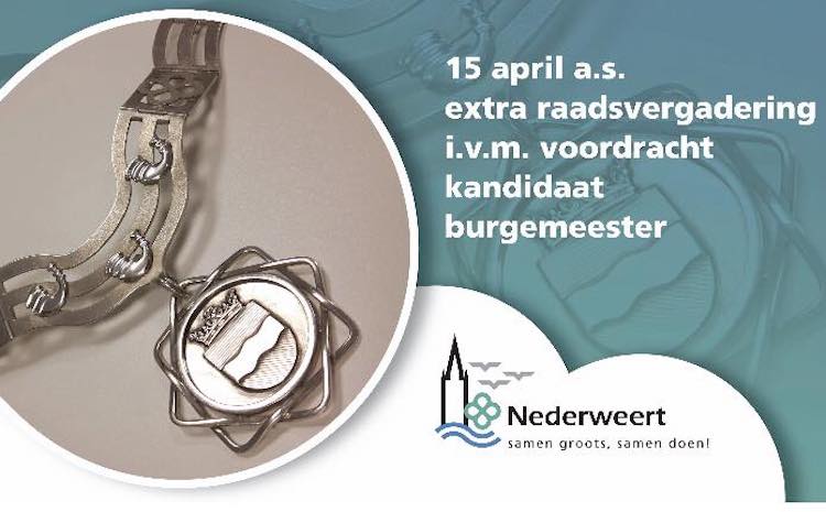 De vertrouwenscommissie heeft haar voorbereidende werk, om te komen tot een aanbeveling over een kandidaat voor het ambt van burgemeester in de gemeente Nederweert, afgerond. In een extra besloten raadsvergadering op maandag 15 april 2019 om 18.00 uur neemt de raad een besluit over de voordracht van de kandidaat. Daarna wordt om 19.00 uur in een openbare vergadering de naam van de kandidaat medegedeeld.