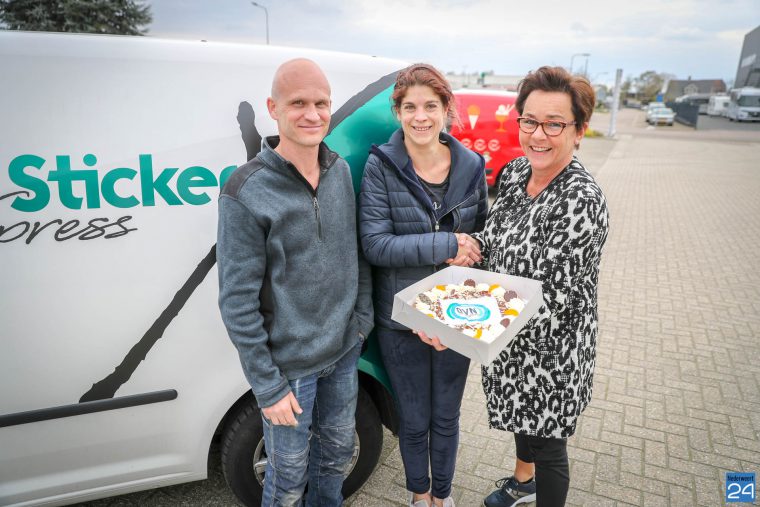 Sticker Xpress uit Nederweert is het jongste lid van de Ondernemers Vereniging Nederweert (OVN). Speciaal voor deze gelegenheid overhandigde Marjo Janssen van IJssalon Florence een taart aan de eigenaren Maartje Buijs en Bjørn Verbeek.