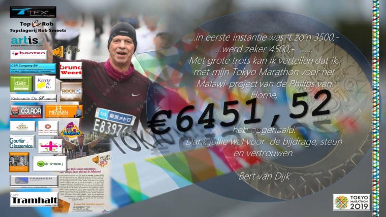 Gymnastiekleraar Bert van Dijk van de Philips van Horne in Weert heeft met zijn deelname aan de marathon in Tokyo 6451,52 euro opgehaald. Hij liep deze marathon op zondag 3 maart in het kader van het jubileum-onderwijsproject van de Philips van Horne: de Chipala school in een krottenwijk in Lilongwe, de hoofdstad van Malawi.