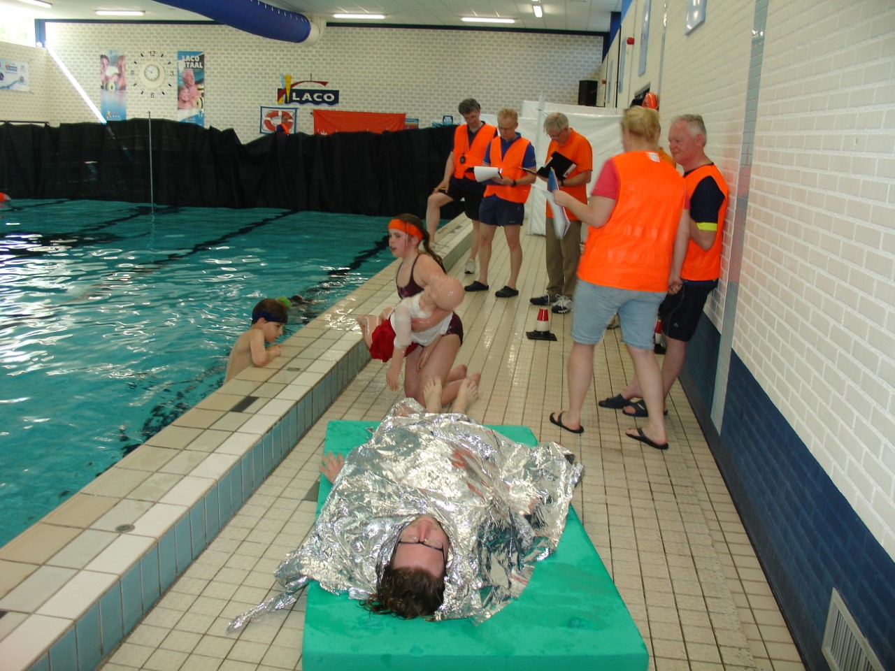 Een om hulp schreeuwende man, aan de overkant van een groot meer. Wat zou jij doen? De ploegen uit alle uithoeken van Nederland en een ploeg uit België wisten zich hier wel raad mee. Het was het scenario van de jaarlijkse wedstrijd ‘Eerste Hulp aan Drenkelingen’ in het zwembad van Nederweert. Zij twijfelden geen seconde en zwommen de bijna 200 meter om te hulp te schieten bij het nagebootste waterongeval. Dat een beregoede conditie belangrijk is voor het reddingszwemmen werd nog maar eens goed duidelijk gemaakt. Hoe sneller er gezwommen werd, hoe meer tijd er over bleef om de slachtoffers uit het water te halen. En net als in de realiteit zit in zo’n situatie niet altijd alles mee. Een van de redders werd ingefluisterd om tijdens het zwemmen kramp in beide benen te krijgen, waardoor hij/zij achter moest blijven en het team eerst de prioriteit had om de eigen mensen in veiligheid te brengen.