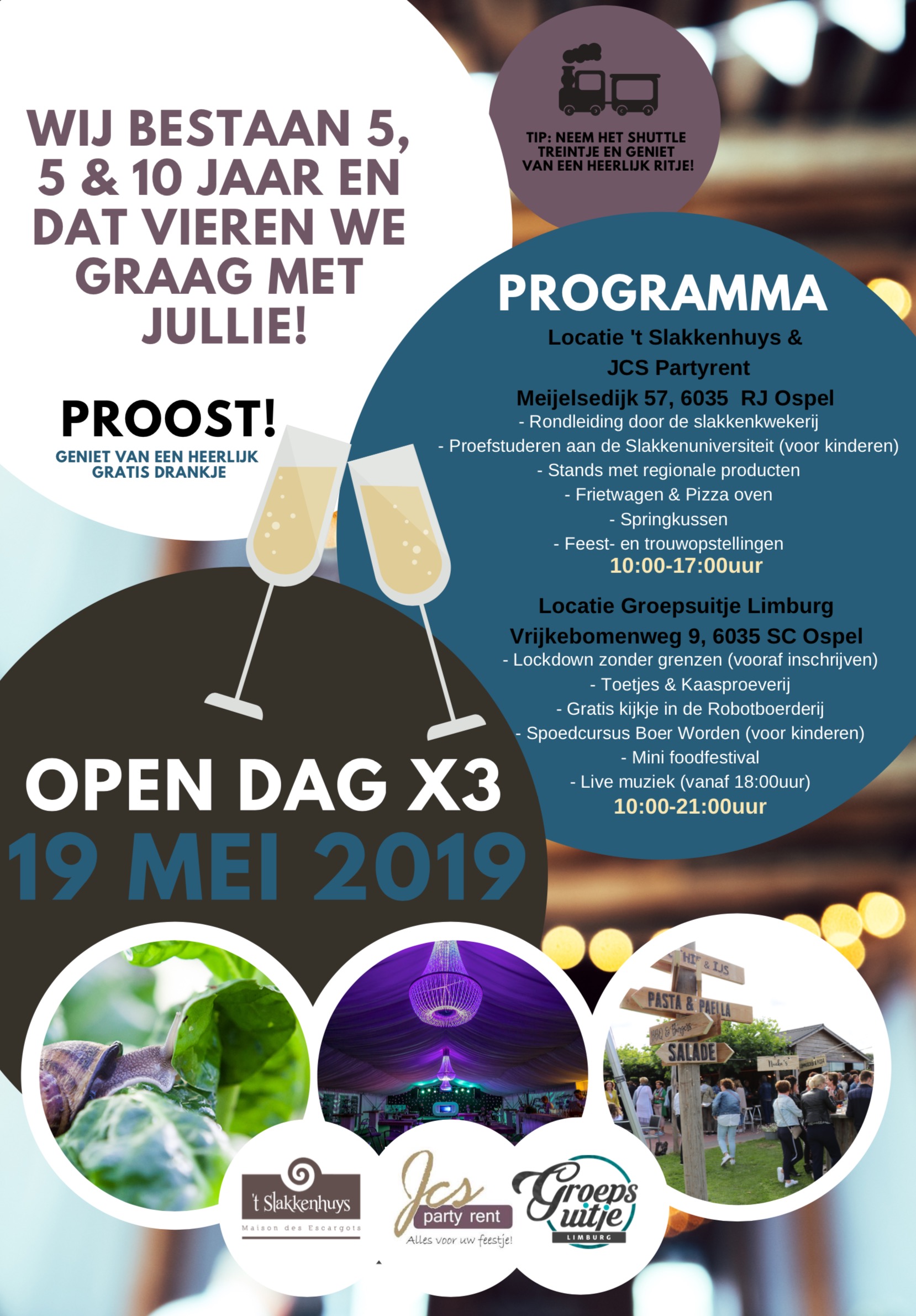 ’T Slakkenhuys, JCS Partyrent & Groepsuitje Limburg bestaan 5, 5 en 10 jaar! Driedubbel feest en dat vieren ze graag samen met jullie! Bij deze nodigen ze jullie dan ook van harte uit op onze Open Dag op 19 mei. Zowel op locatie bij ’T Slakkenhuys als bij Groepsuitje Limburg kun je genieten van allerlei activiteiten voor jong en oud!