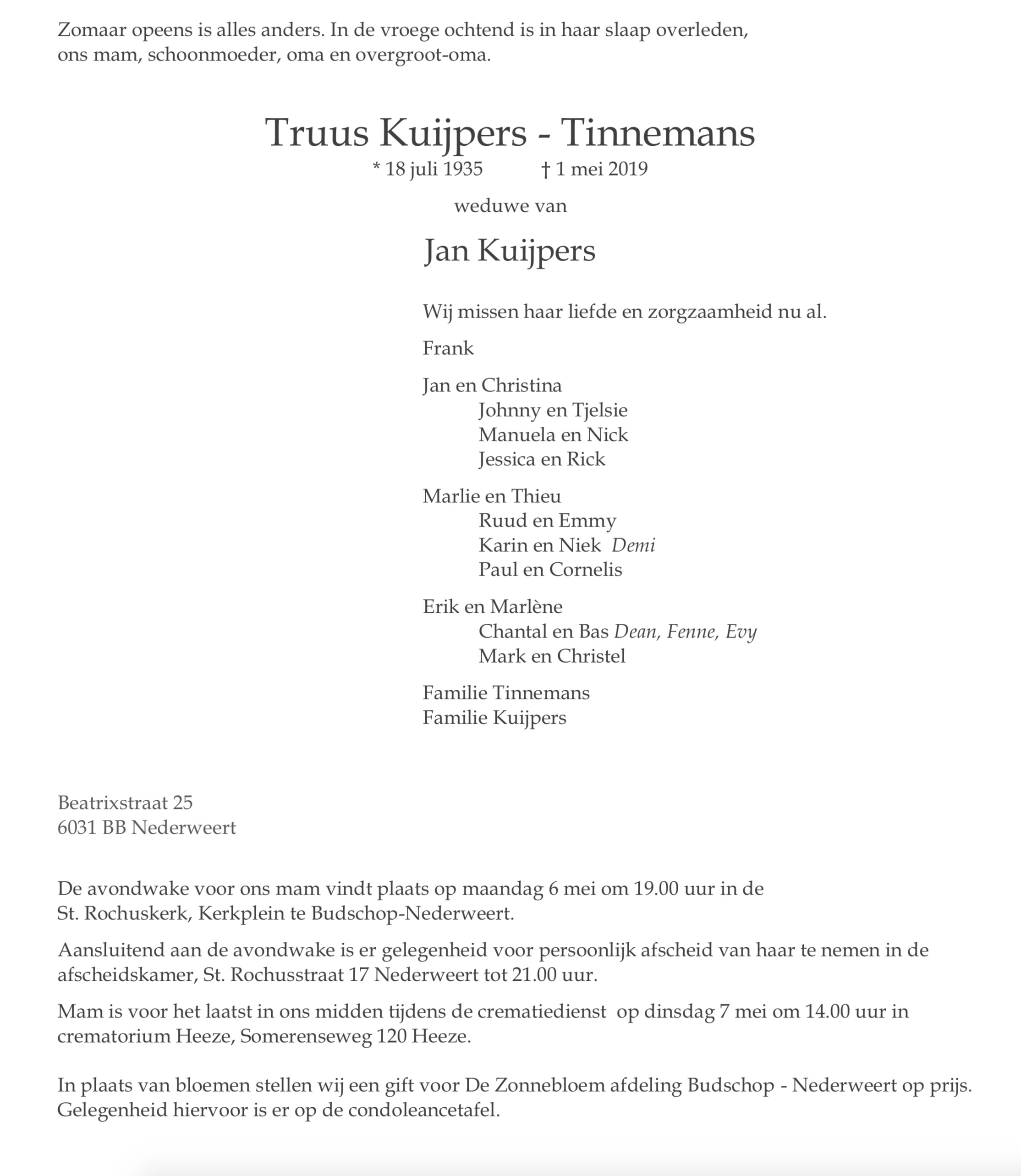 Overlijdensbericht: Truus Kuijpers – Tinnemans