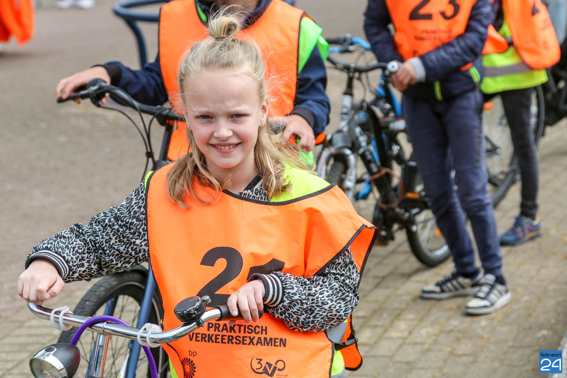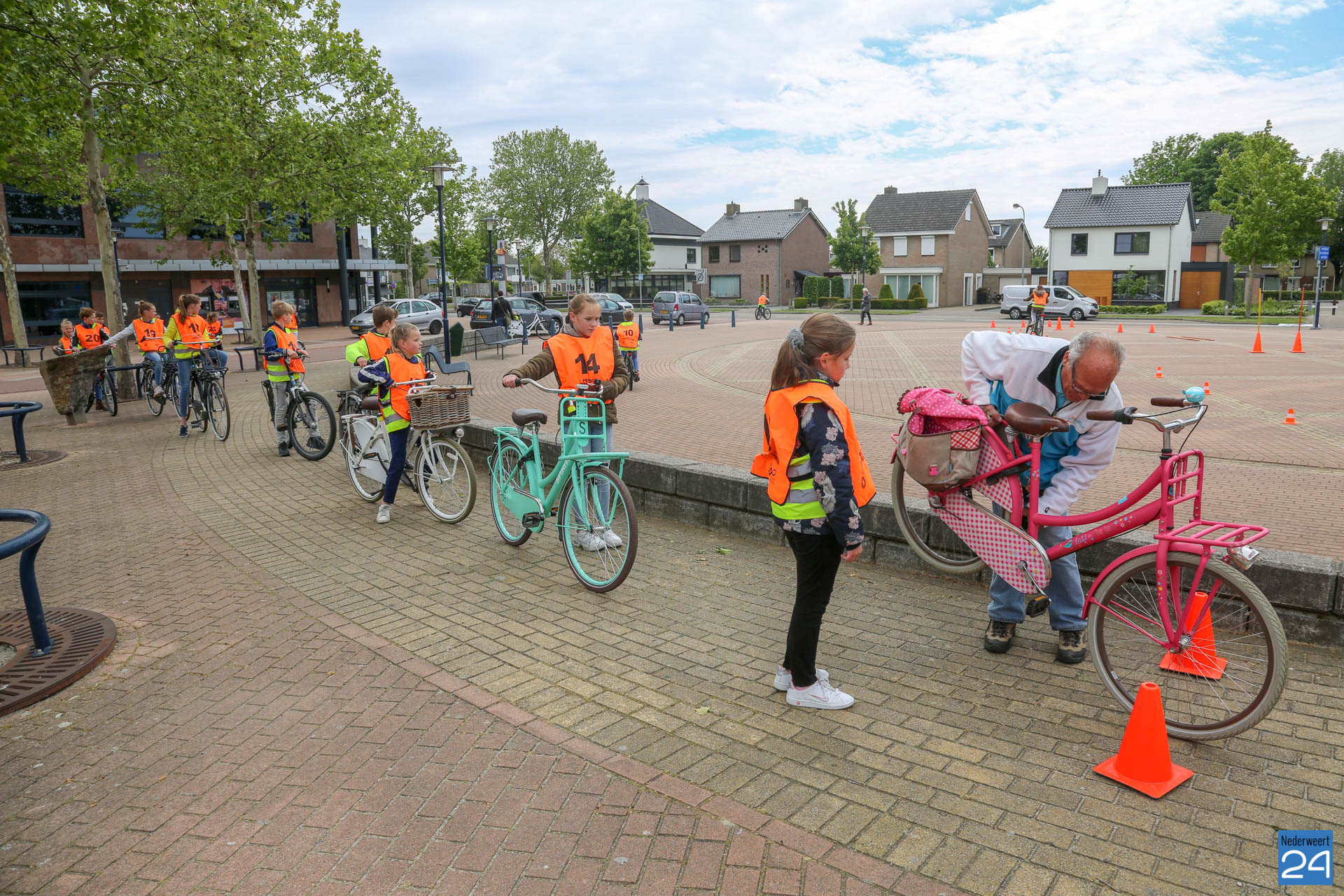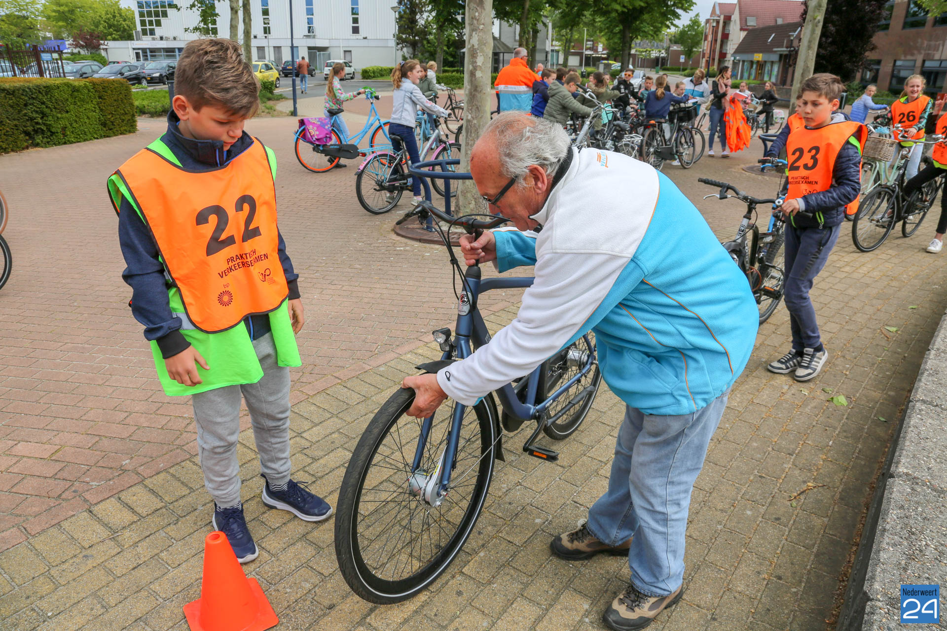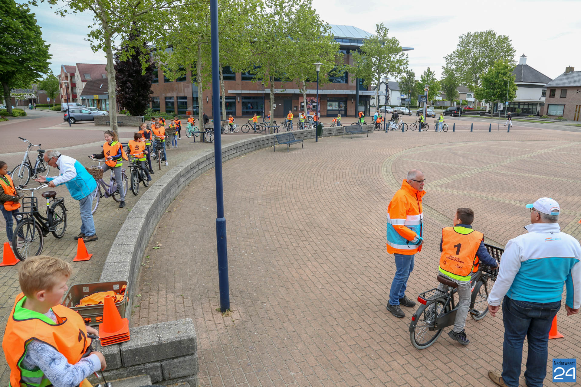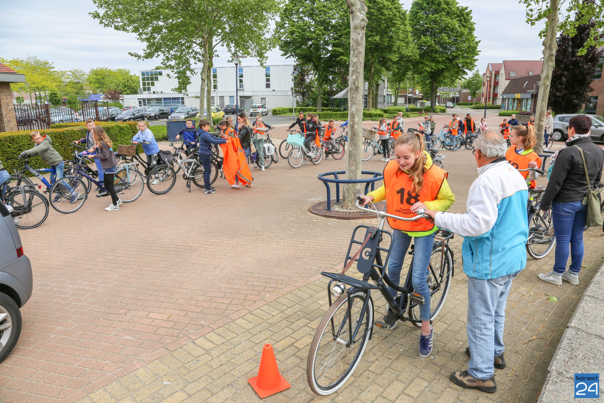 Vandaag fietsten zo’n 150 leerlingen van groep 7 van de Nederweerter basisscholen met oranje hesjes door de straten van Nederweert voor hun praktijk verkeersexamen. Een spannende dag voor de kinderen. Het theoretische gedeelte van het examen werd al eerder afgenomen en vandaag werd getoetst of ze de opgedane kennis kunnen toepassen in het echte verkeer. In de ochtend startte de eerste 62 leerlingen van BS Budschop, BS De Schrank, BS De Tweesprong en BS De Zonnehof. In de middag waren de 79 leerlingen van OBS De Klimop, IKC De Kerneel en BS De Bongerd aan de beurt.