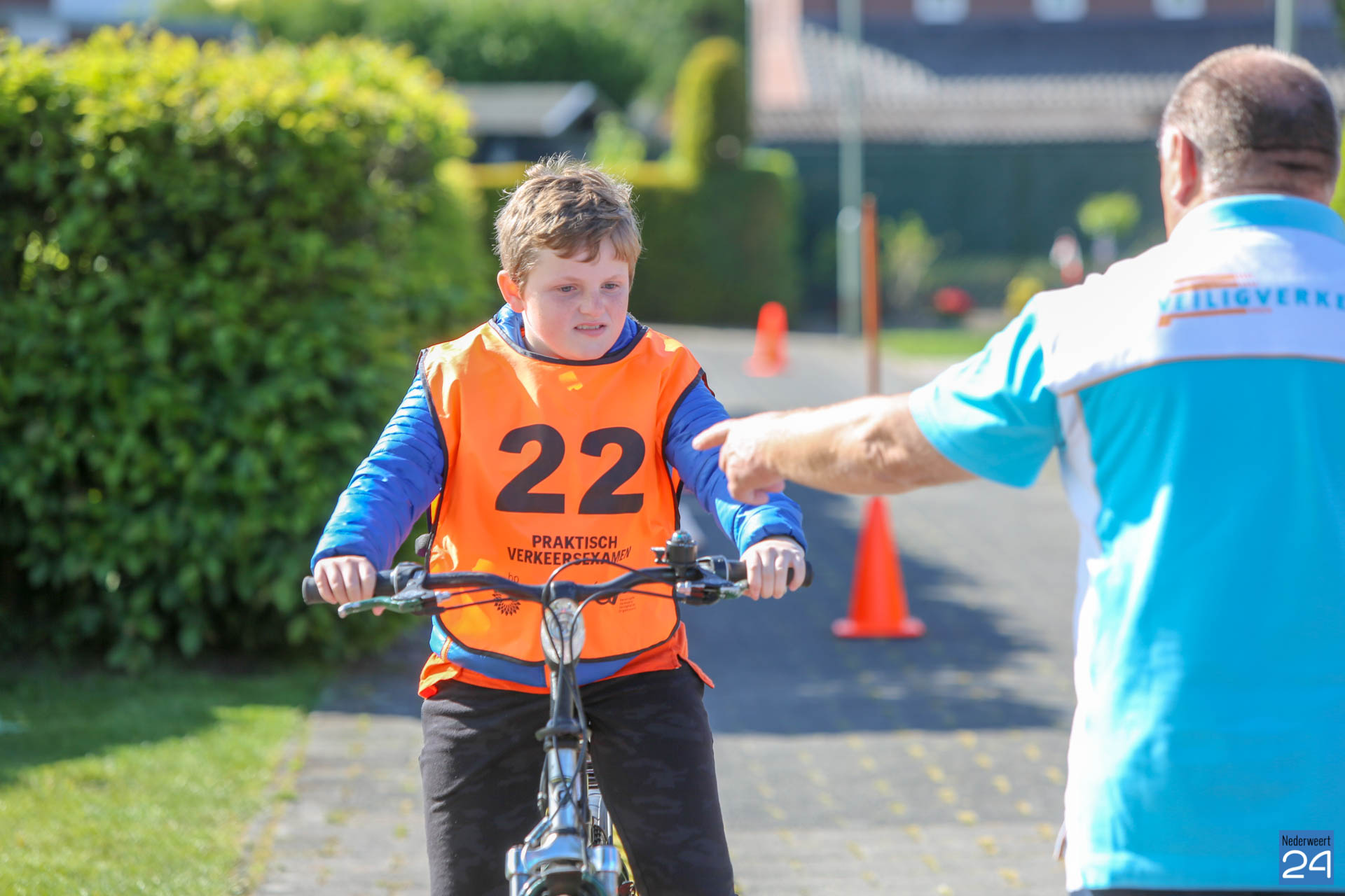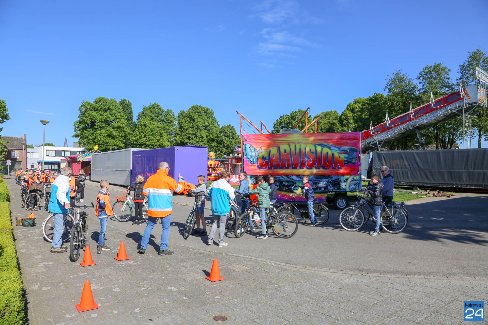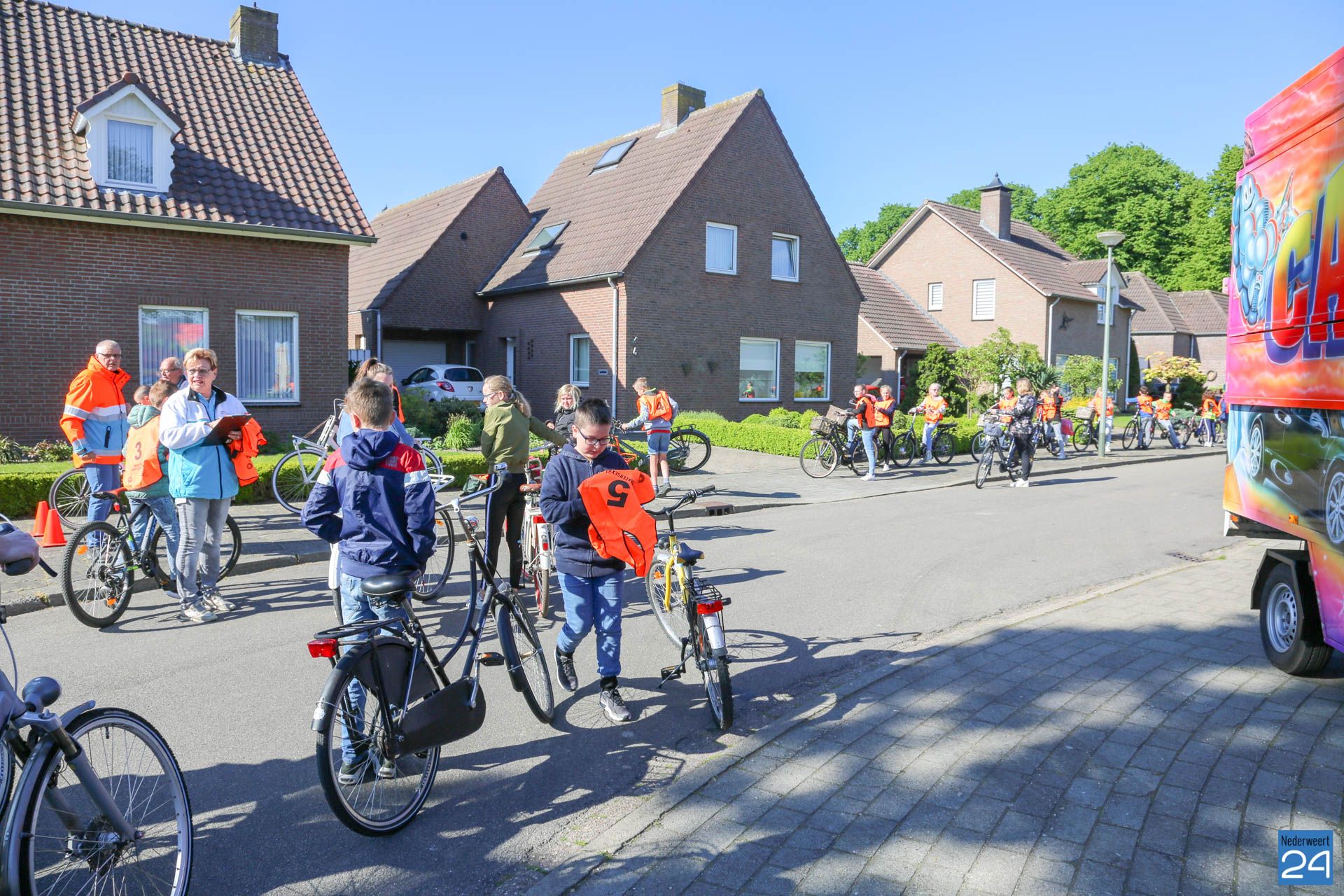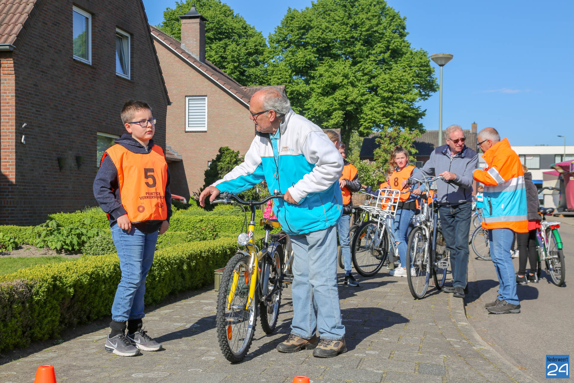Vandaag fietsen zo’n 150 leerlingen van groep 7 van de Nederweerter basisscholen met oranje hesjes door de straten van Nederweert voor hun praktijk verkeersexamen. Een spannende dag voor de kinderen. Het theoretische gedeelte van het examen werd al eerder afgenomen en vandaag wordt getoetst of ze de opgedane kennis kunnen toepassen in het echte verkeer. In de ochtend startte de eerste 62 leerlingen van BS Budschop, BS De Schrank, BS De Tweesprong en BS De Zonnehof. In de middag zijn OBS De Klimop, IKC De Kerneel en BS De Bongerd aan de beurt.