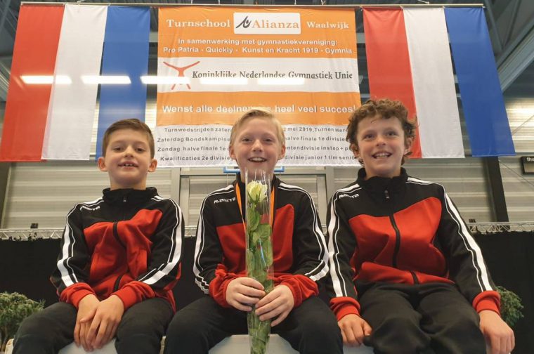 Daarna was het tijd voor de finale van 4e divisie pupillen Simon Haanen, Viktor Klaassen en de instapper Tiën Taman. Voor deze heren was het de eerste landelijke finale en dat was spannend. Op rekstok begonnen de jongens hun wedstrijd. Simon, die normaal zeer ontspannen is, had nu veel zenuwen. Hierdoor lukte een gedeelte van zijn oefening net niet, de verdere oefening zag er wel heel mooi uit. Tiën en Viktor deden hier niet voor onder. Op vloer hier en daar niet helemaal zoals gehoopt, waardoor er puntjes gemorst werden. Voltige en ringen gingen weer goed. Op sprong maakten alle jongens hele mooie sprongen. Simon deed het uitzonderlijk goed, waardoor hij een derde plaats op sprong behaalde. Op het afsluitende toestel brug werd de serie goed beëindigd. In een zeer sterk deelnemersveld werd Simon uiteindelijk 29e, Tiën 28e en Viktor 15e. Deze mooie finale ervaring nemen de heren mee naar de volgende wedstrijden.