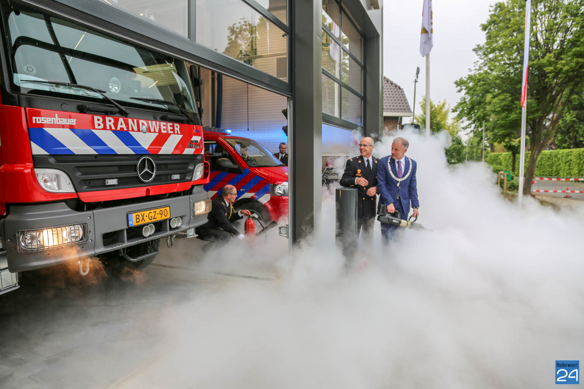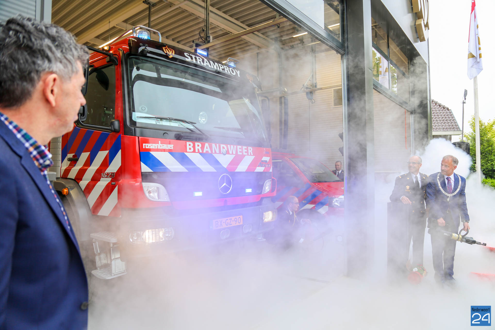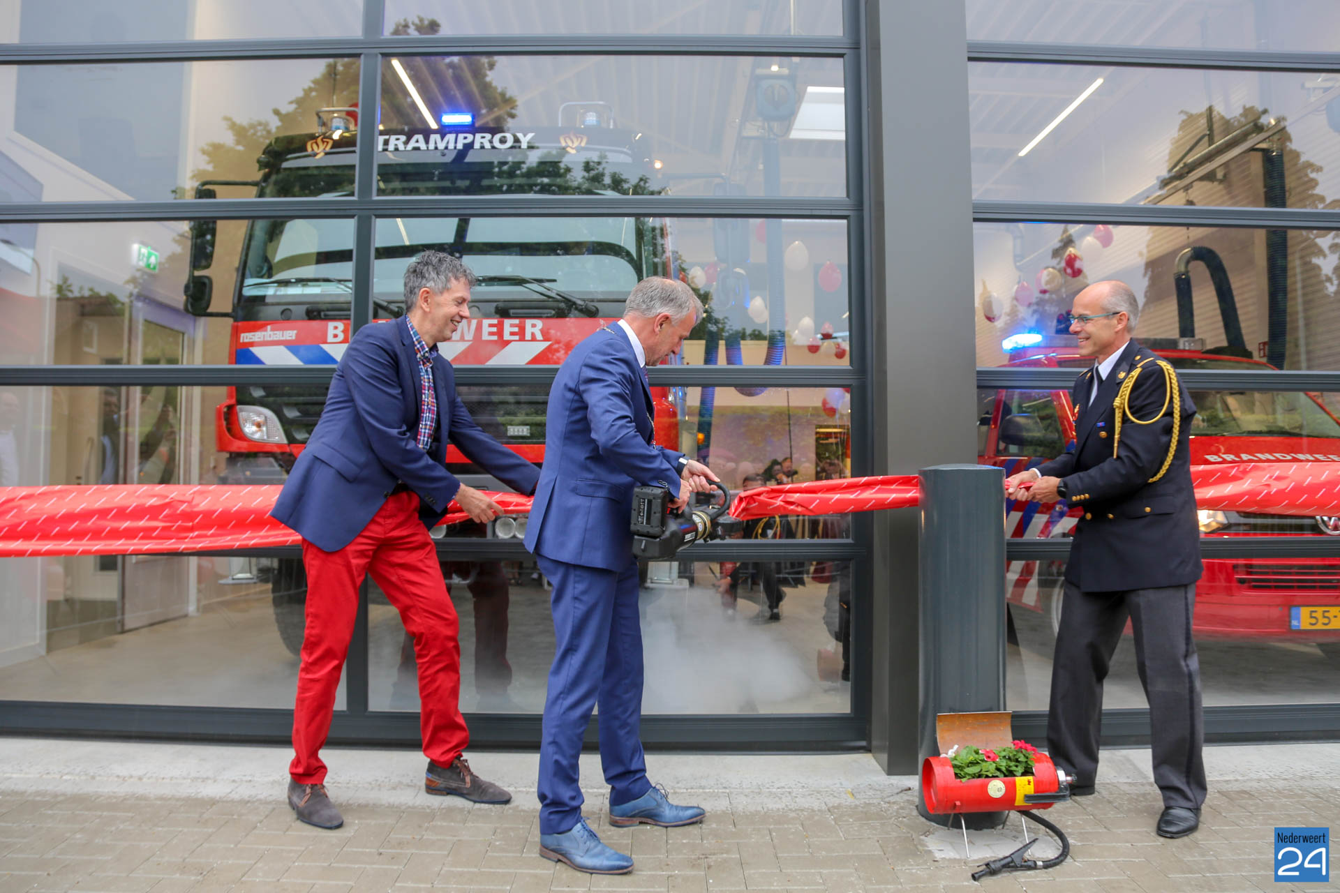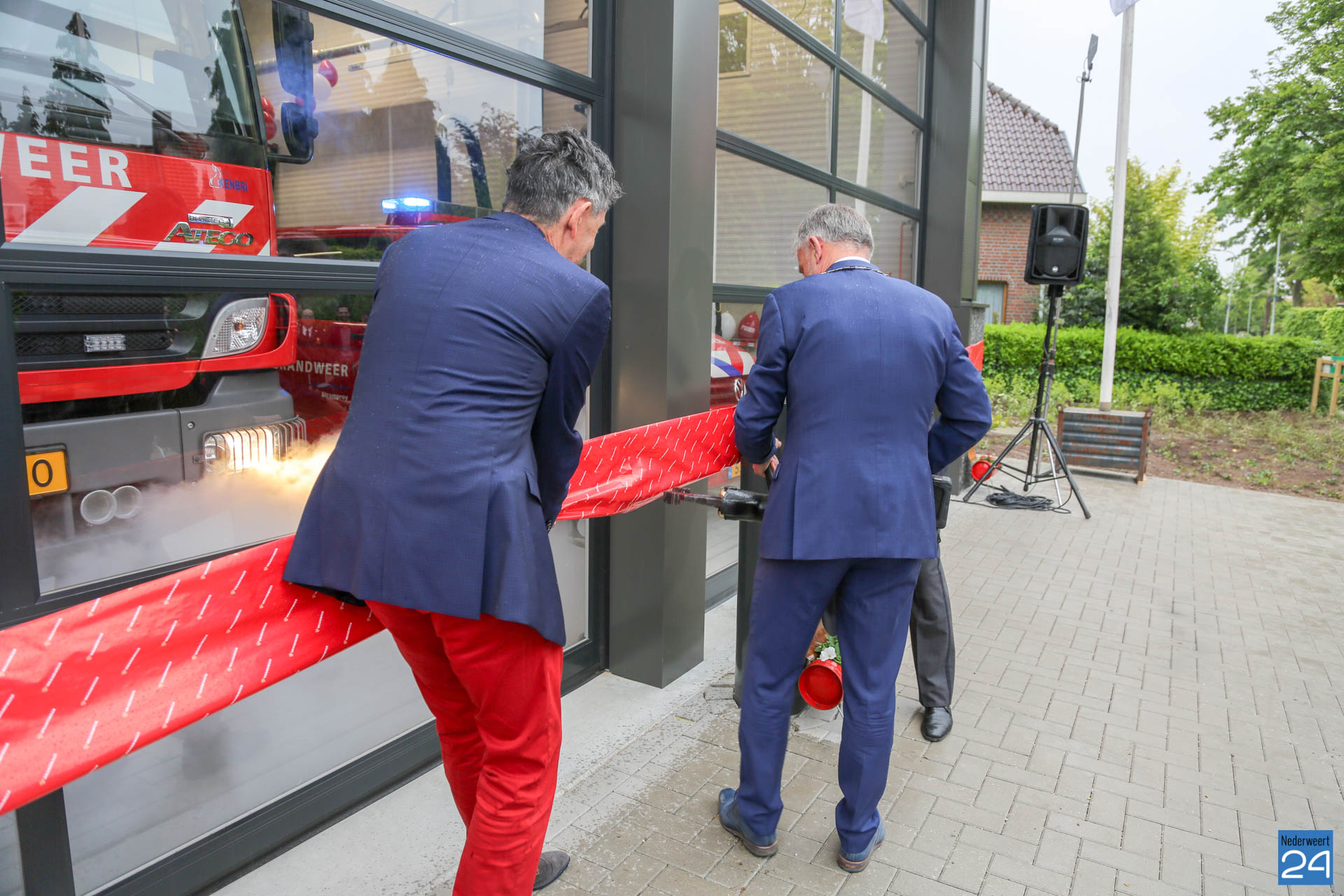 Postcommandant Dick van Aggel, regionaal commandant Paul van Mullekom en burgemeester Heijmans van Weert wisten met een spreider het lint door te knippen waarna de tankautospuit en het personeelsbusje konden uitrukken. Onder een luid applaus en loeiende sirenes, werd de kazerne geopend.