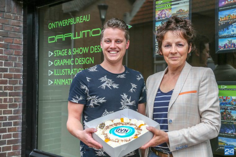 Drawmore uit Nederweert is het jongste lid van de Ondernemers Vereniging Nederweert (OVN). Speciaal voor deze gelegenheid overhandigde Conny van Laer namens de OVN een taart van bakkerij Broekmans aan eigenaar Rudi van de Schoor.