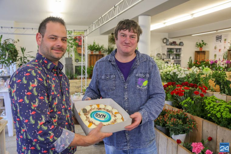 Bloemenhuis Marcel uit Nederweert is het jongste lid van de Ondernemers Vereniging Nederweert (OVN). Speciaal voor deze gelegenheid overhandigde Thijs Linsen namens de OVN een taart van bakkerij Broekmans aan eigenaar Marcel Drossaart.
