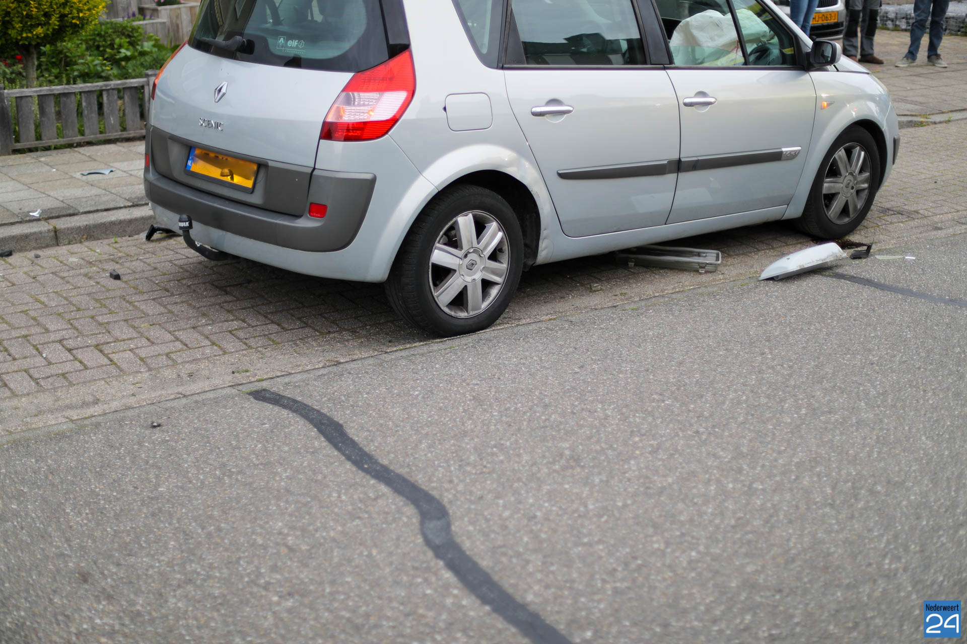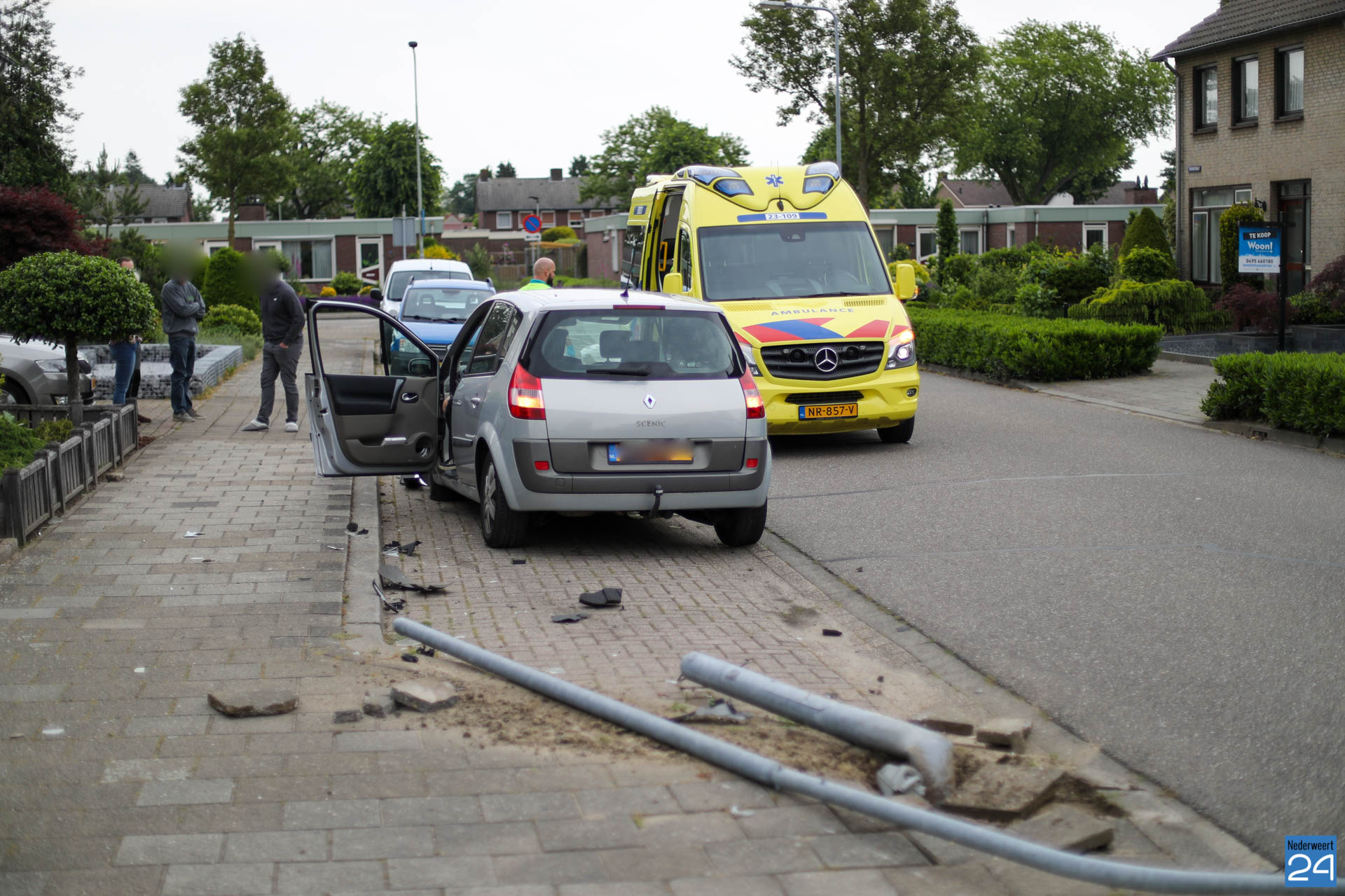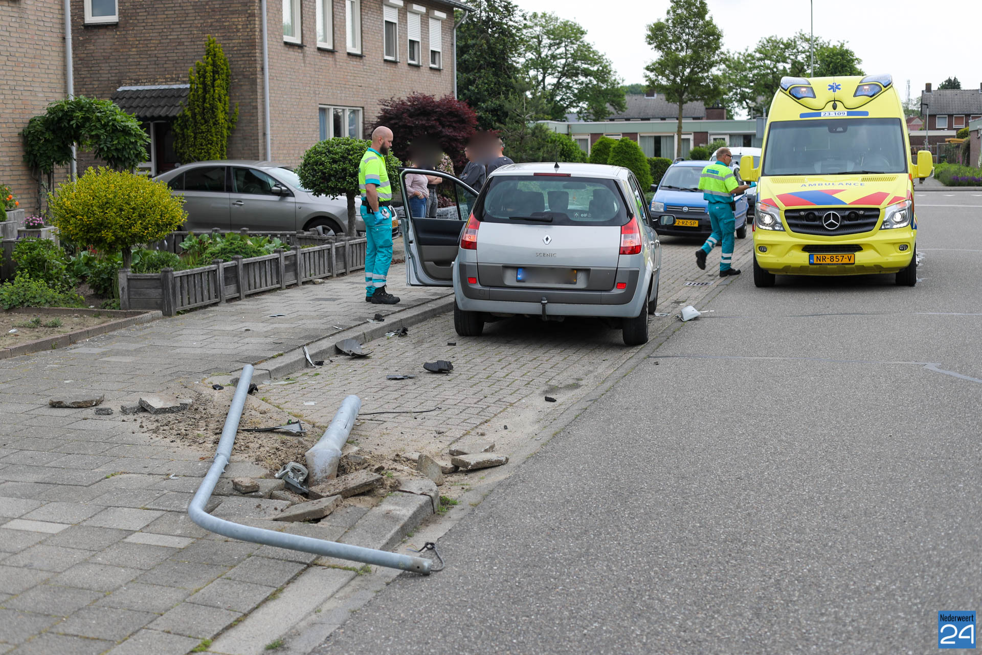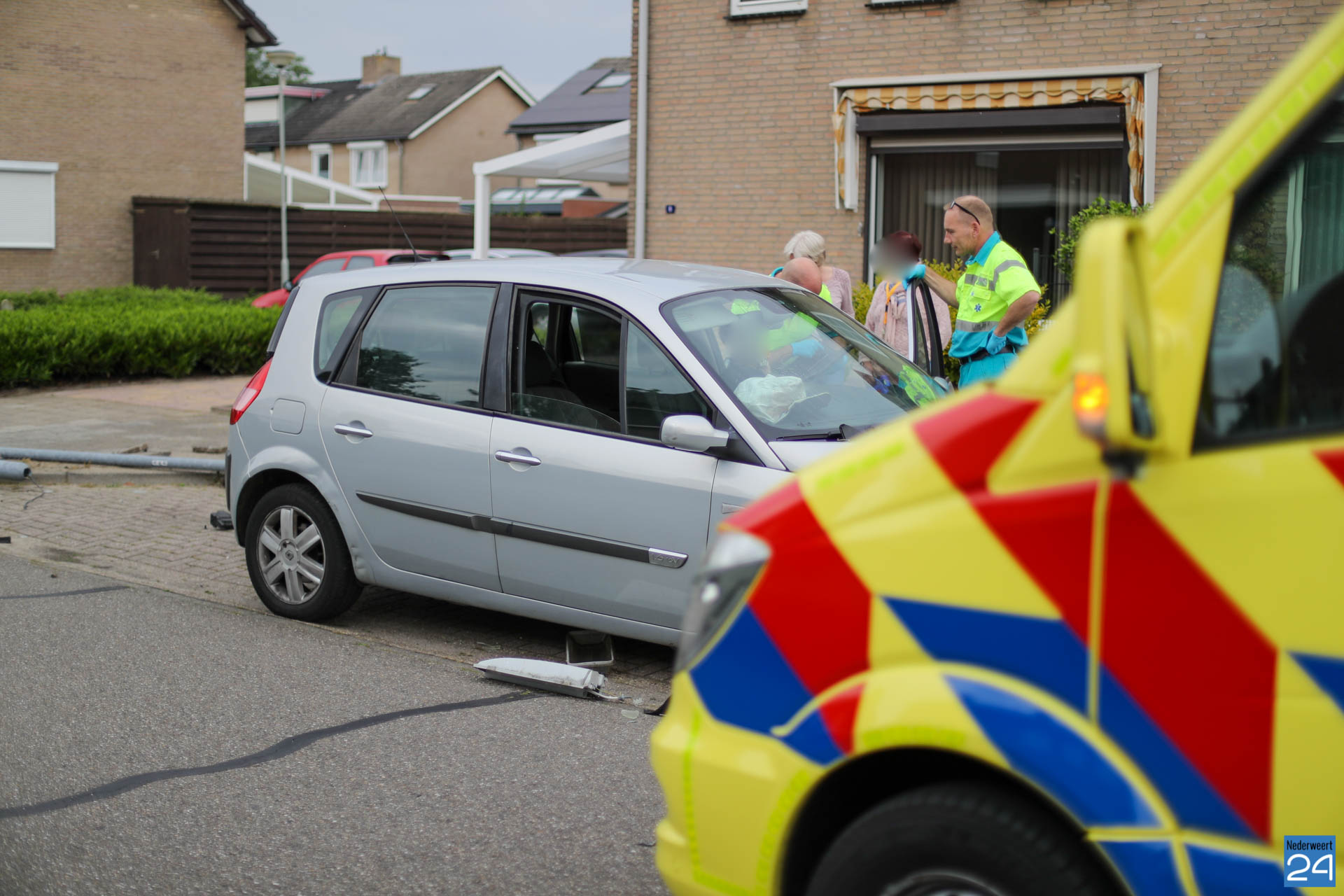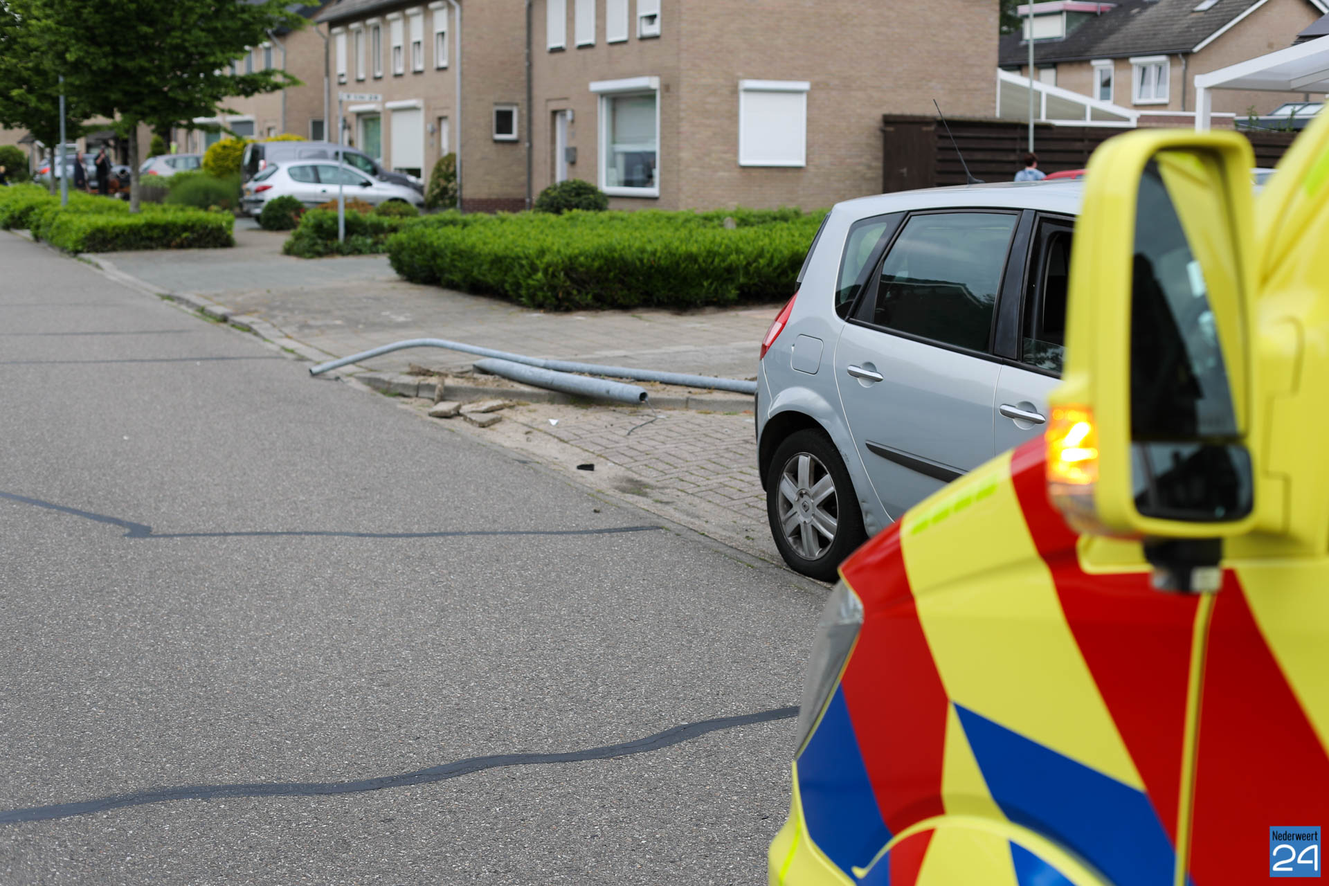 Rond kwart over zes hoorde buurtbewoners een flinke klap. Toen ze buiten gingen kijken zagen ze dat een grijze auto een lantaarnpaal plat had gereden. De bestuurder heeft door onbekende oorzaak de lantaarnpaal, links van de weg, helemaal uit de grond gereden.