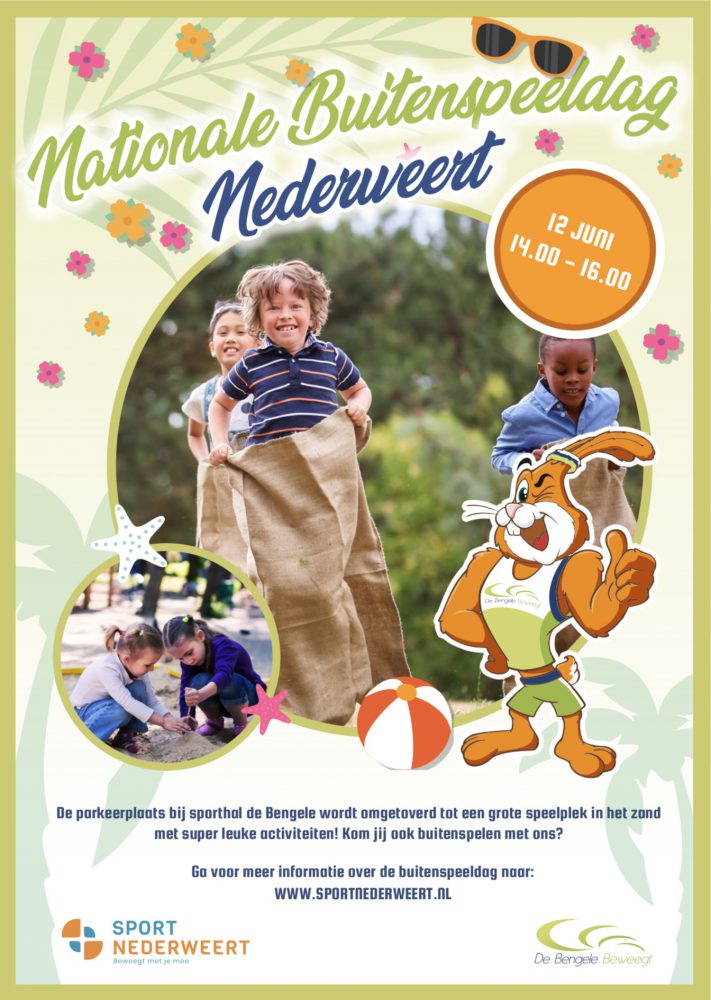 De Nationale Buitenspeeldag is hét moment om lekker buiten te spelen. Jaarlijks worden straten afgezet en worden verschillende plekken in Nederland omgetoverd tot speelplek. Ook in Nederweert. Sport Nederweert en de Bengele Beweegt toveren de parkeerplaats van Sporthal de Bengele om tot één grote zandbak waar kinderen kunnen spelen en kunnen meedoen aan allerlei supertoffe activiteiten. Van zaklopen, verspringen en reuze jenga tot aan het bouwen van zandkastelen.