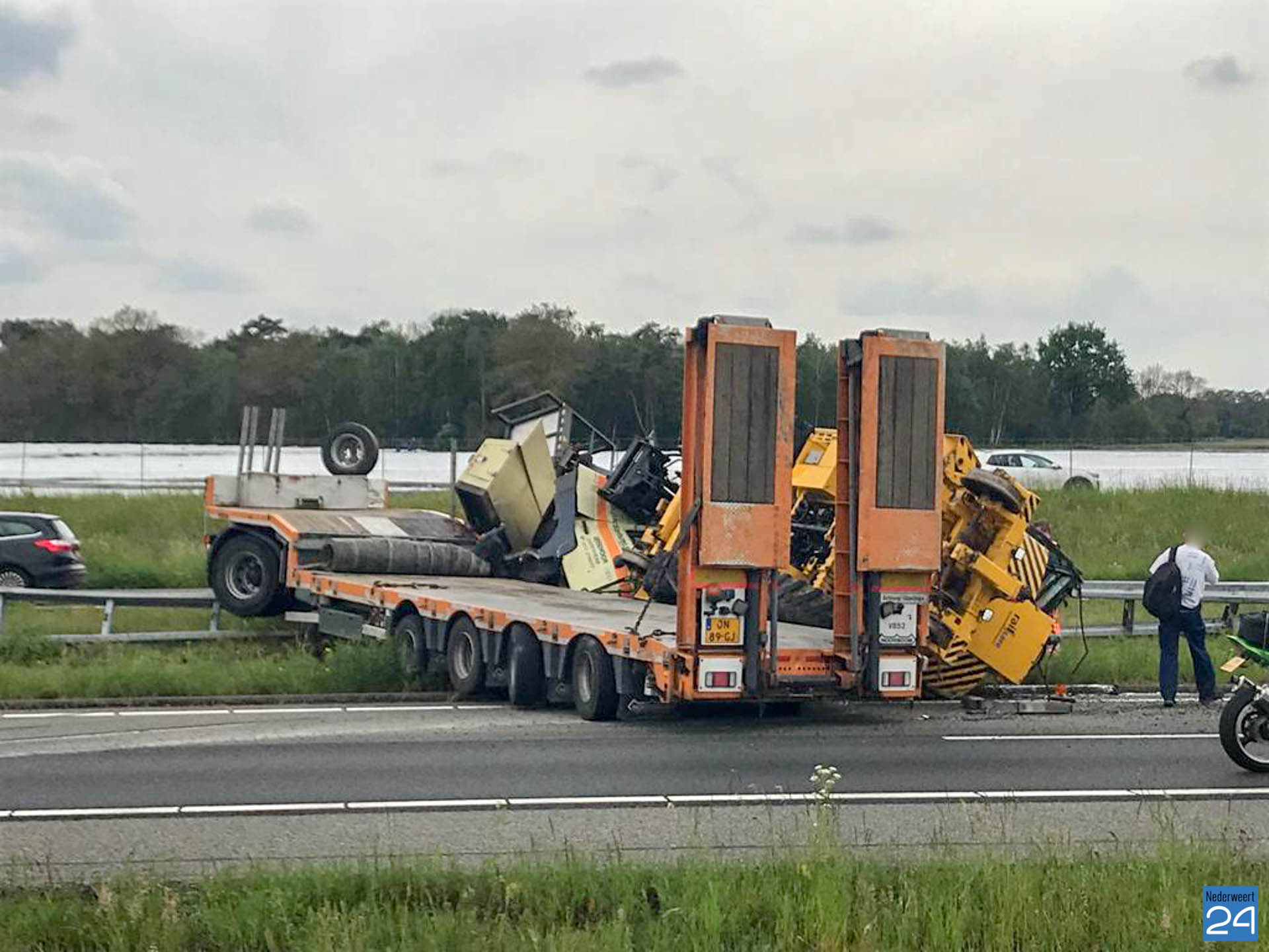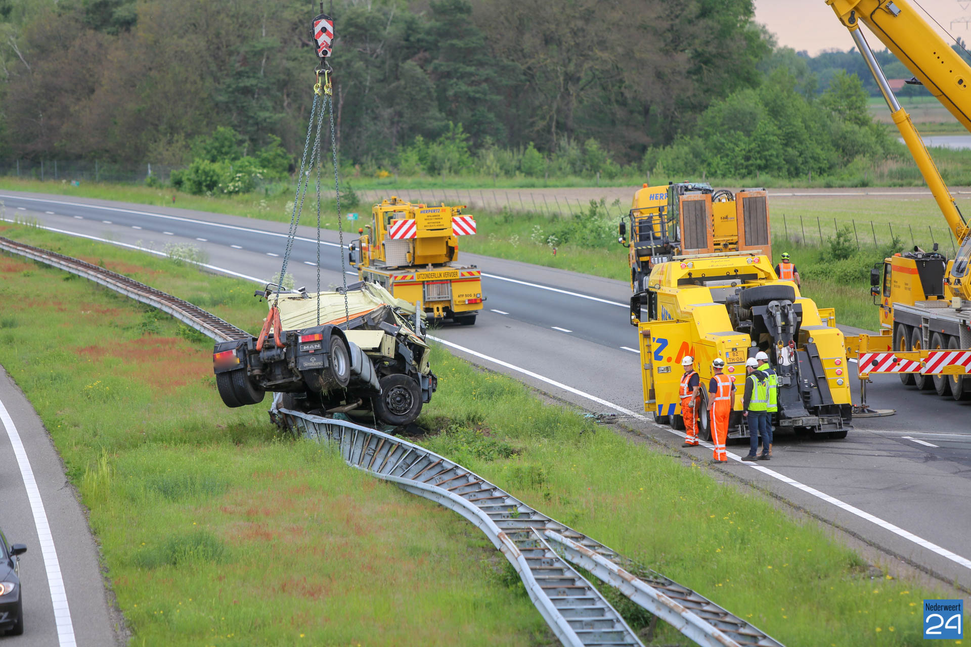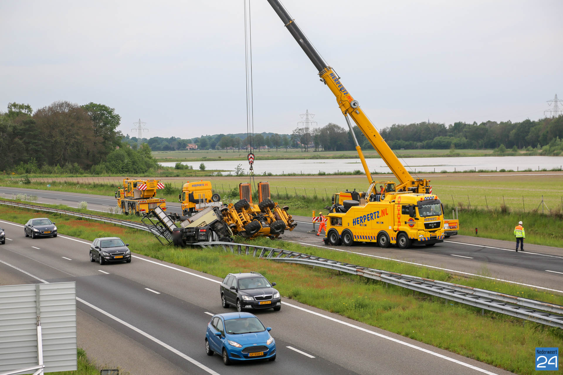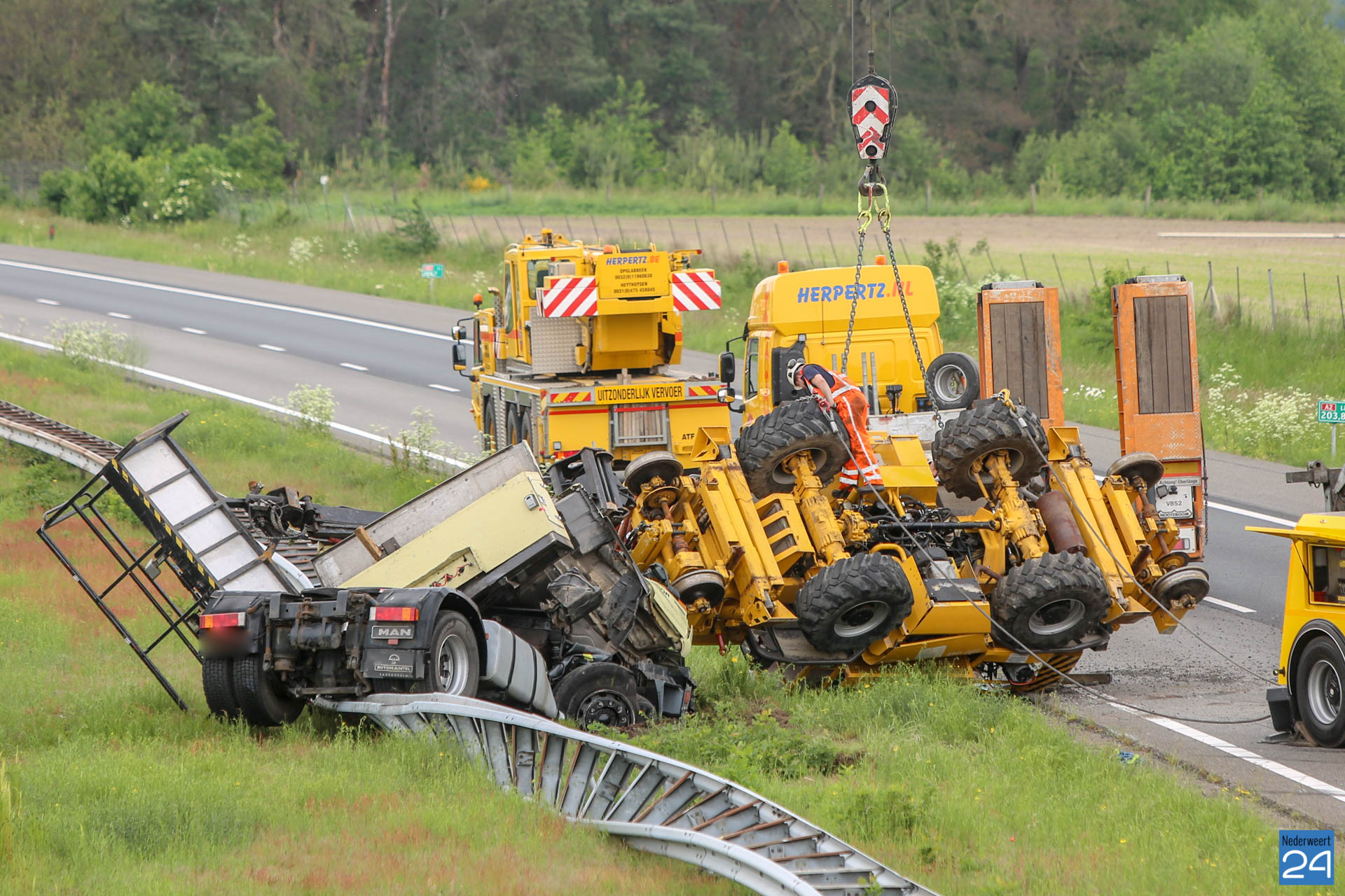 In de rijrichting van Kelpen-Oler naar Nederweert is maandag een vrachtwagen gekanteld en op de zijkant in de middenberm terecht gekomen. De vrachtwagen was geladen met een hoogwerker welke ook gekanteld is. De chauffeur raakte niet gewond.