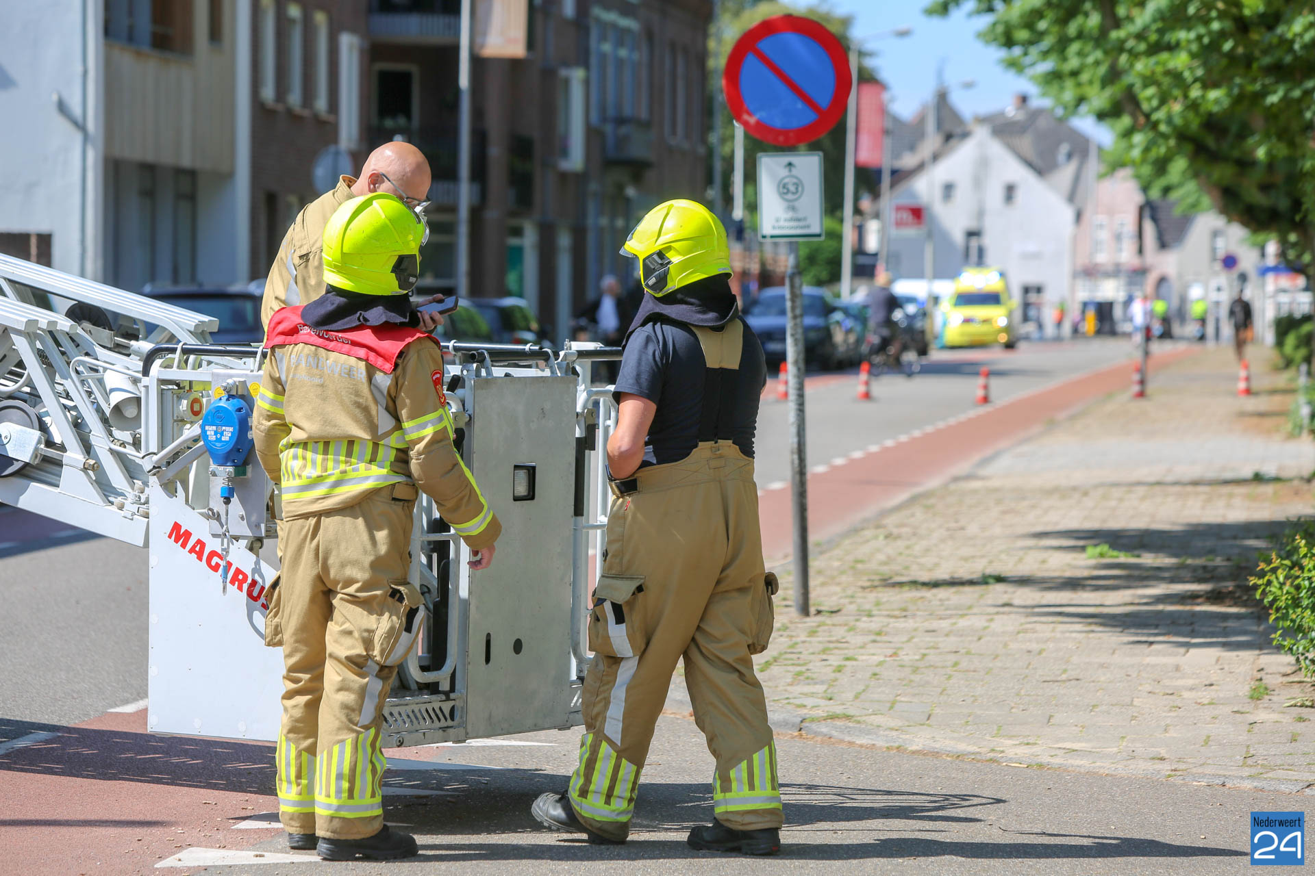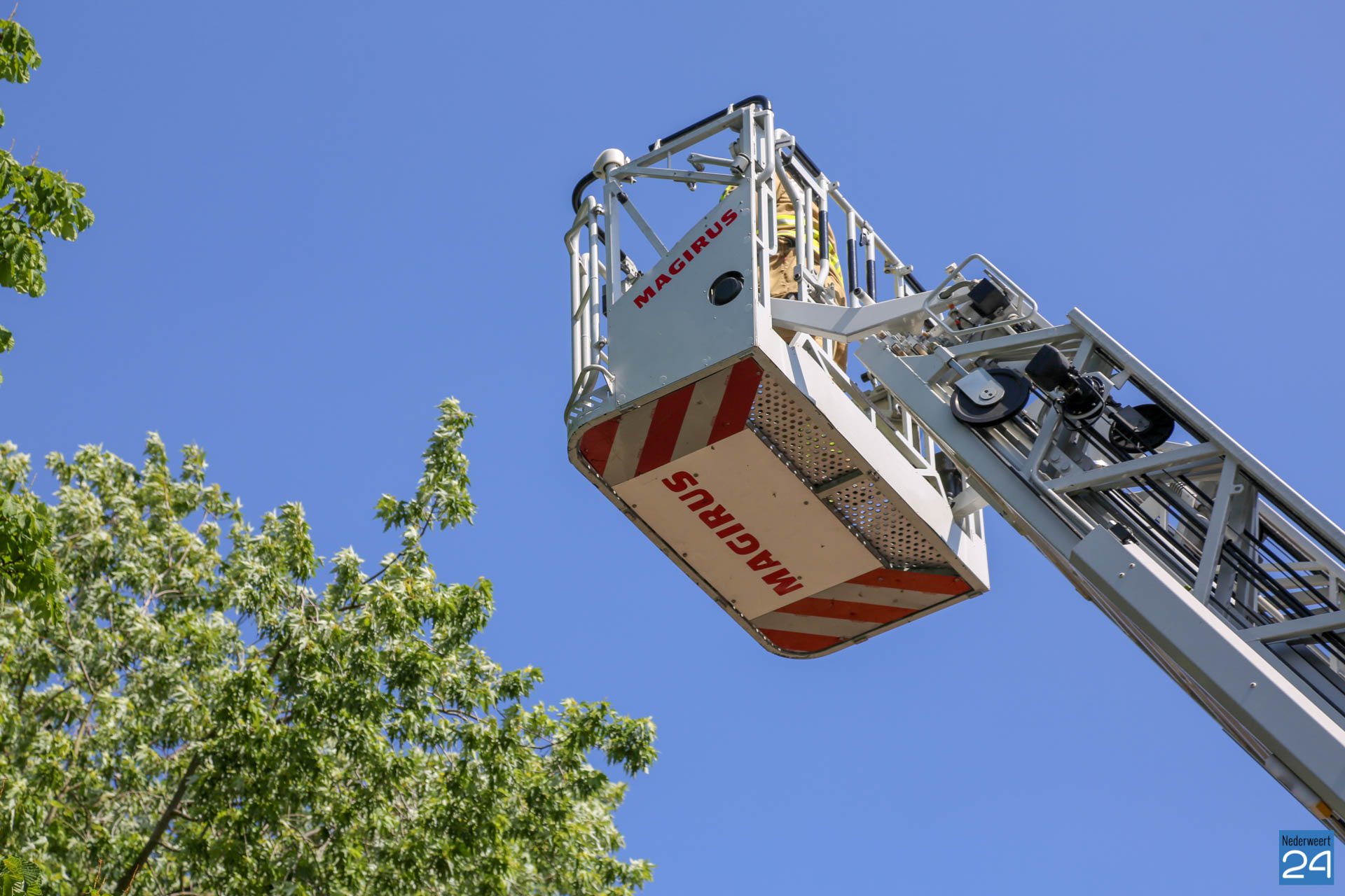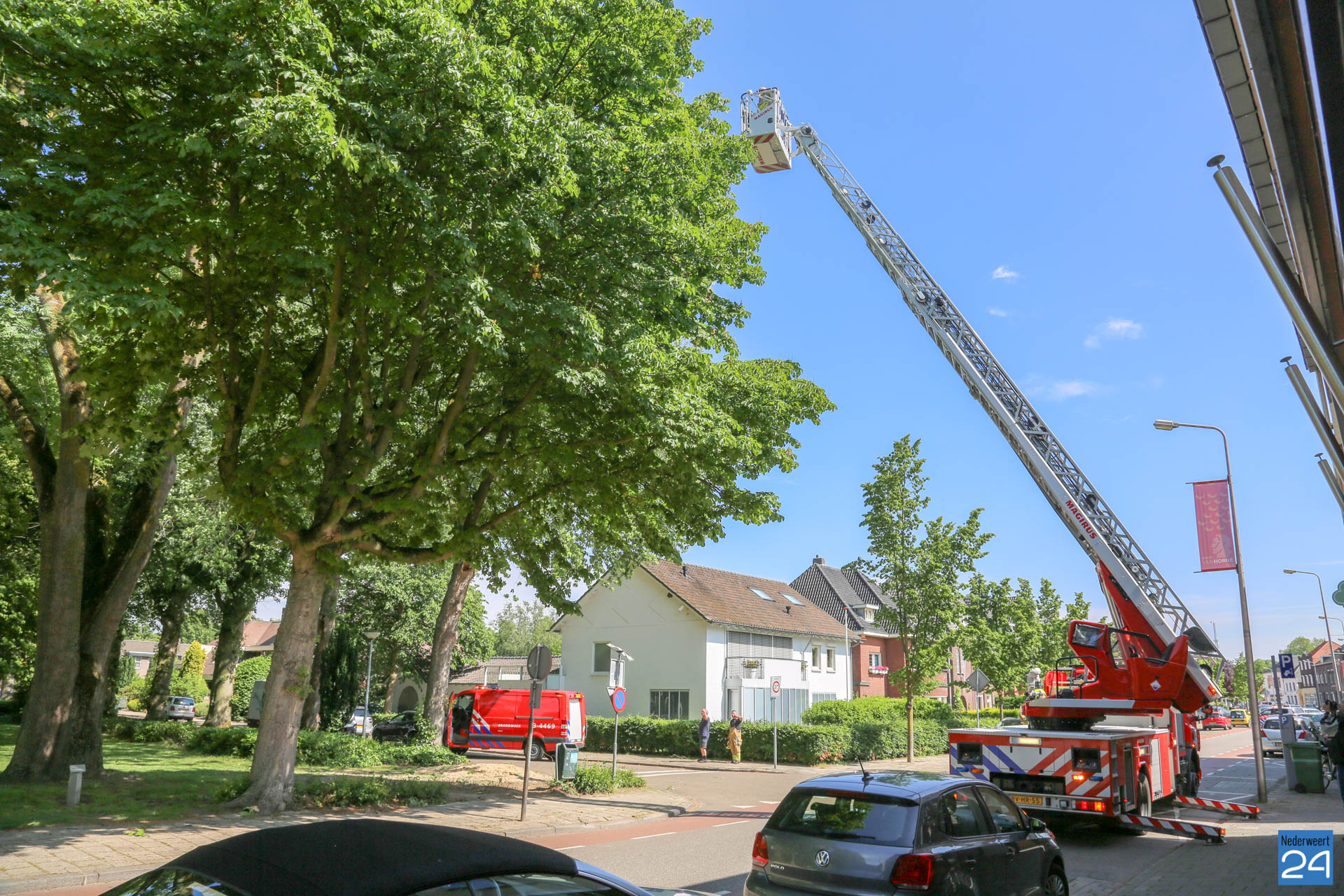 De brandweer inspecteerde met behulp van de ladderwagen een boom waar de takken op 15 meter hoogte los zouden hangen. Na een inspectie werd duidelijk dat er geen gevaarlijke situatie was omdat de takken los hingen.
