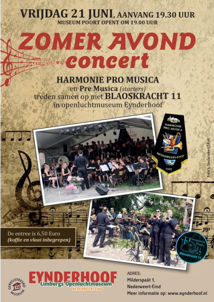 Op vrijdag 21 juni heeft harmonie Pro Musica weer haar jaarlijkse zomerconcert in Openluchtmuseum Eynderhoof. Elk jaar sluit bij dit concert een gastvereniging aan en dat is dit jaar niemand minder dan Blaoskracht 11! Een prachtige samenwerking tussen twee Eindse muziekverenigingen! En wat dacht je van de solisten Björn Wiermans en Sanne Heuijerjans!