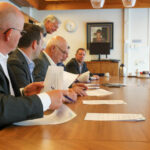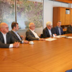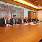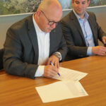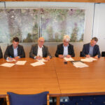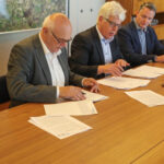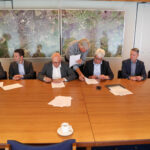 Foto: Onderschrift: Wethouder Martijn van den Heuvel (gemeente Weert, 2e links), burgemeester Henk Evers (gemeente Nederweert, 3e links) ondertekenen samen met bestuurders van de fondsen en de stichting de uitvoeringsafspraken.