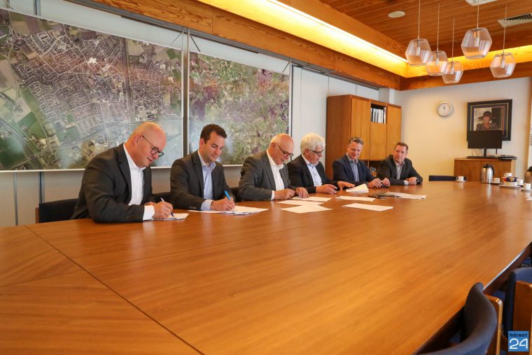 Foto: Onderschrift: Wethouder Martijn van den Heuvel (gemeente Weert, 2e links), burgemeester Henk Evers (gemeente Nederweert, 3e links) ondertekenen samen met bestuurders van de fondsen en de stichting de uitvoeringsafspraken.