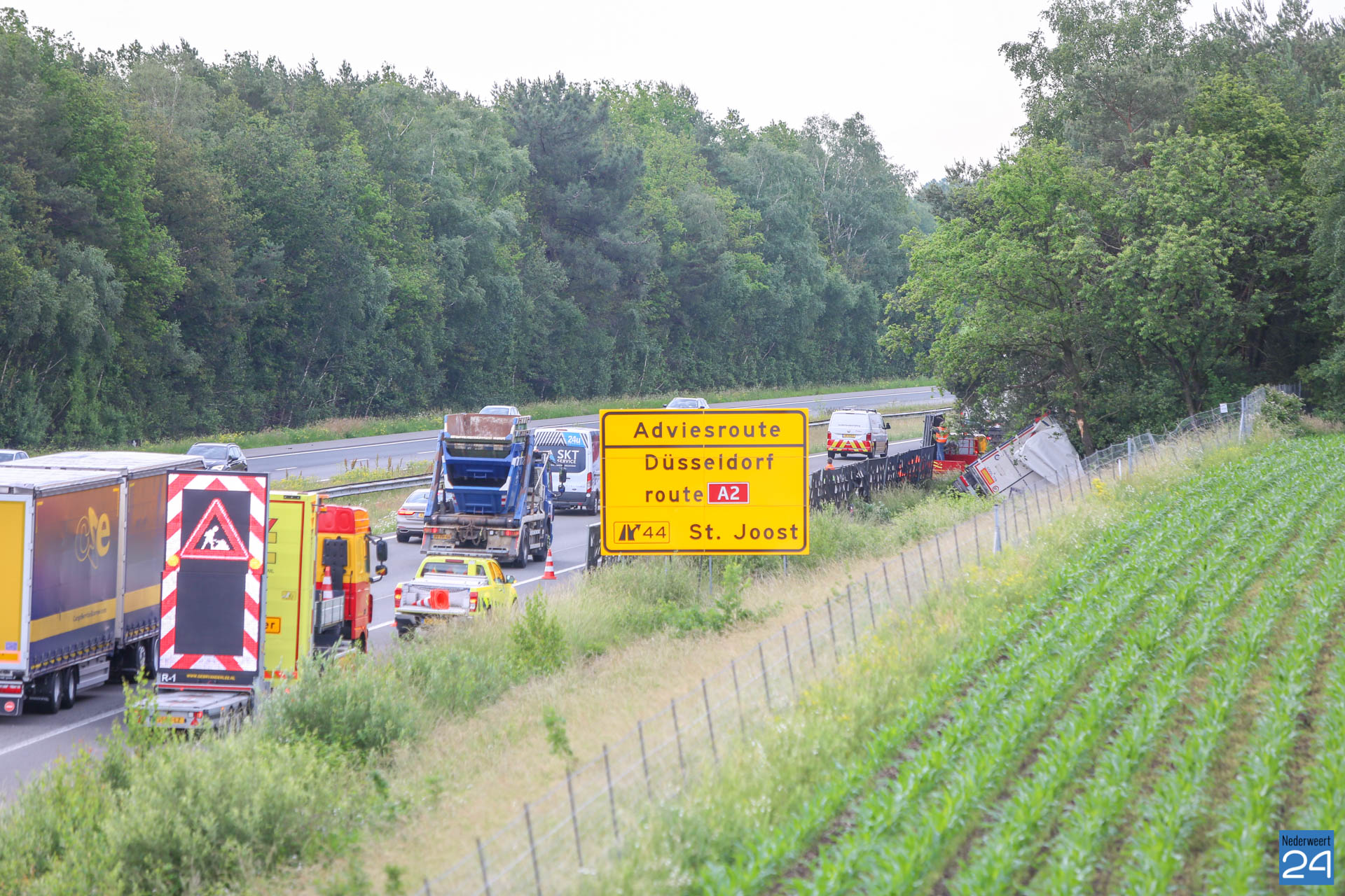 Een vrachtwagen geladen met afvalproducten is vrijdagmorgen op zijn zijkant in de berm naast de A2 bij Weert terecht gekomen. Het eenzijdige ongeval gebeurde vlakbij het viaduct van de Schoordijk in Nederweert.