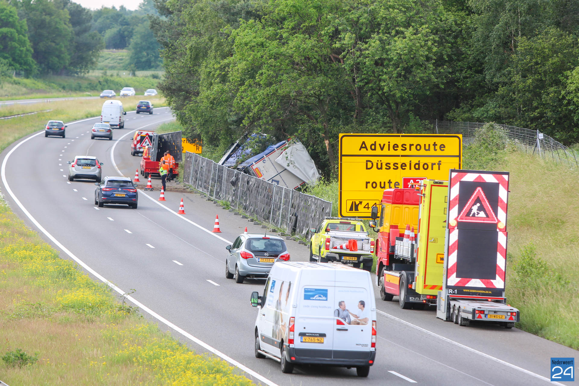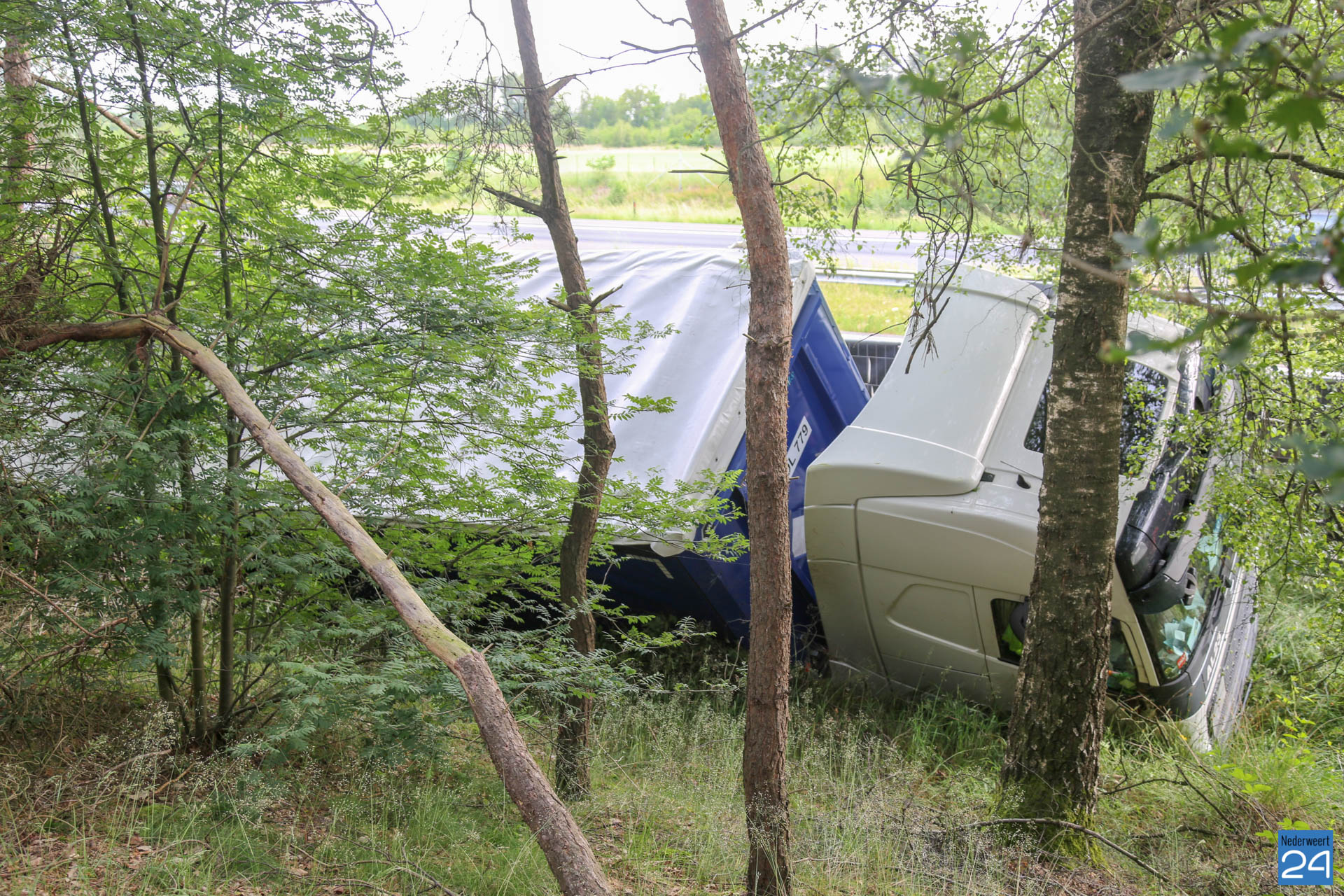 De vrachtwagen zal op een later moment worden weggehaald. Het verkeer heeft weinig last door het ongeval.