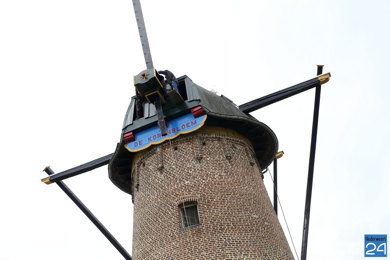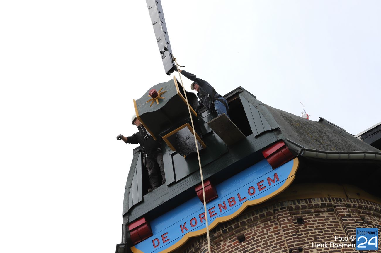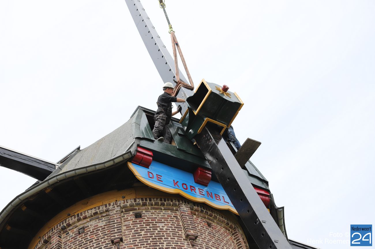 De wieken van molen De Korenbloem aan de Korenbloemstraat in Ospel zijn donderdagochtend weer teruggeplaatst. Groot onderhoud aan de molen was de oorzaak voor het tijdelijk verwijderen van de wieken.