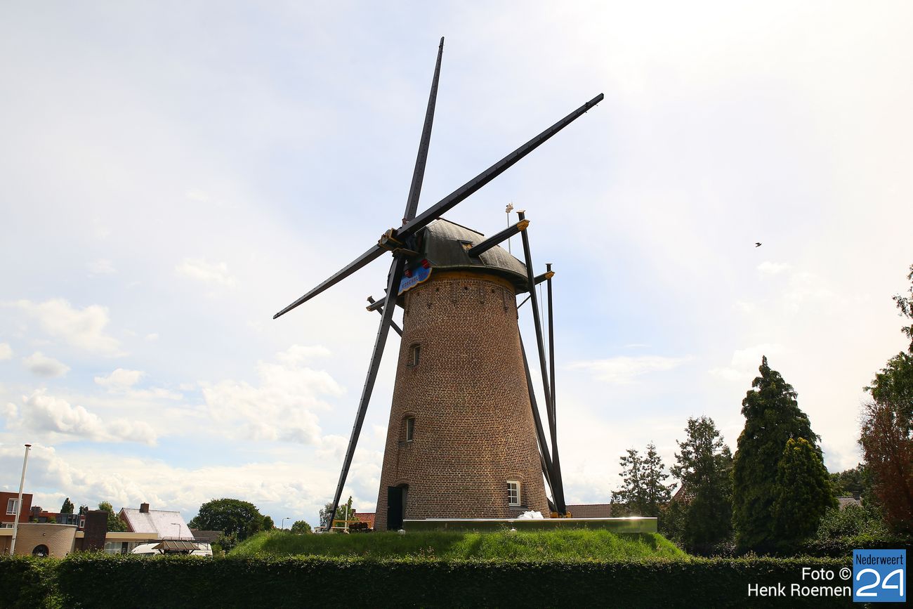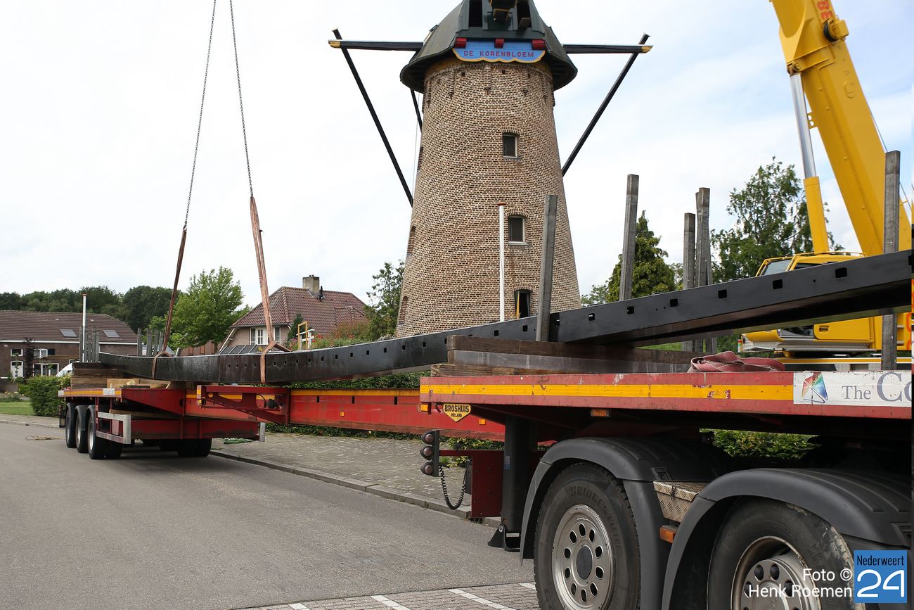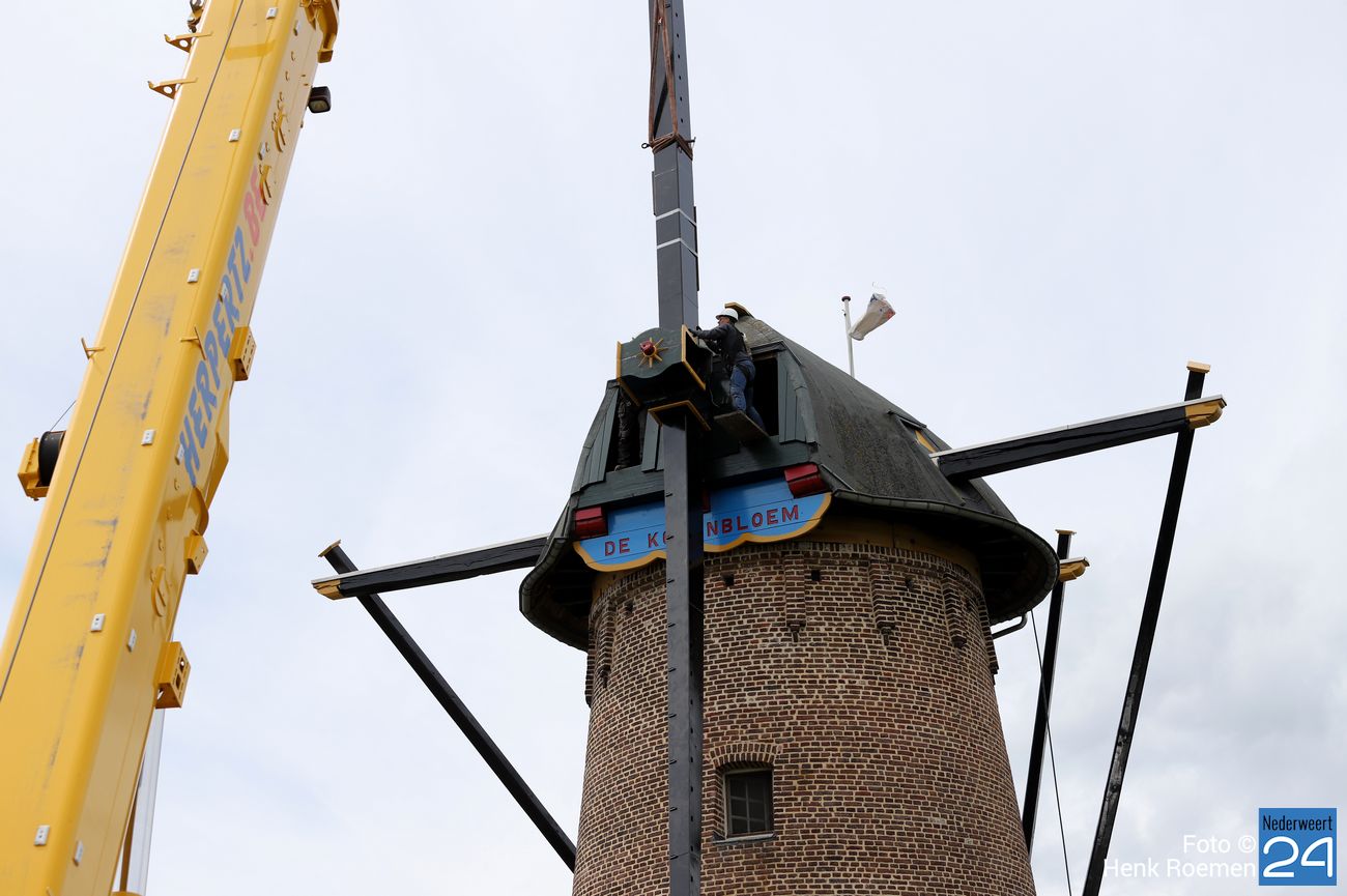 De wieken van molen De Korenbloem aan de Korenbloemstraat in Ospel zijn donderdagochtend weer teruggeplaatst. Groot onderhoud aan de molen was de oorzaak voor het tijdelijk verwijderen van de wieken.