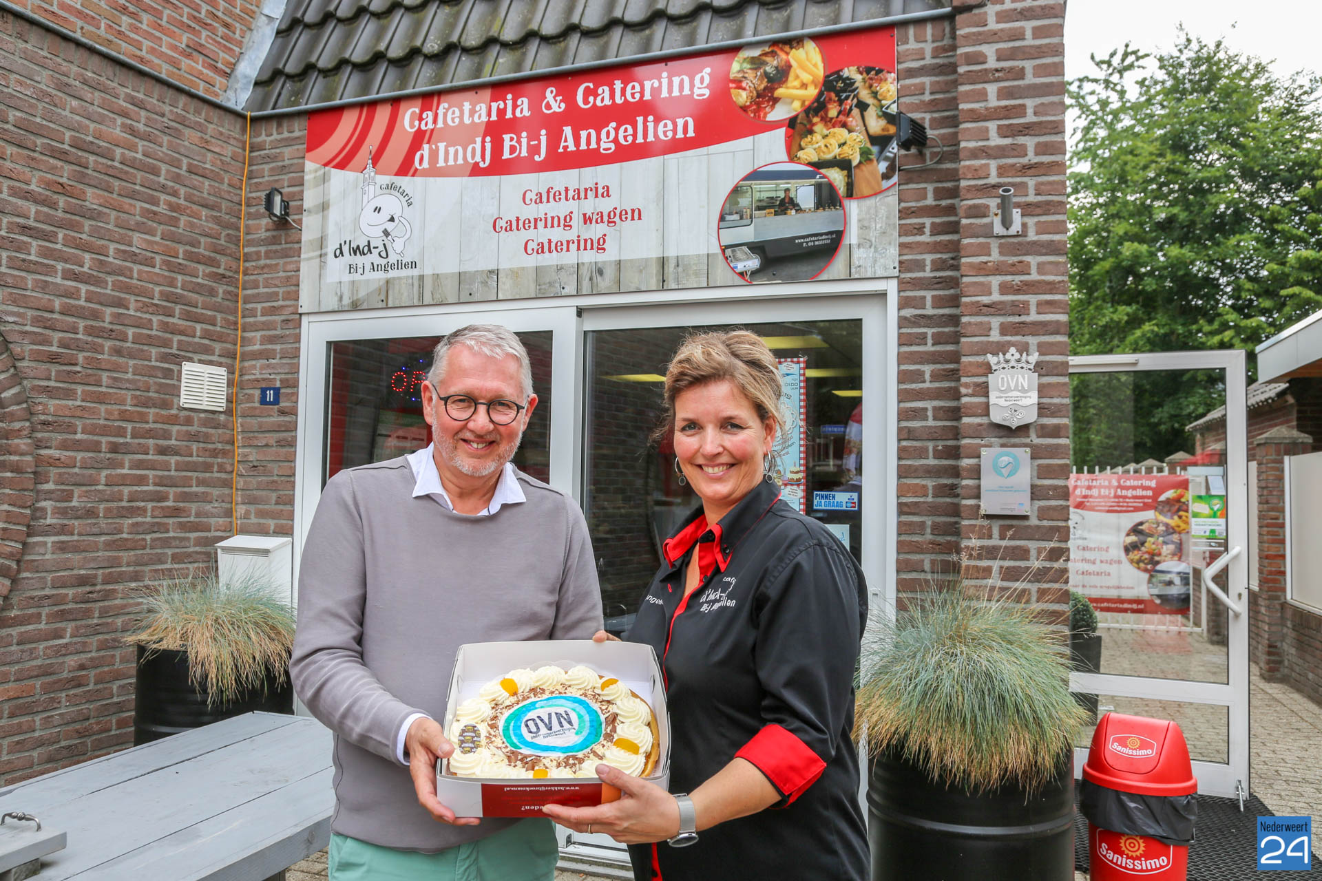 Cafetaria & Catering d’Indj Bi-j Angelien uit Nederweert-Eind is het jongste lid van de Ondernemers Vereniging Nederweert (OVN). Speciaal voor deze gelegenheid overhandigde Henk Knapen namens de OVN een taart van bakkerij Broekmans aan.