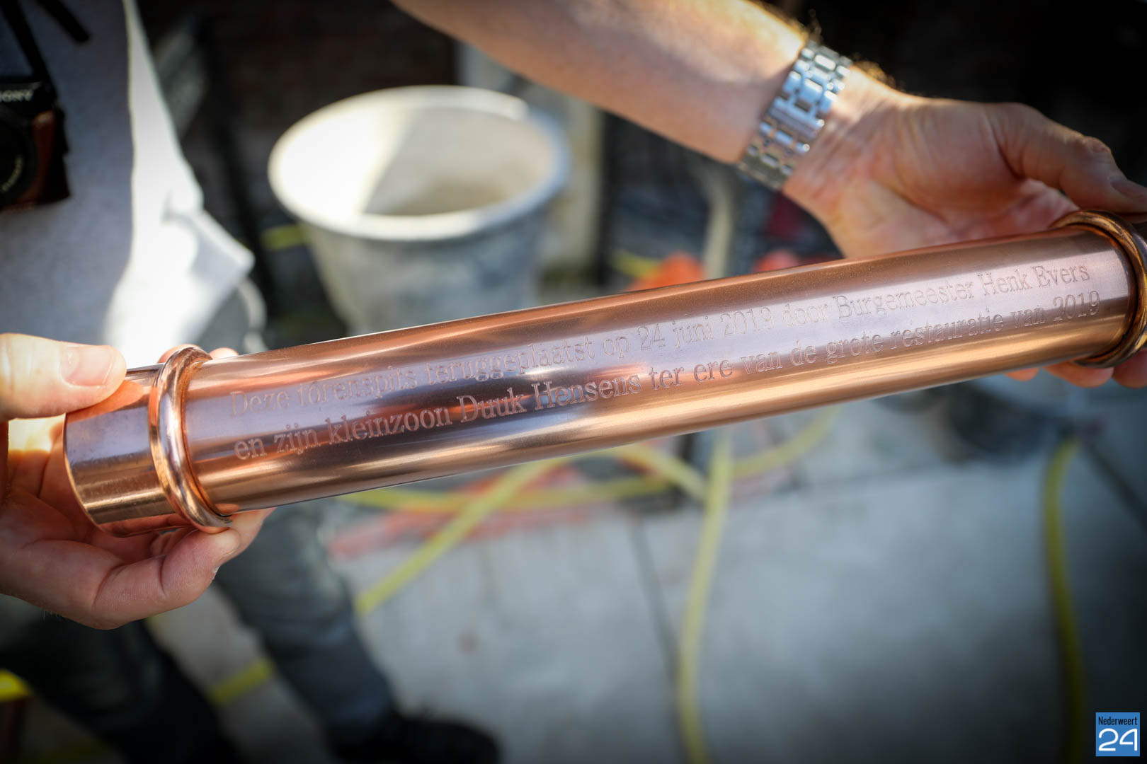 Burgemeester Evers: “In de koperen buis zitten een brief en de laatste vijf columns die ik dit jaar schreef in het Weekblad voor Nederweert. Samen met de brief en een usb-stick waarop Duuk vertelt over zijn leven, geeft het een tijdsbeeld van wat ons thans in Nederweert bezighoudt. In mijn brief staat onder andere dat “ik hoop dat er bij volgende generaties ook sprake is van vrede, welvaart en geluk. In 2019 kunnen we vaststellen dat we wat dat betreft aan de goede kant van de wereld wonen”.