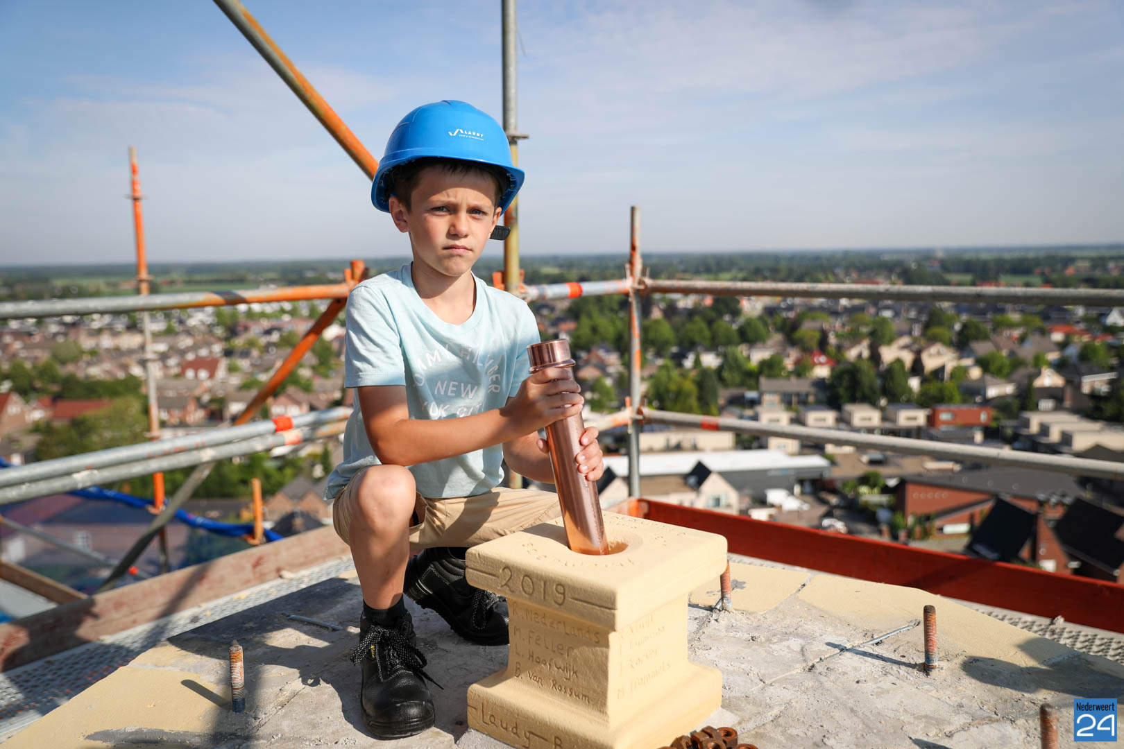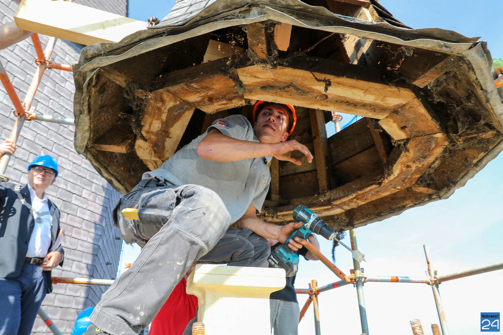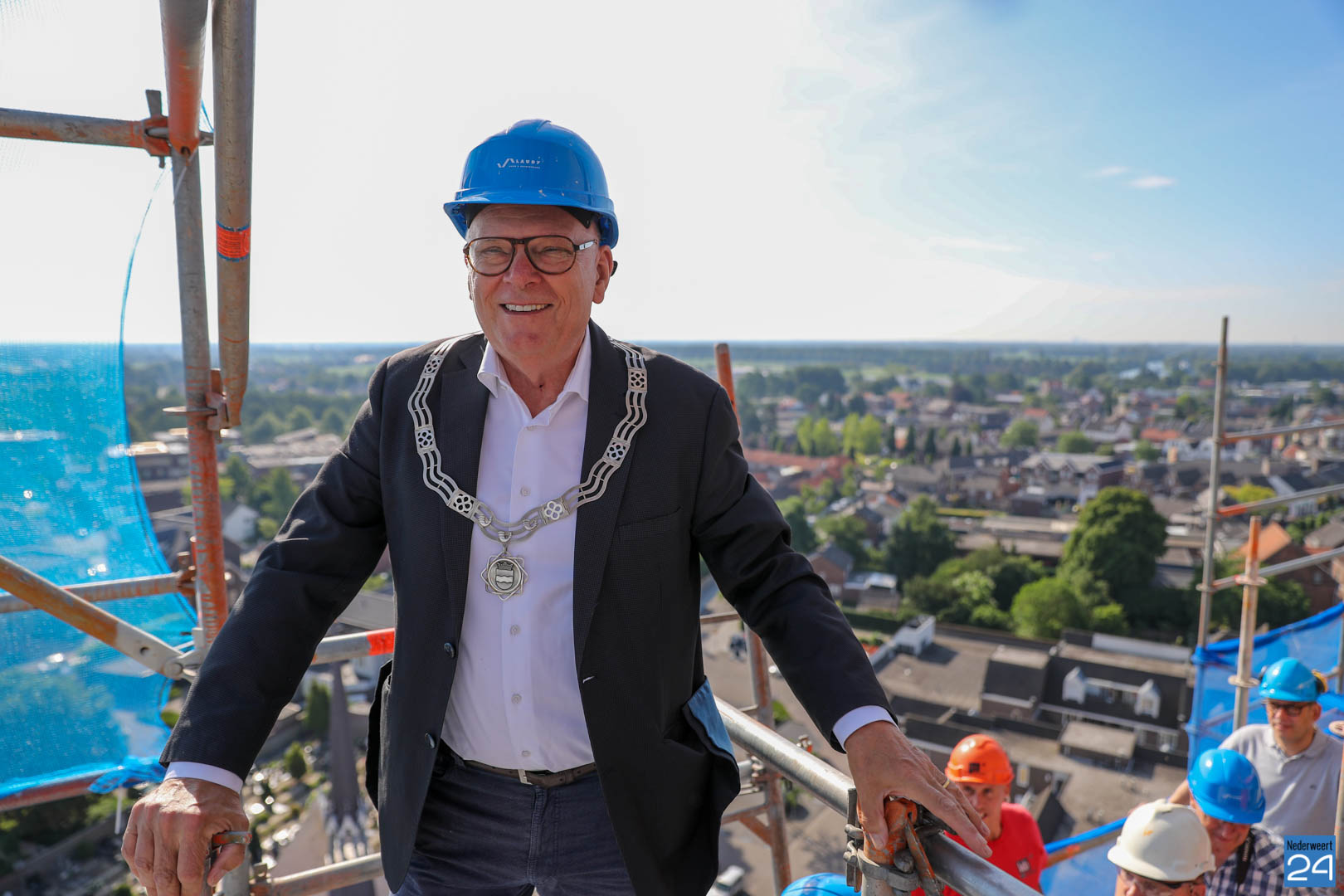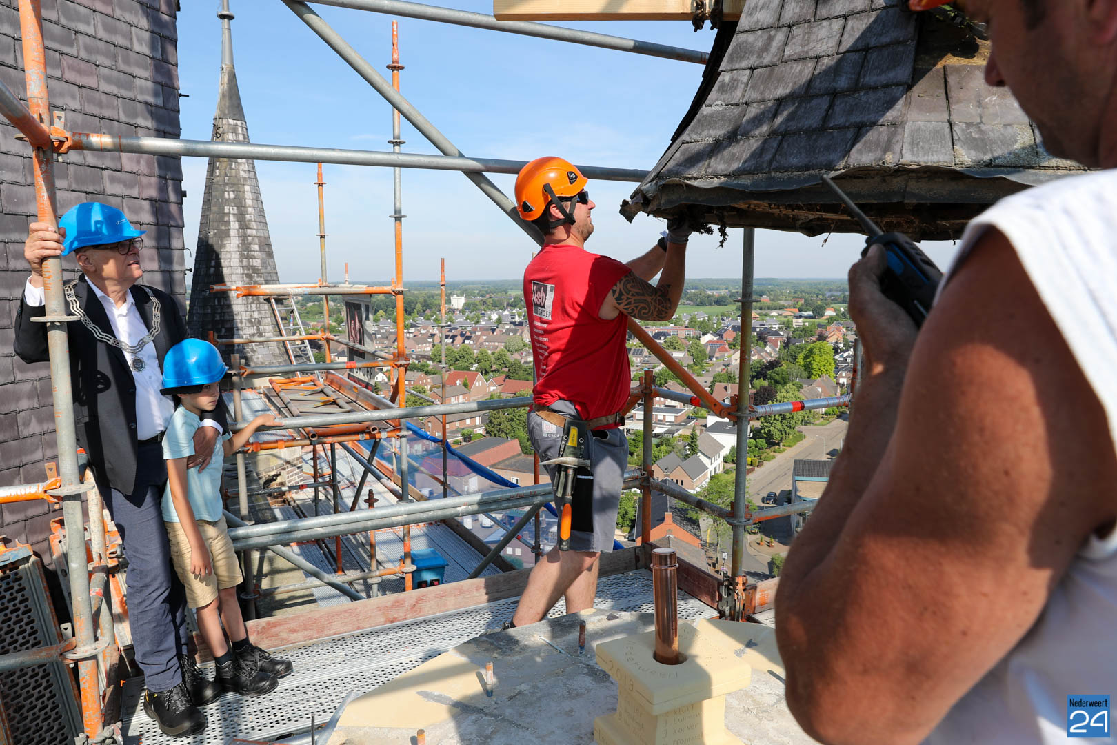 Sinds februari staat de Lambertustoren in Nederweert in de steigers voor een grote renovatie. Vanaf dat moment wordt er door aannemer Laudy ‘achter de schermen’ hard gewerkt. Een paar weken geleden werd de spits van een hoektorentje omlaag gehesen. Maandag werd het torentje terug op zijn plek gezet. Een bijzonder moment. Ook omdat burgemeester Evers en kleinzoon Duuk een zogenaamde tijdscapsule onder de hoekspits plaatsen met daarin een boodschap voor generaties die na ons komen.