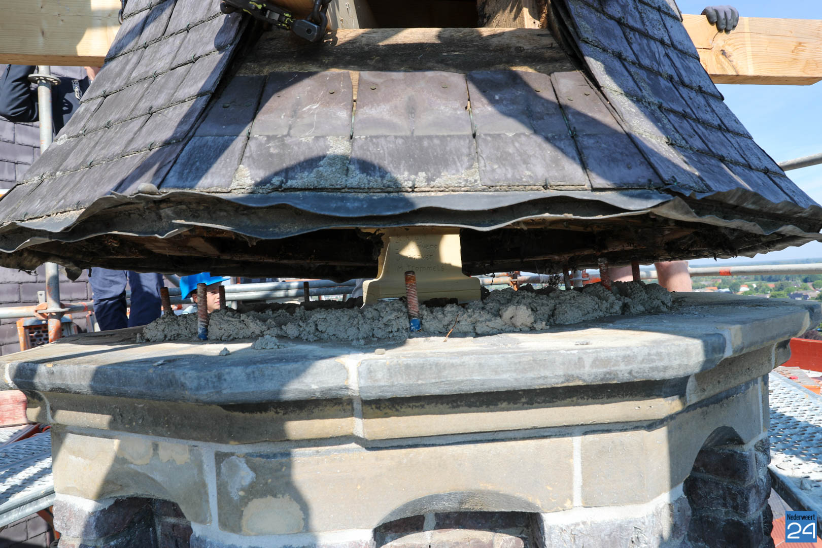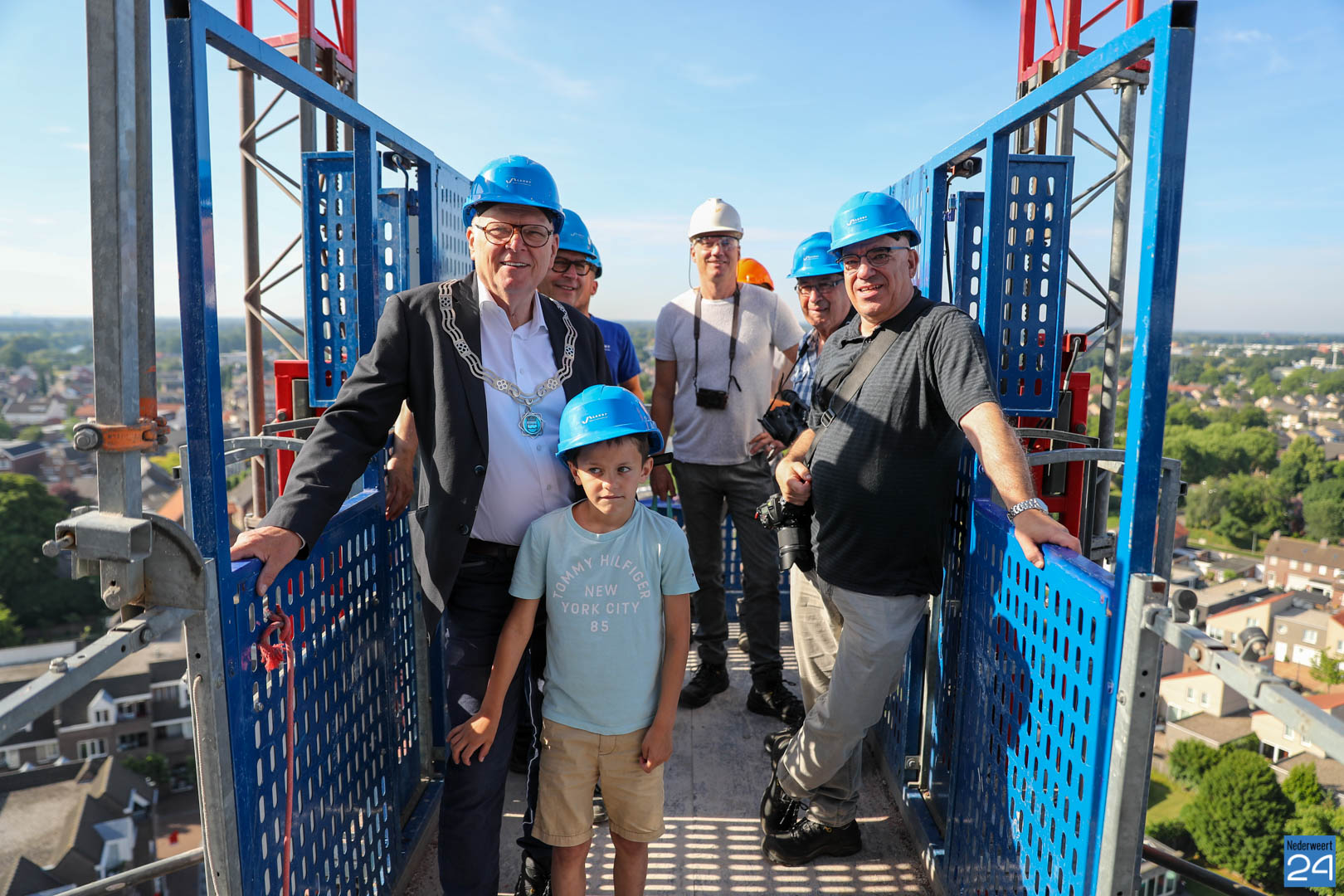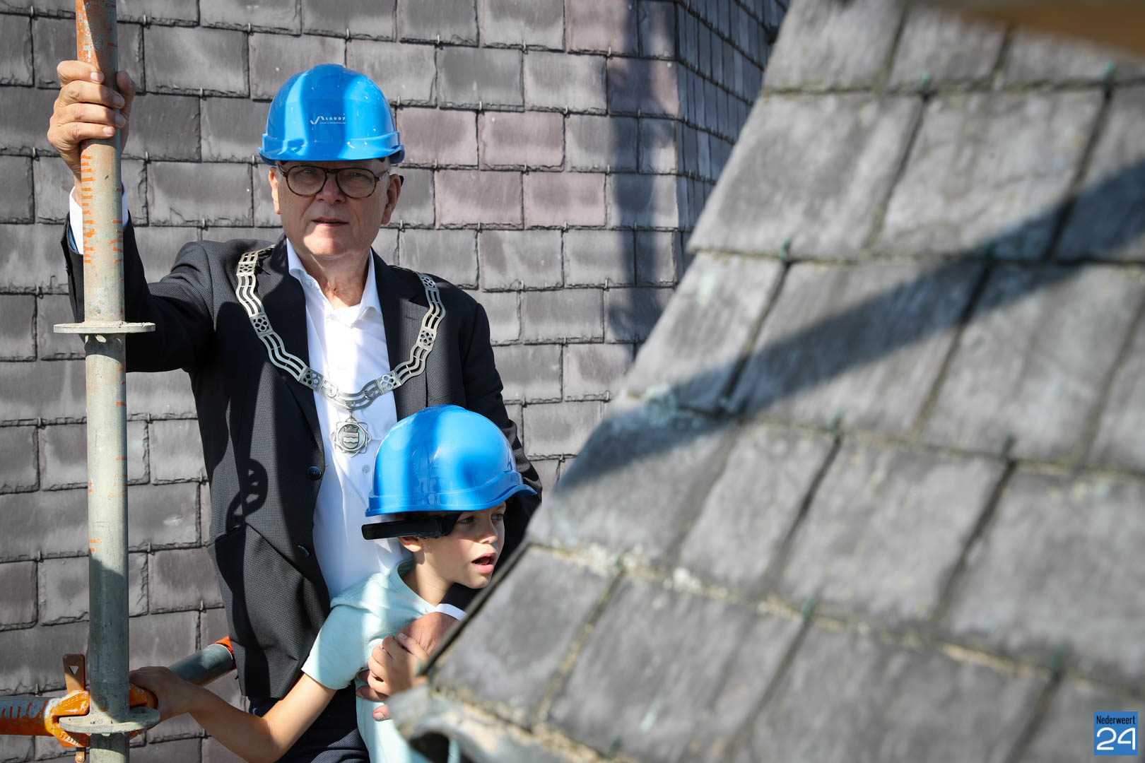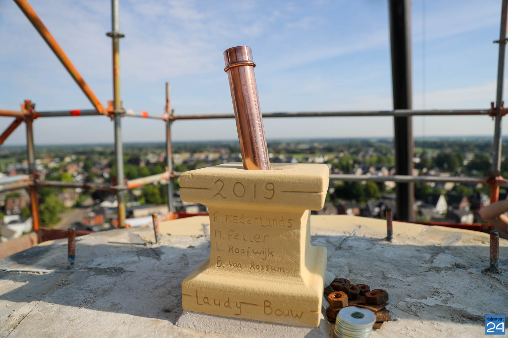 Sinds februari staat de Lambertustoren in Nederweert in de steigers voor een grote renovatie. Vanaf dat moment wordt er door aannemer Laudy ‘achter de schermen’ hard gewerkt. Een paar weken geleden werd de spits van een hoektorentje omlaag gehesen. Maandag werd het torentje terug op zijn plek gezet. Een bijzonder moment. Ook omdat burgemeester Evers en kleinzoon Duuk een zogenaamde tijdscapsule onder de hoekspits plaatsen met daarin een boodschap voor generaties die na ons komen.