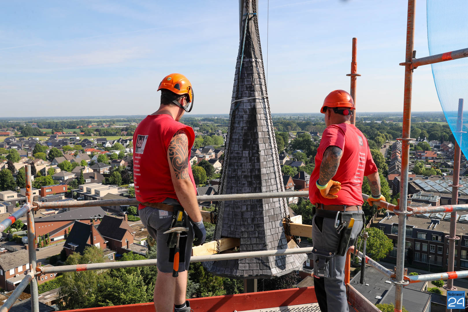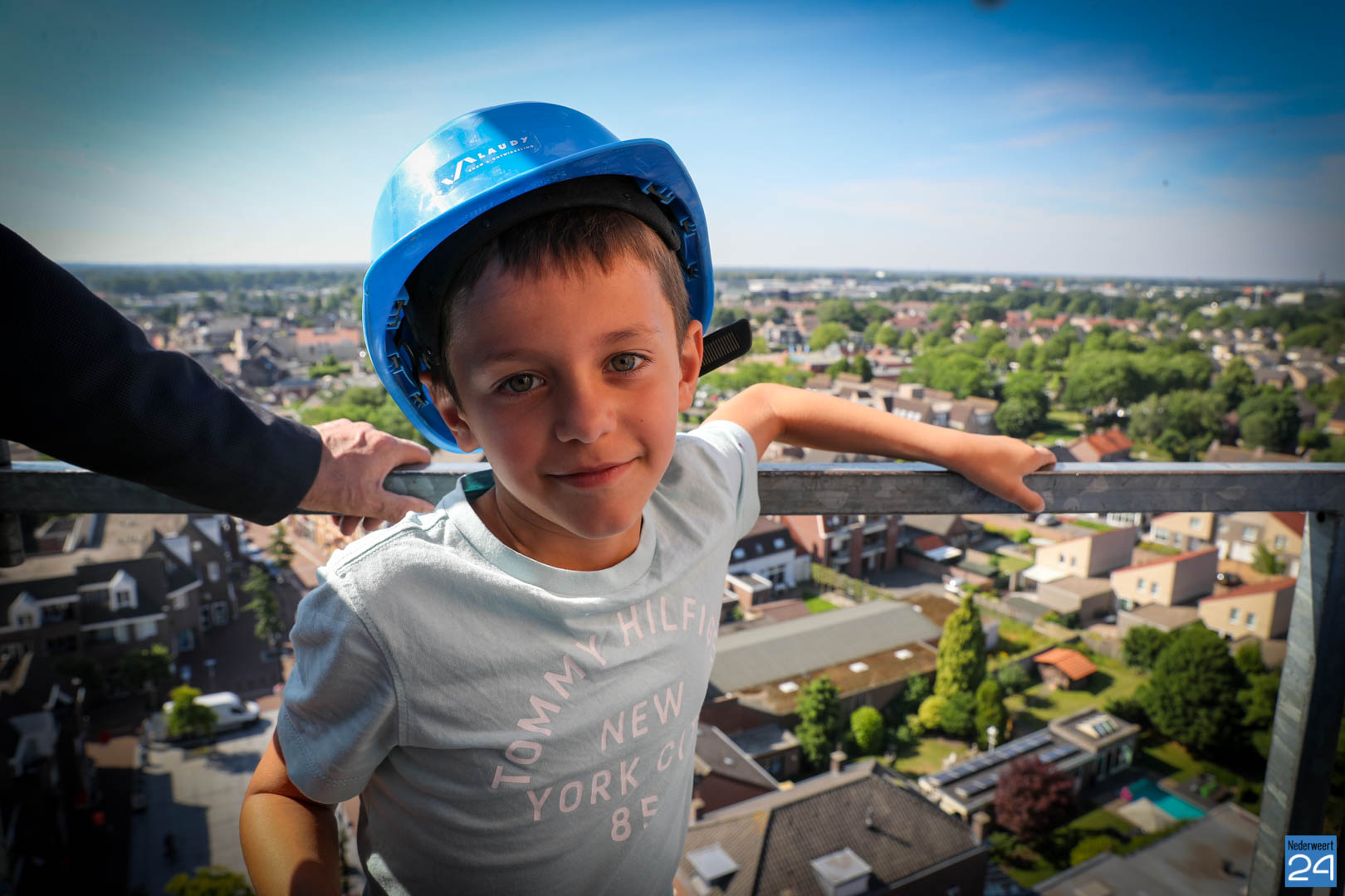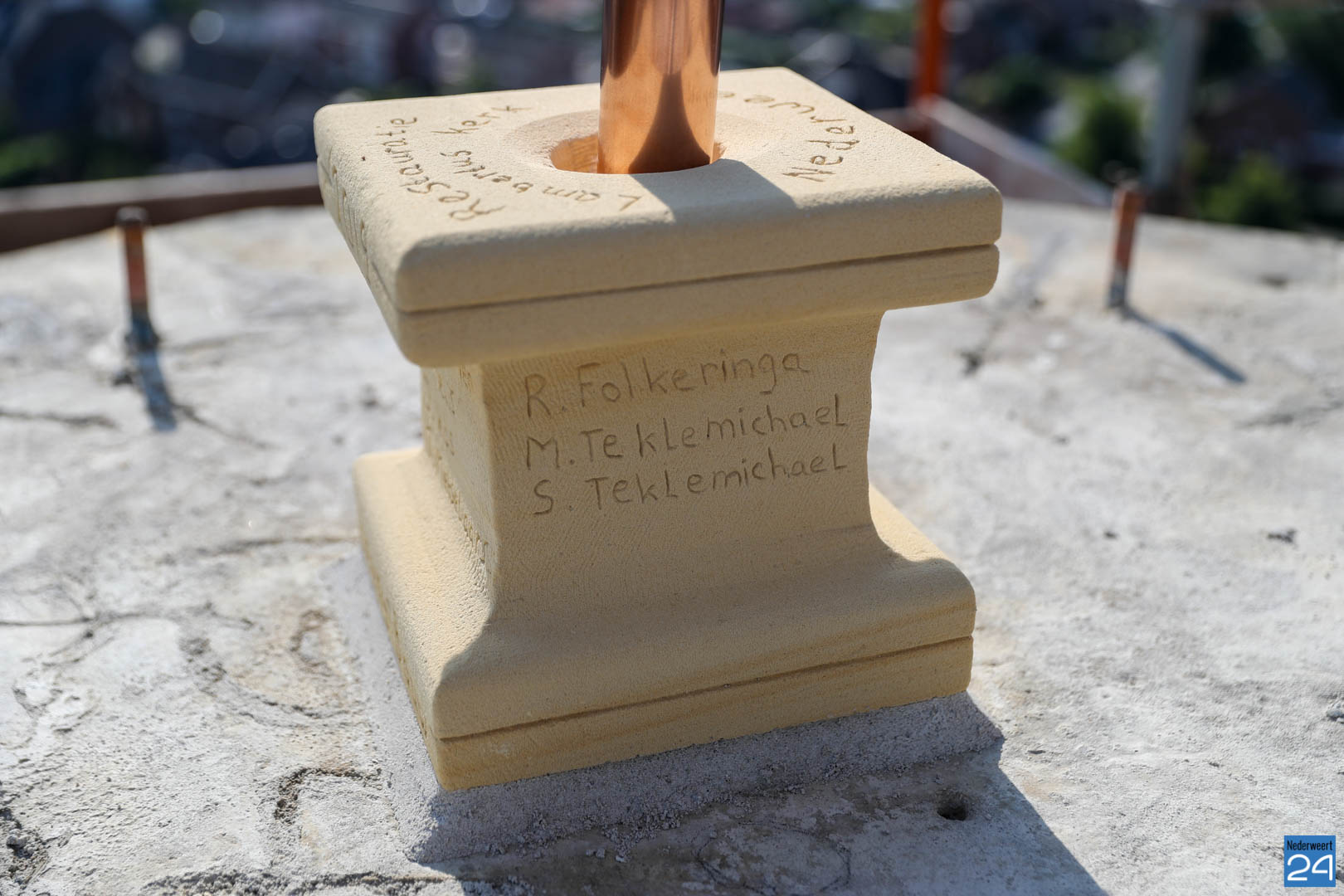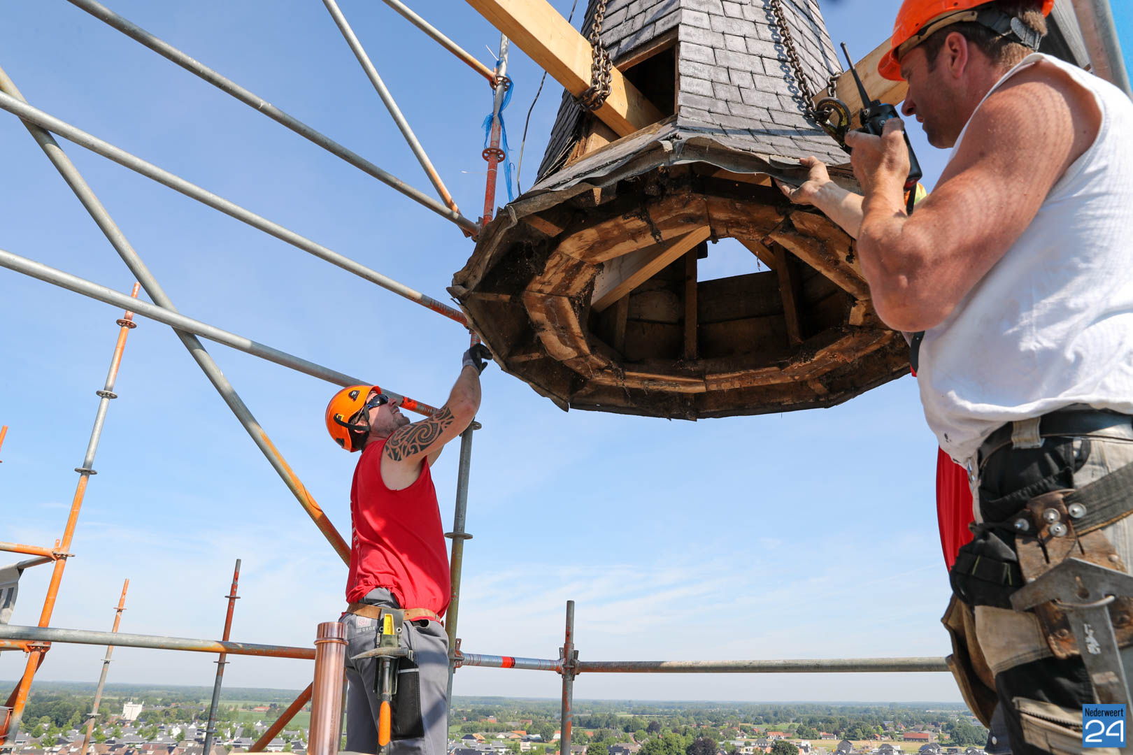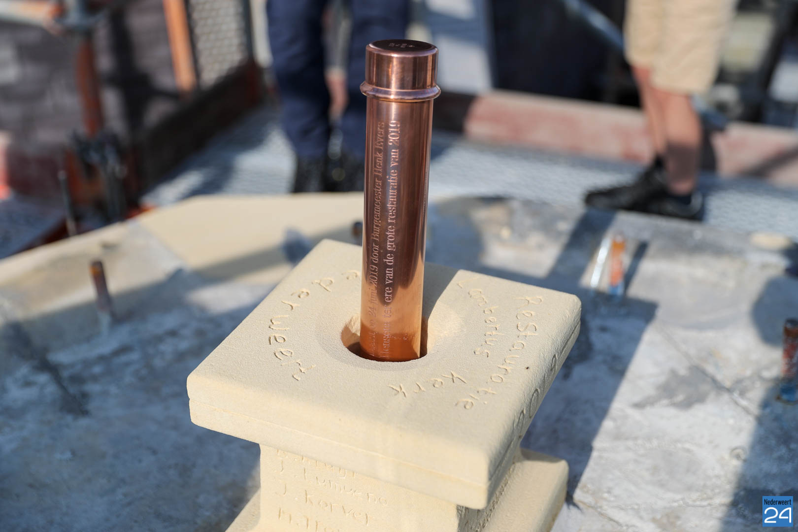 Sinds februari staat de Lambertustoren in Nederweert in de steigers voor een grote renovatie. Vanaf dat moment wordt er door aannemer Laudy ‘achter de schermen’ hard gewerkt. Een paar weken geleden werd de spits van een hoektorentje omlaag gehesen. Maandag werd het torentje terug op zijn plek gezet. Een bijzonder moment. Ook omdat burgemeester Evers en kleinzoon Duuk een zogenaamde tijdscapsule onder de hoekspits plaatsen met daarin een boodschap voor generaties die na ons komen.
