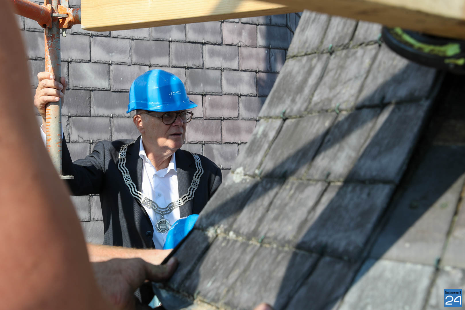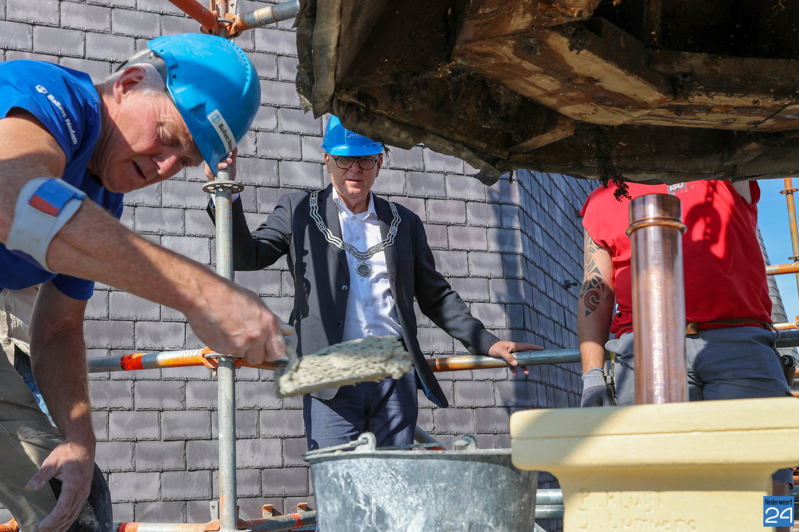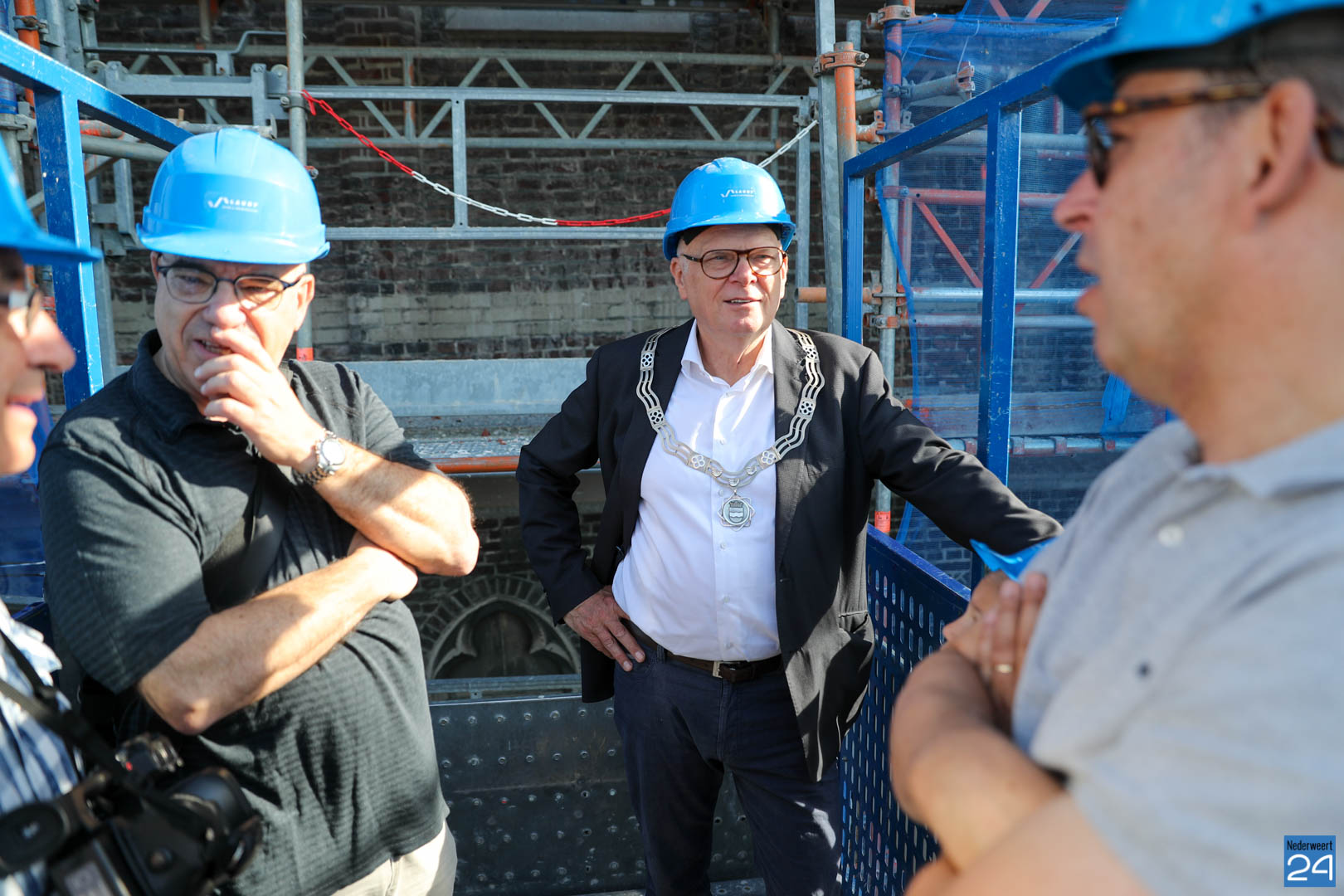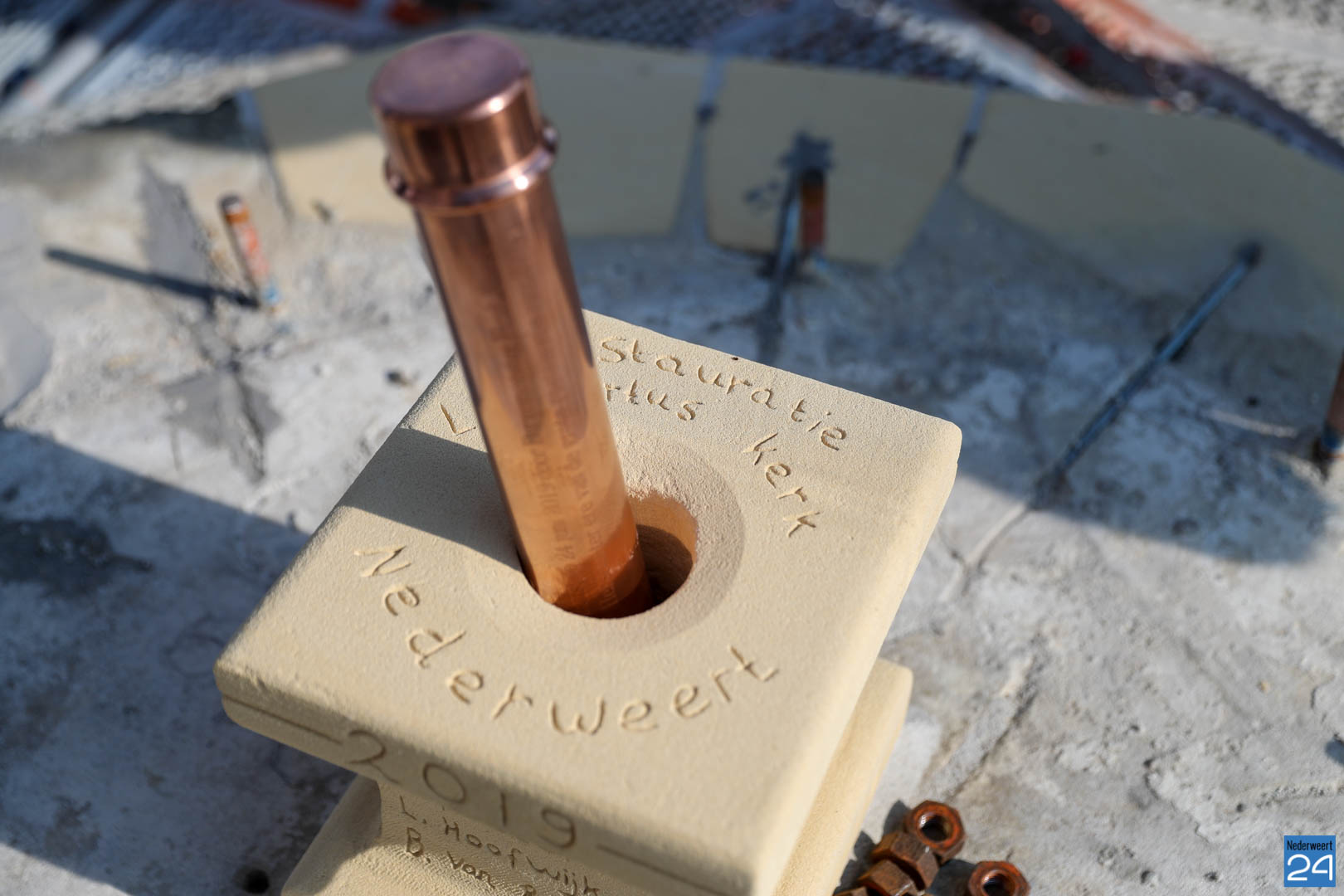Sinds februari staat de Lambertustoren in Nederweert in de steigers voor een grote renovatie. Vanaf dat moment wordt er door aannemer Laudy ‘achter de schermen’ hard gewerkt. Een paar weken geleden werd de spits van een hoektorentje omlaag gehesen. Maandag werd het torentje terug op zijn plek gezet. Een bijzonder moment. Ook omdat burgemeester Evers en kleinzoon Duuk een zogenaamde tijdscapsule onder de hoekspits plaatsen met daarin een boodschap voor generaties die na ons komen.