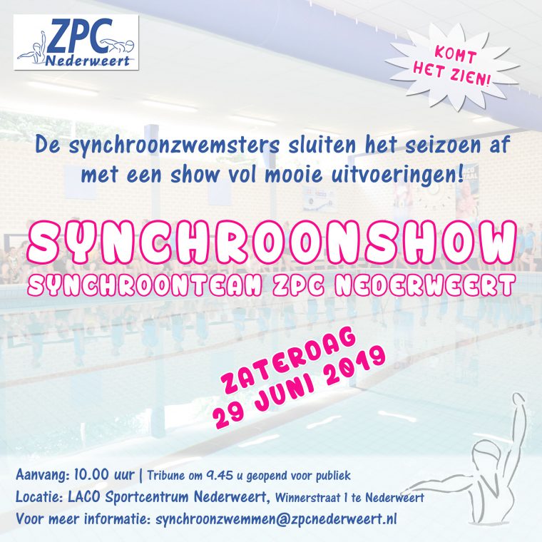 Met de zomervakantie voor de deur, is ook het synchroonzwemseizoen weer bijna ten einde. De synchroonzwemsters van ZPC Nederweert zullen dit seizoen nog één keer hun uitvoeringen zwemmen tijdens de jaarlijkse Synchroonshow. Een jaar van hard trainen heeft geweldige prestaties opgeleverd tijdens de wedstrijden. Naast de meer ervaren zwemsters, zal een grote groep jonge zwemsters deelnemen aan de Synchroonshow. Ook zij zijn er klaar voor om te laten zien wat zij kunnen!