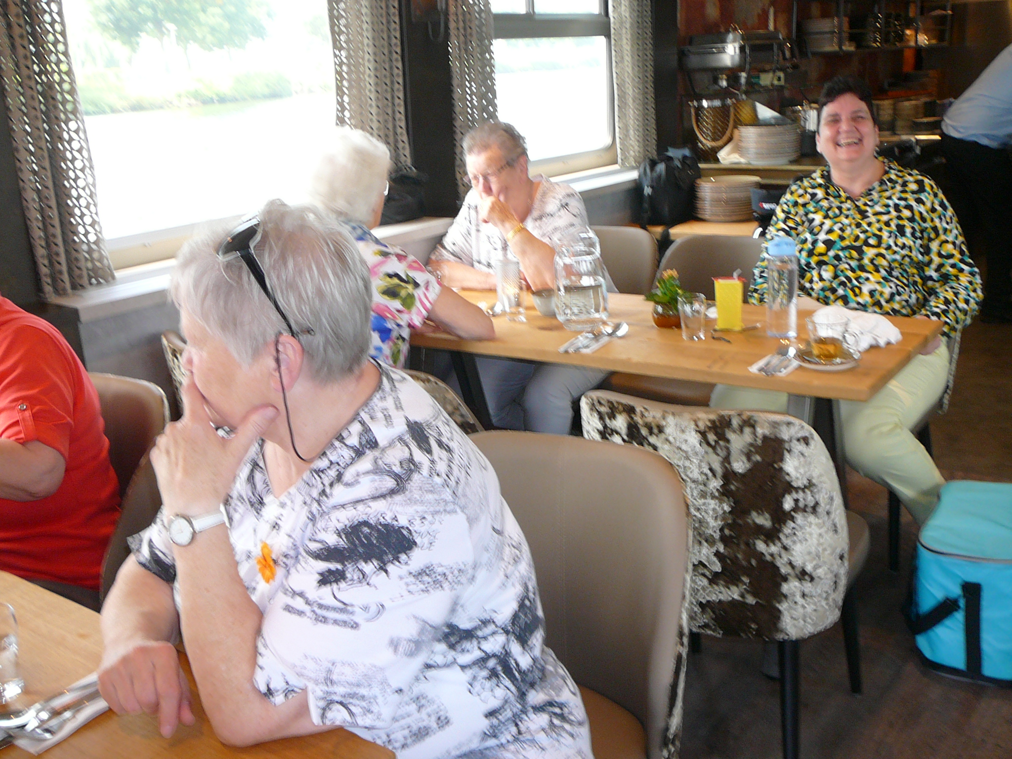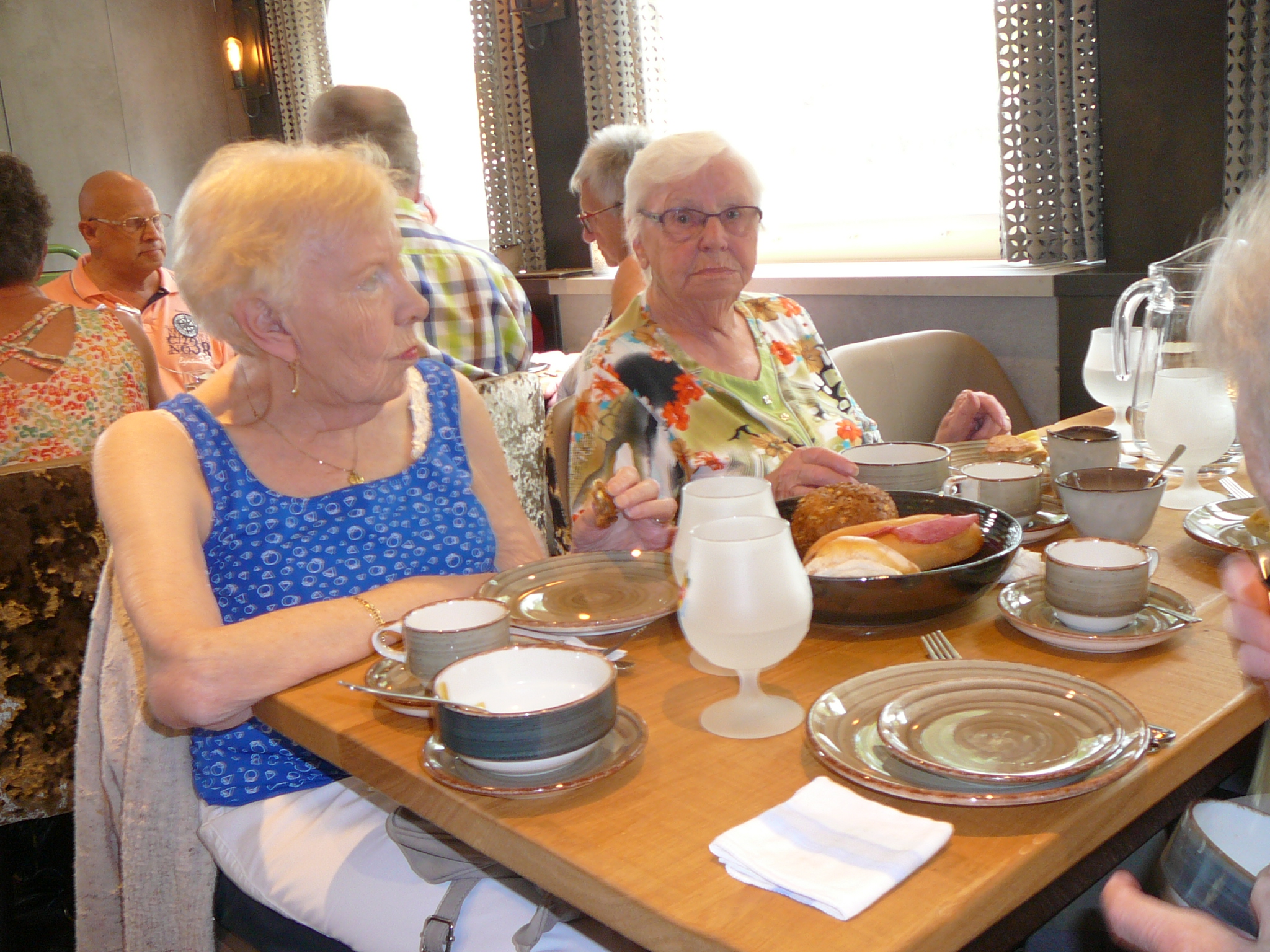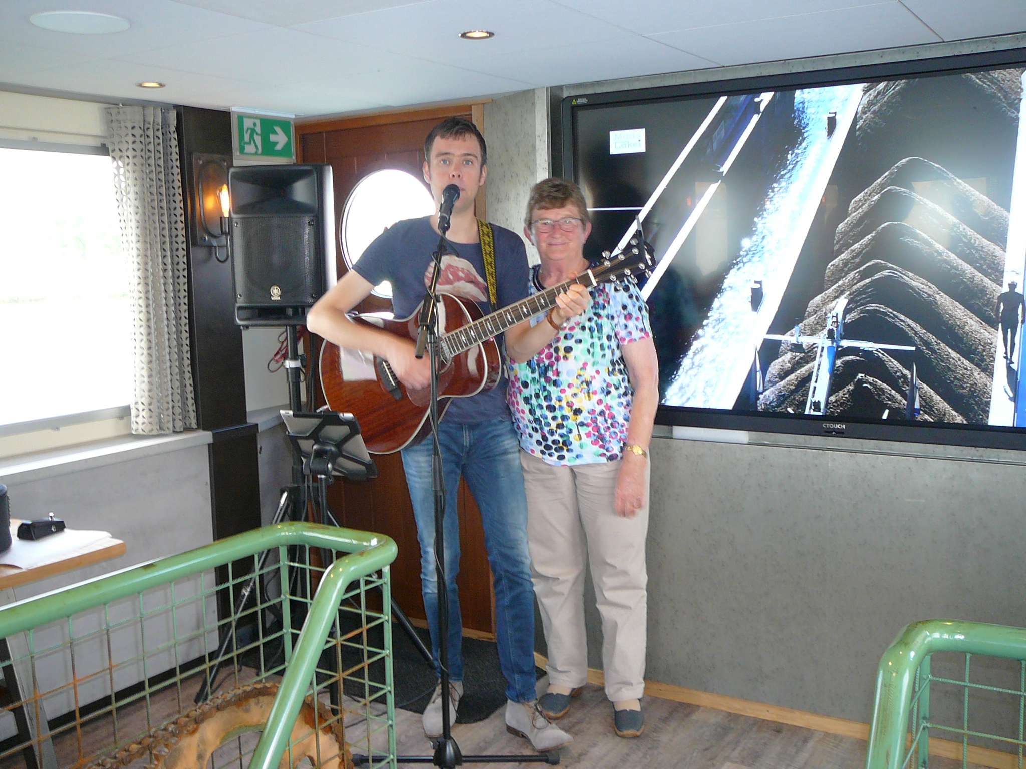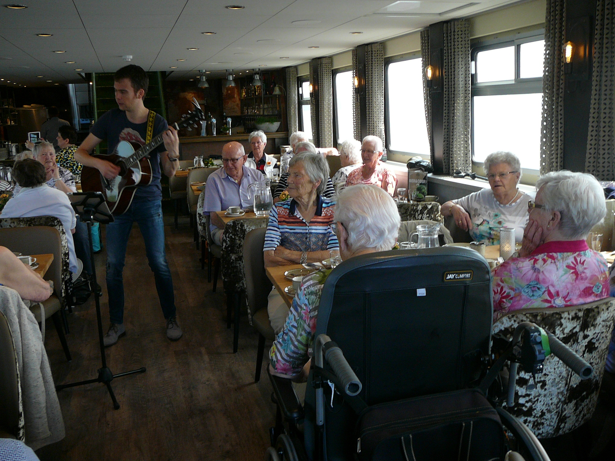 De muzikant Tim Crins zong en speelde op zijn gitaar liedjes die bij de meeste gasten erg bekend in de oren klonken en er werd dan ook volop meegezongen. De bemanning zorgde voor koffie of thee met verse vlaai en tussen de middag serveerden ze een heerlijke lunch. En terwijl iedereen kletste, zong of lekker zat te smikkelen voer het schip rustig door: langs de sluispassage van Linne, de drijvende vakantiewoningen van Oolderhuuske, een prachtig zicht op de skyline van Roermond, het stadje Wessem, over de Boschmolenplas en weer terug richting Maasbracht. Het was een geweldige dag. Iedereen heeft genoten van deze heerlijke, zonnige dag op het water.