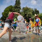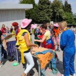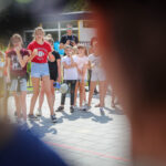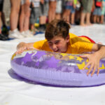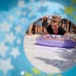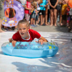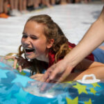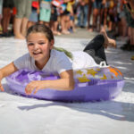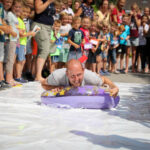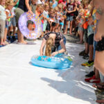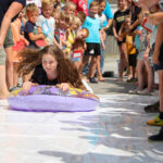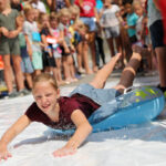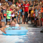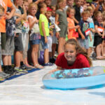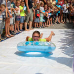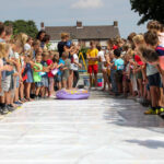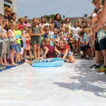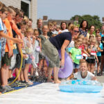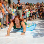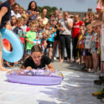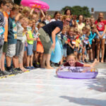 Na afloop ‘gleed’ groep 8 naar buiten op een heuse zeepbaan. Eén voor één namen de schoolverlaters een aanloop en gleden op een zwemband de poort uit. De vakantie kan beginnen.