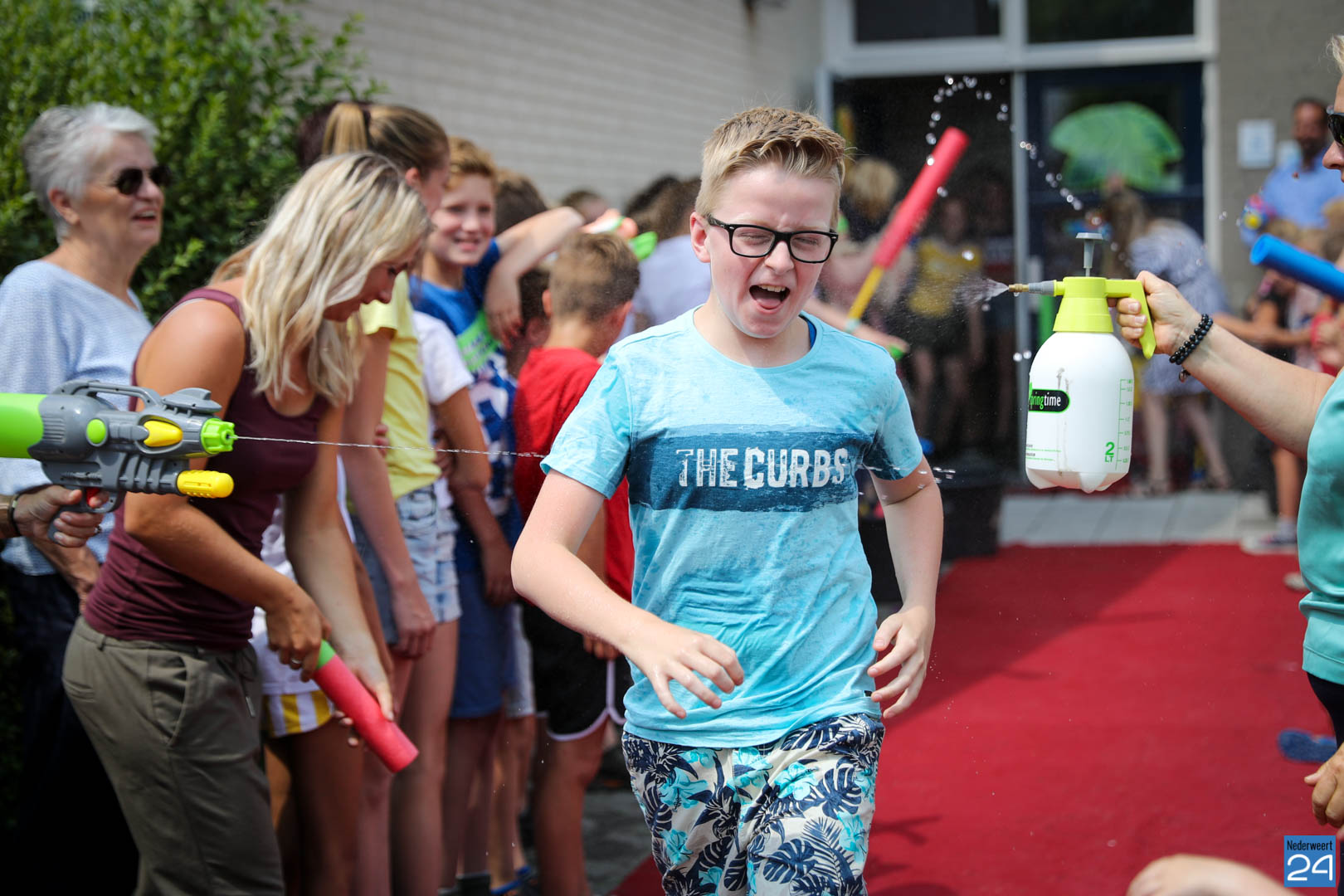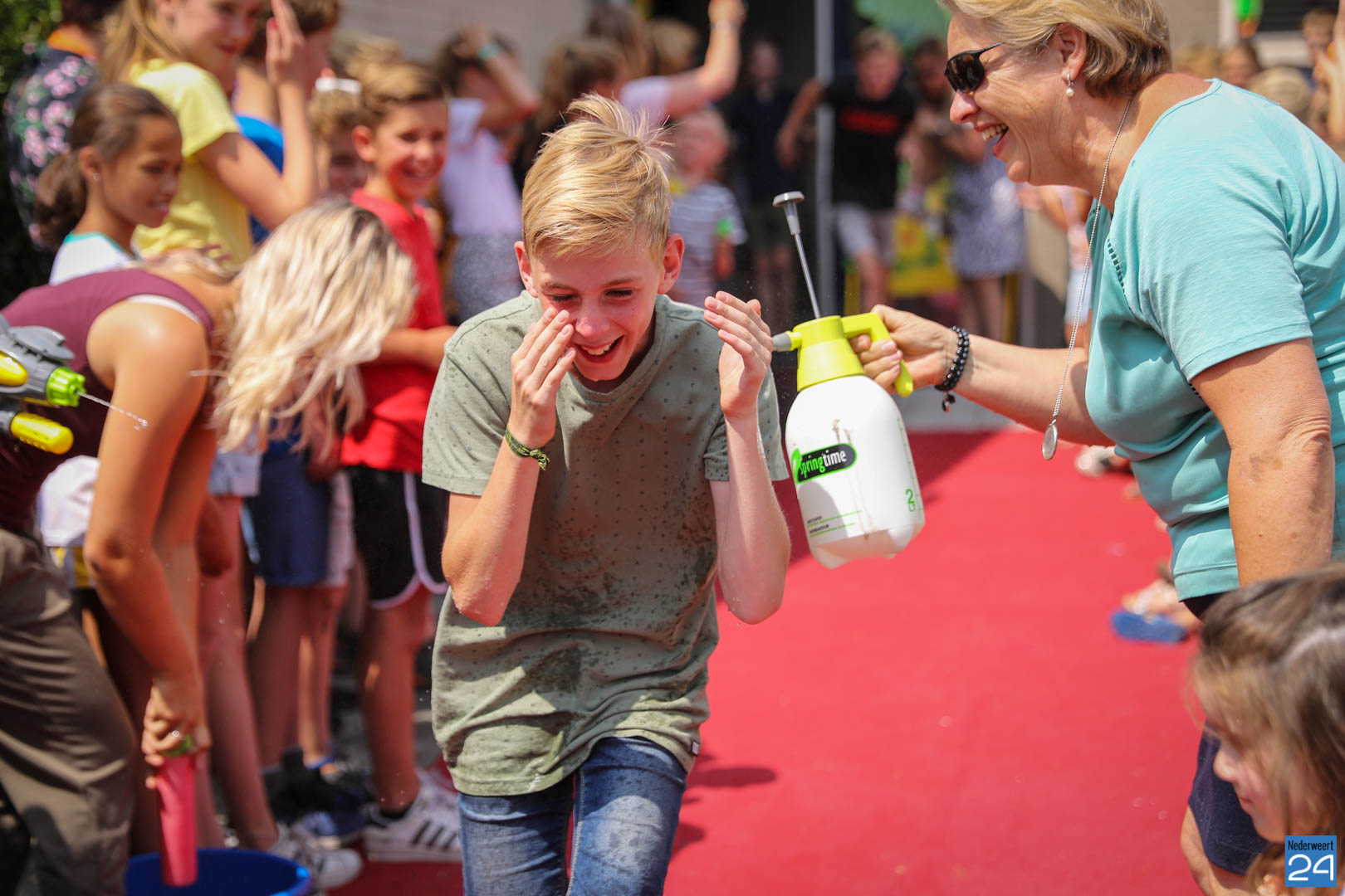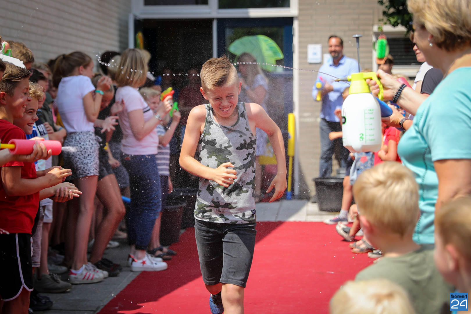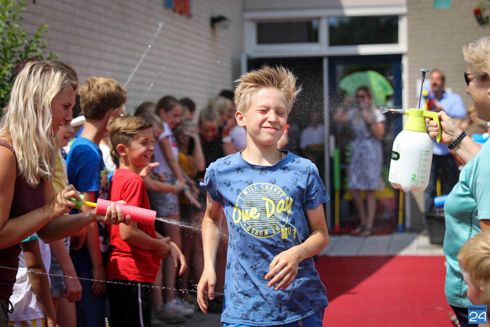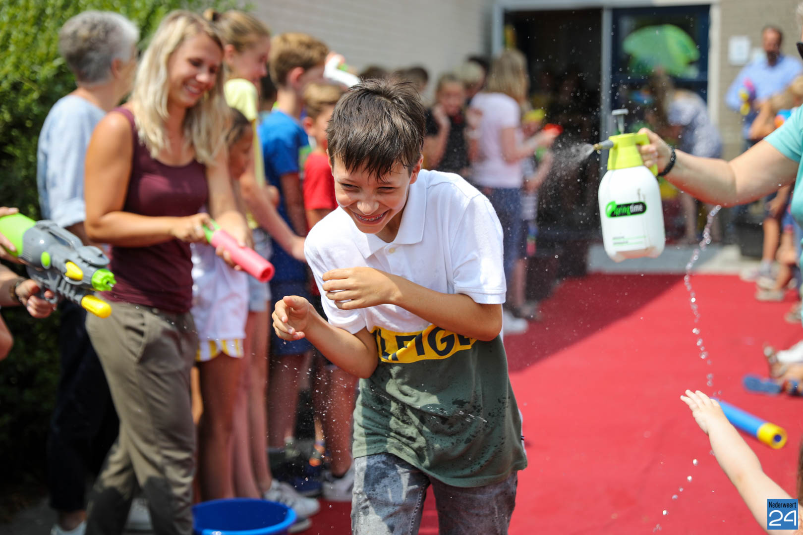 Alle leerlingen en leerkrachten stonden samen met ouders, grootouders, oud leerlingen en andere belangstellenden buiten om de schoolverlaters letterlijk naar buiten te spuiten. De leerlingen van groep 8 liepen tussen de menigte door en werden natgespoten met water. Een fantastische happening. De vakantie kan beginnen.