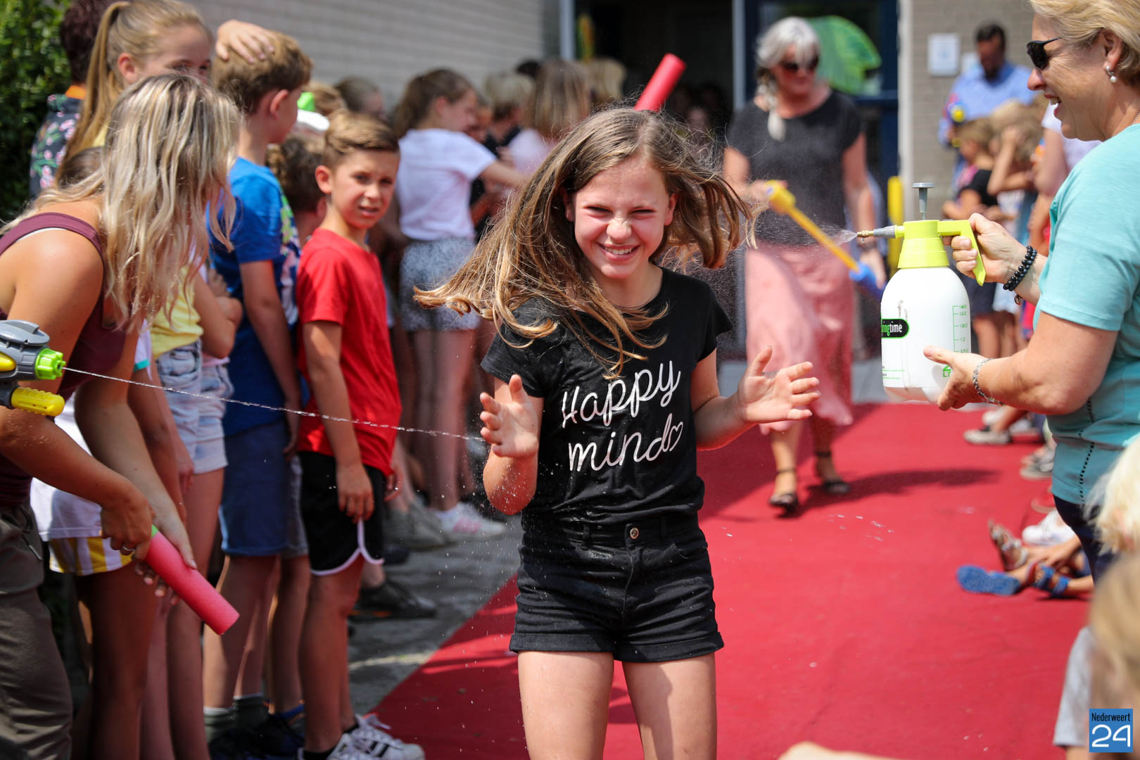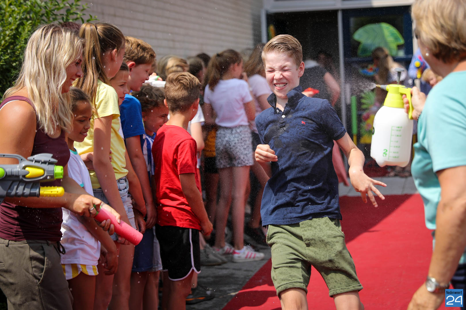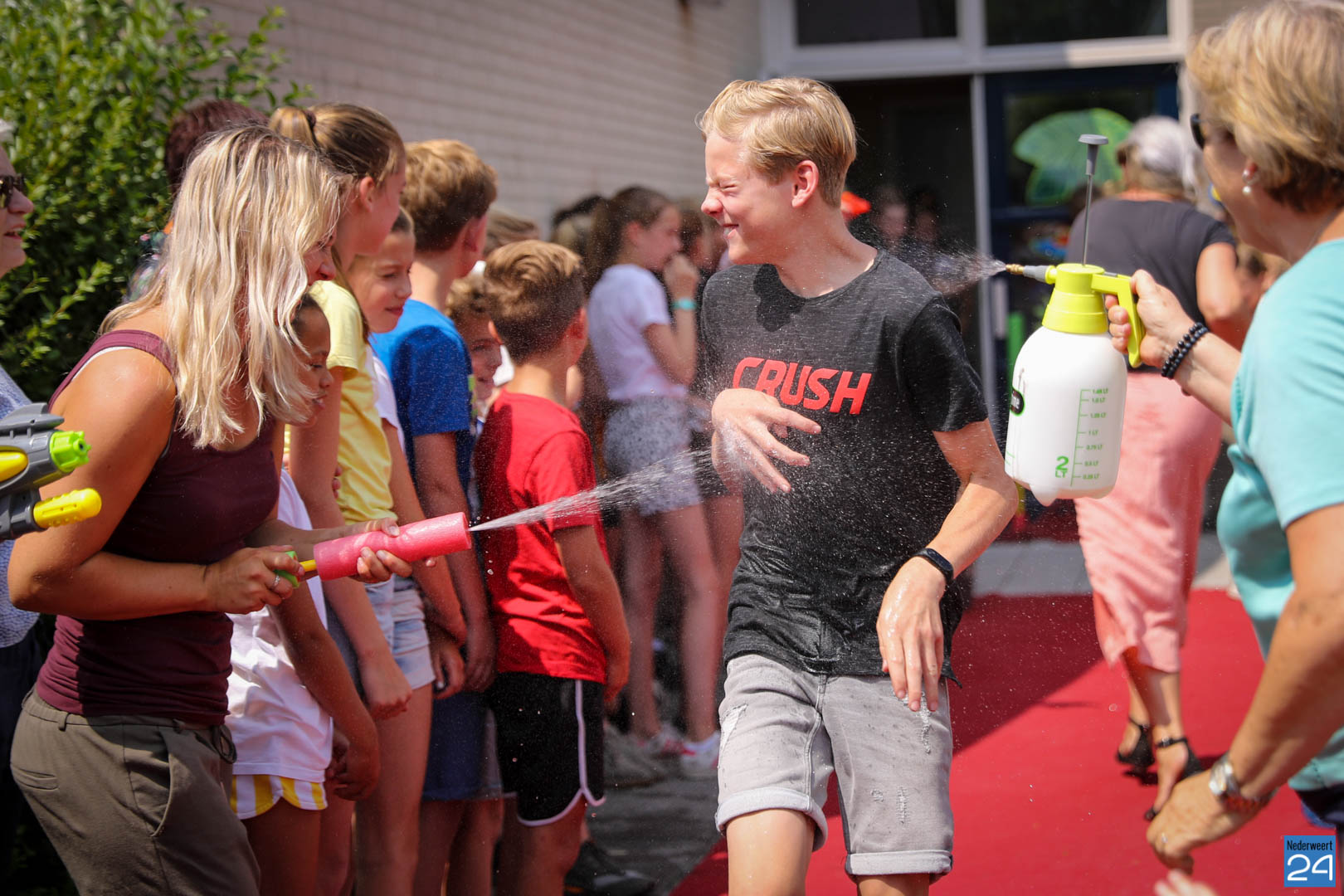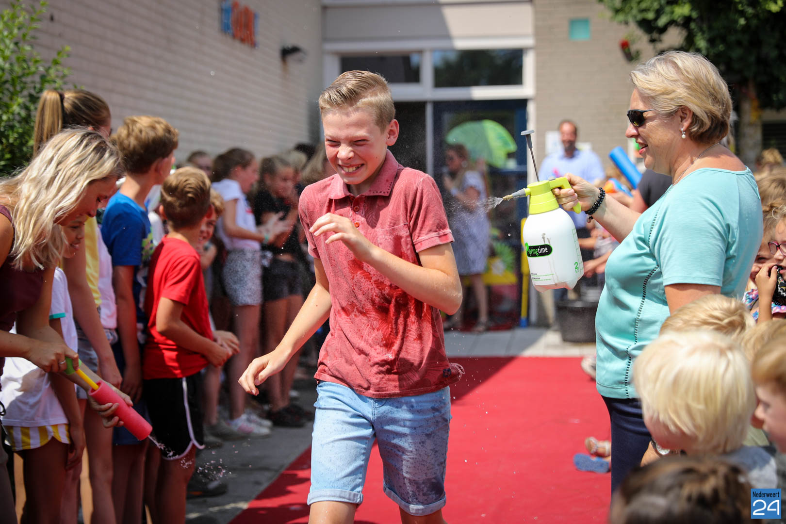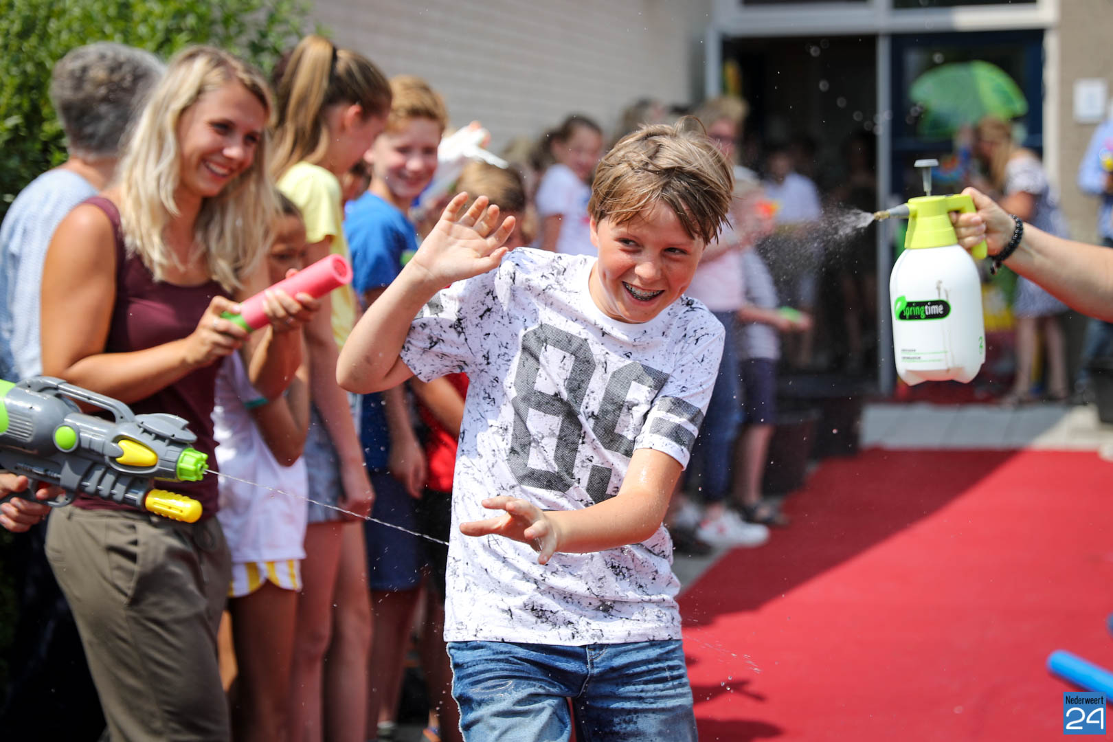 Alle leerlingen en leerkrachten stonden samen met ouders, grootouders, oud leerlingen en andere belangstellenden buiten om de schoolverlaters letterlijk naar buiten te spuiten. De leerlingen van groep 8 liepen tussen de menigte door en werden natgespoten met water. Een fantastische happening. De vakantie kan beginnen.
