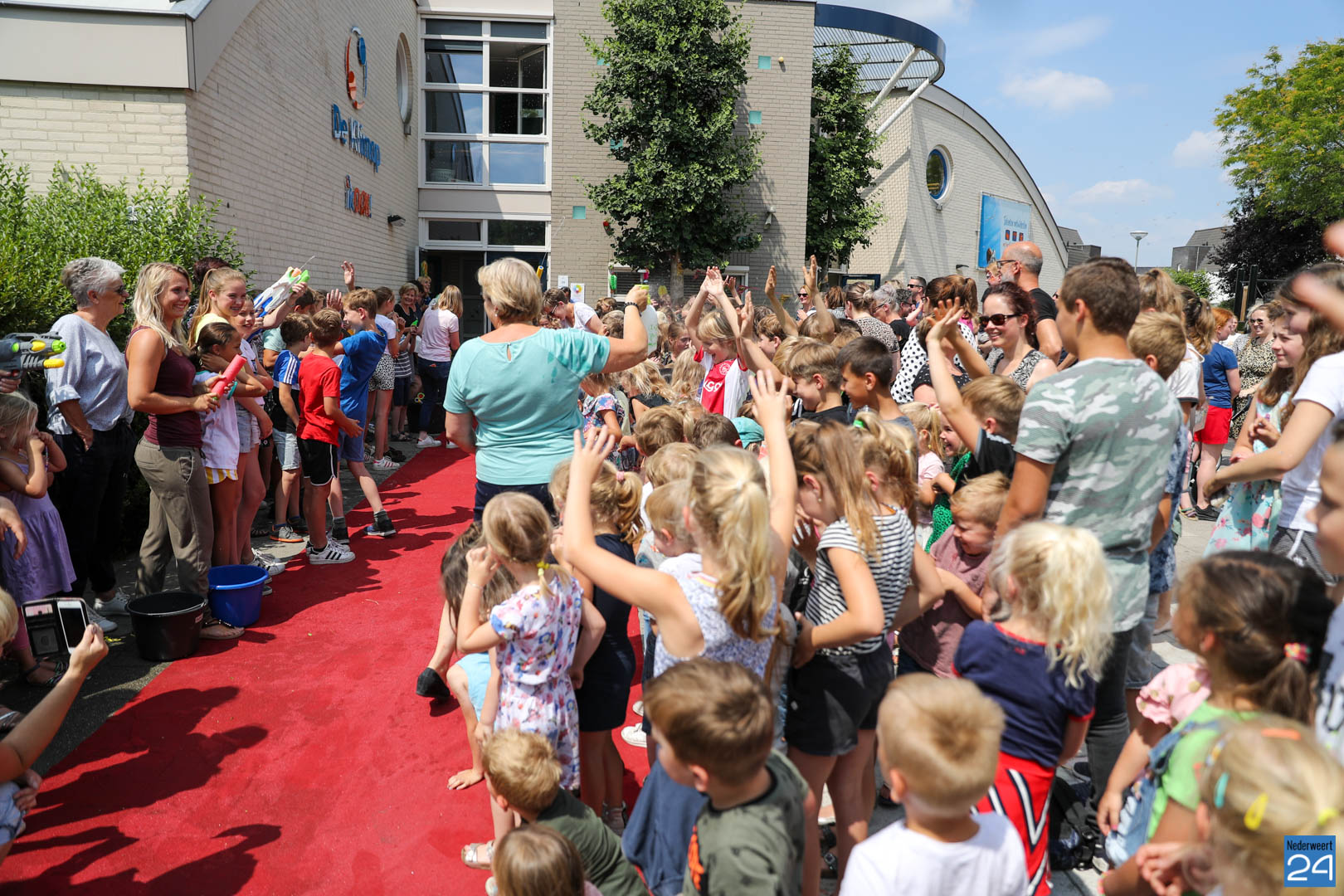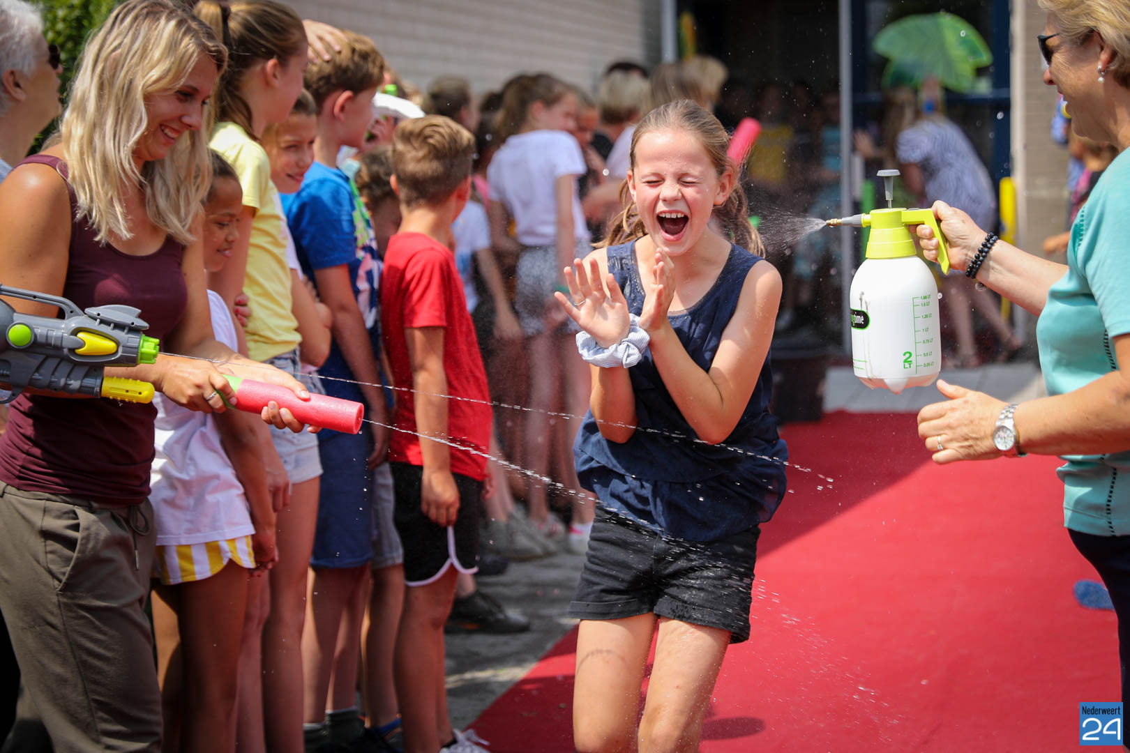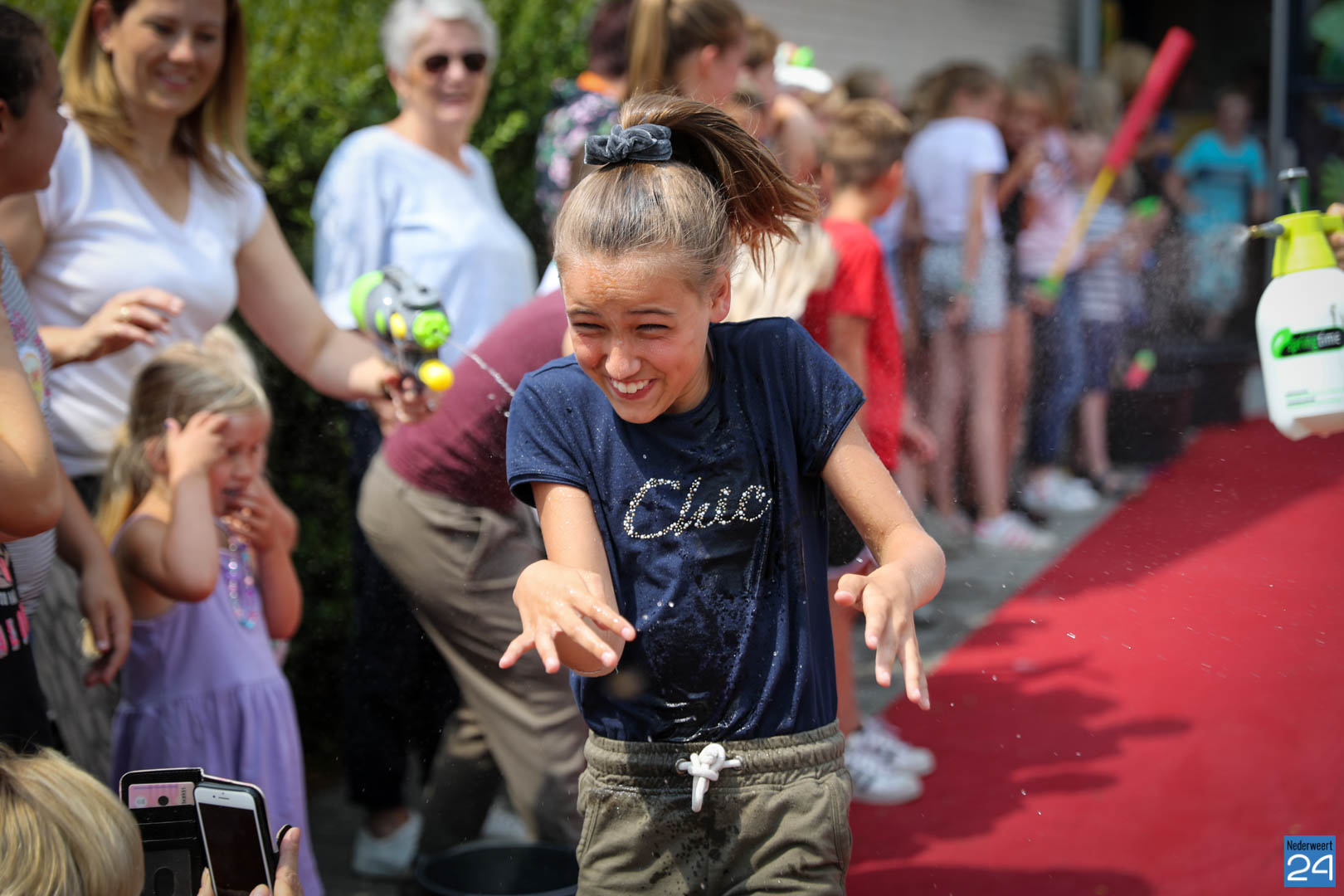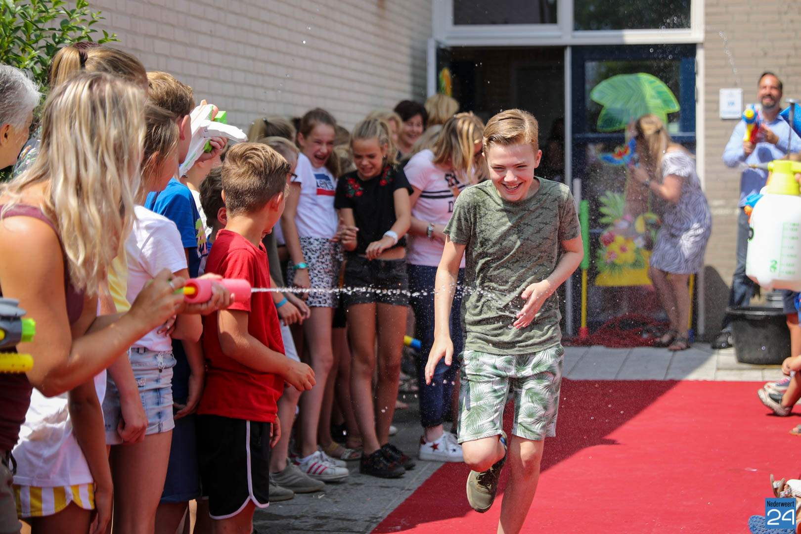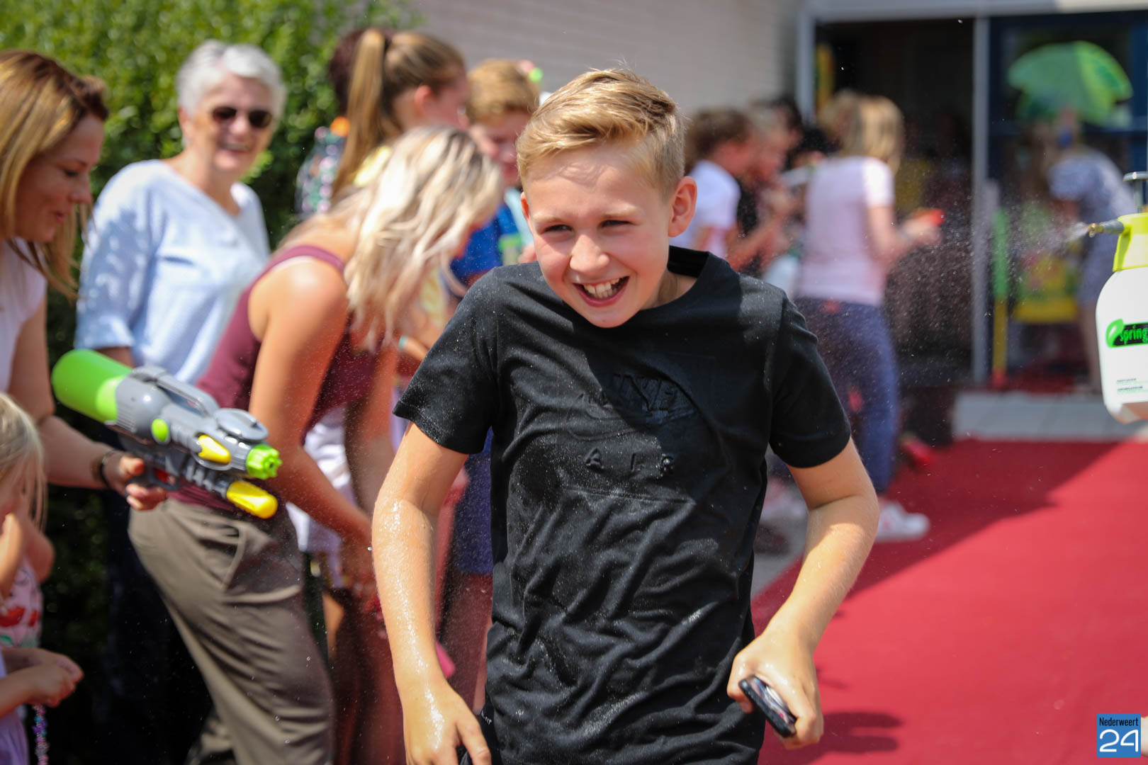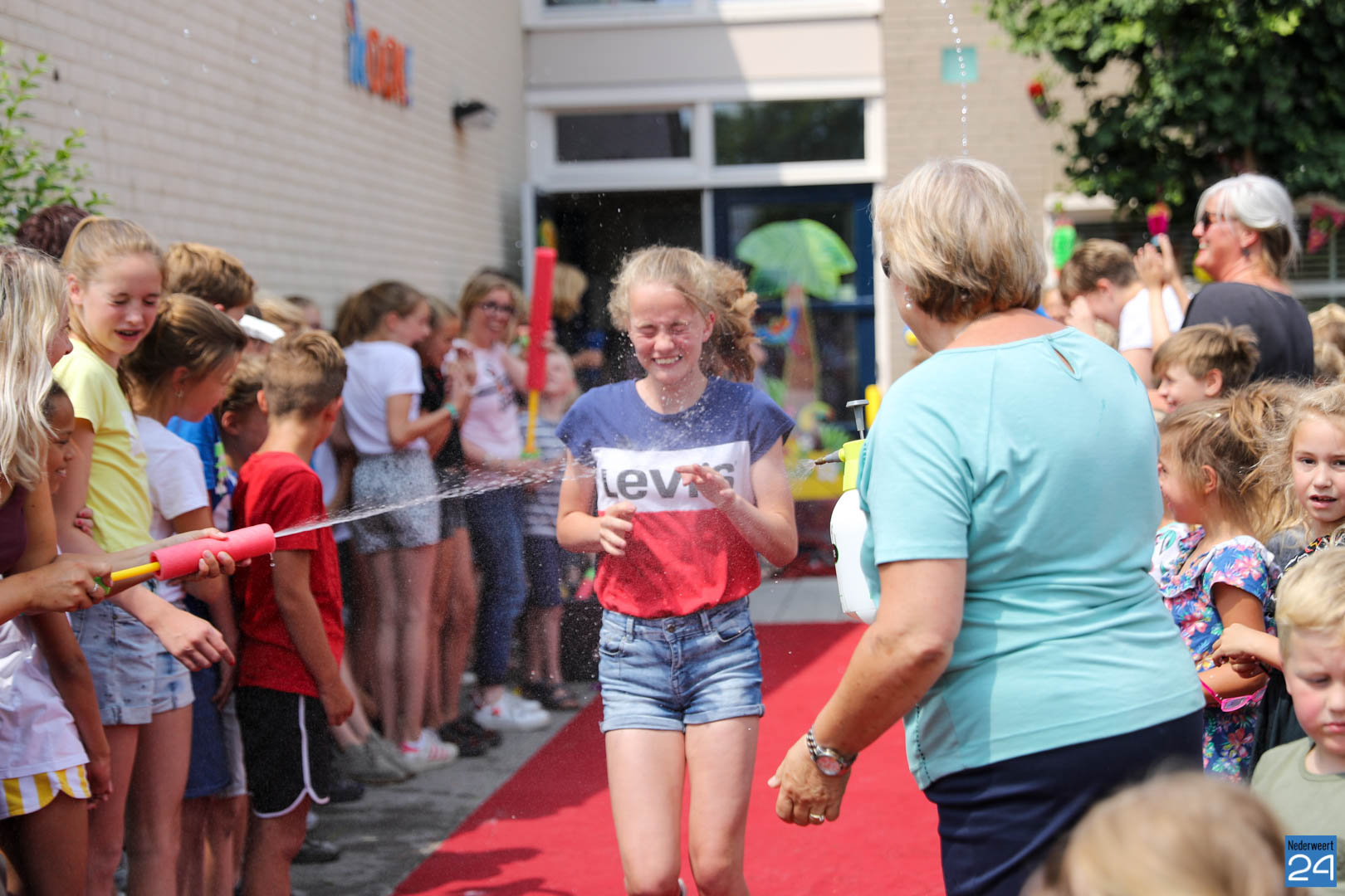 Alle leerlingen en leerkrachten stonden samen met ouders, grootouders, oud leerlingen en andere belangstellenden buiten om de schoolverlaters letterlijk naar buiten te spuiten. De leerlingen van groep 8 liepen tussen de menigte door en werden natgespoten met water. Een fantastische happening. De vakantie kan beginnen.