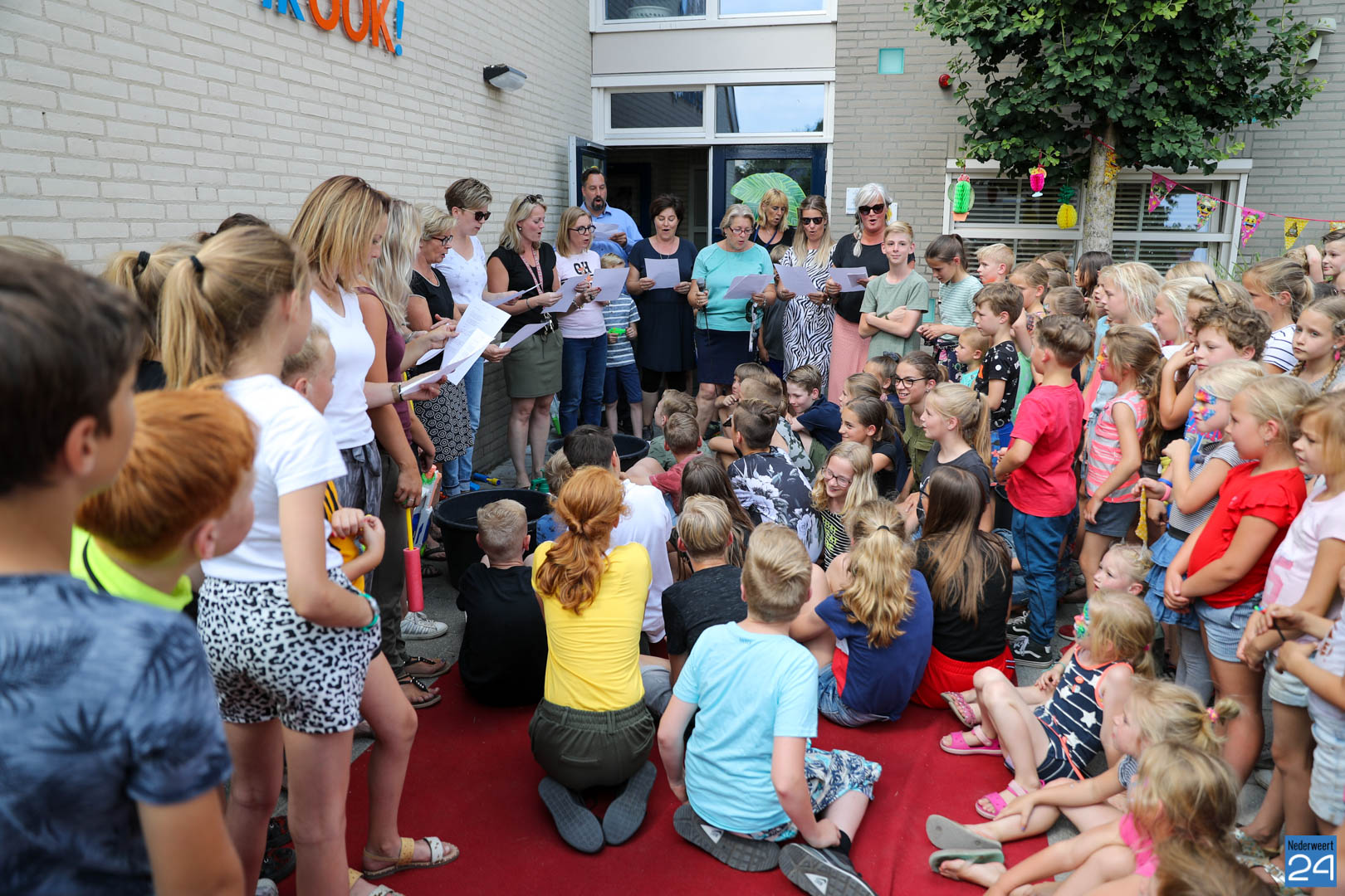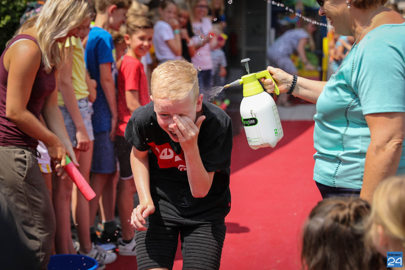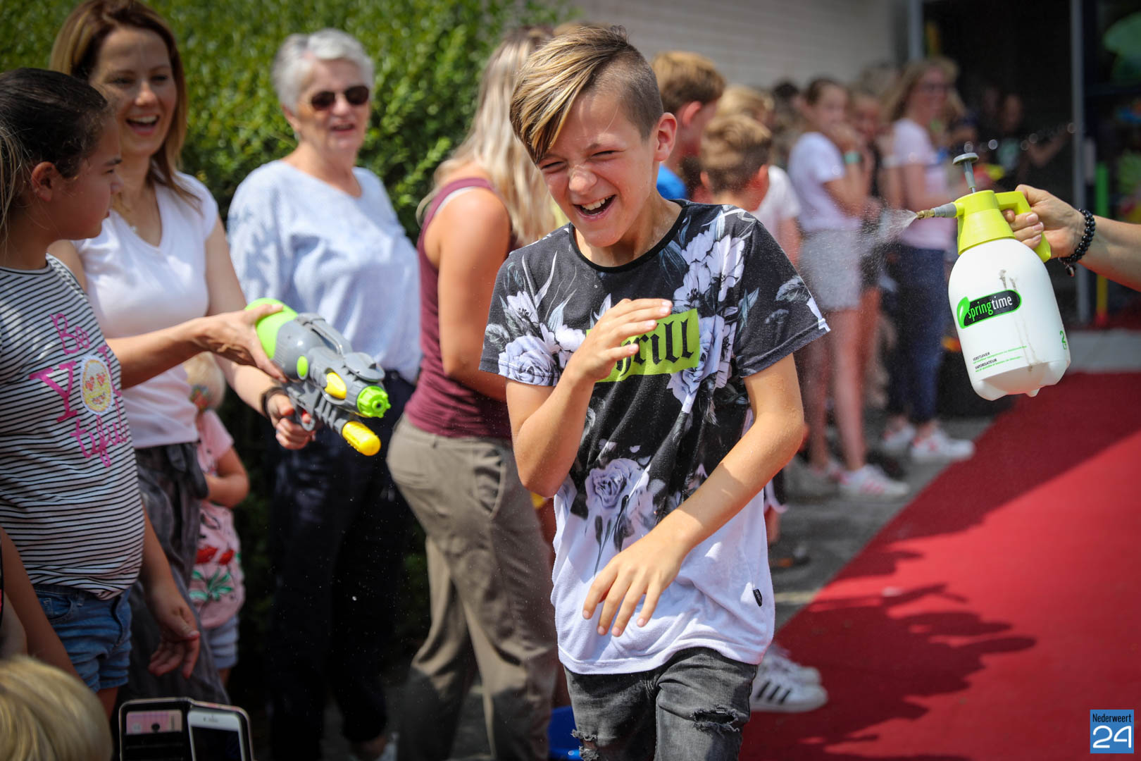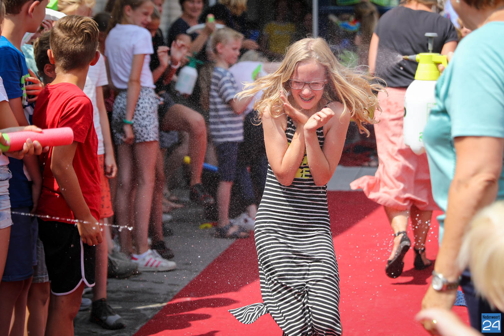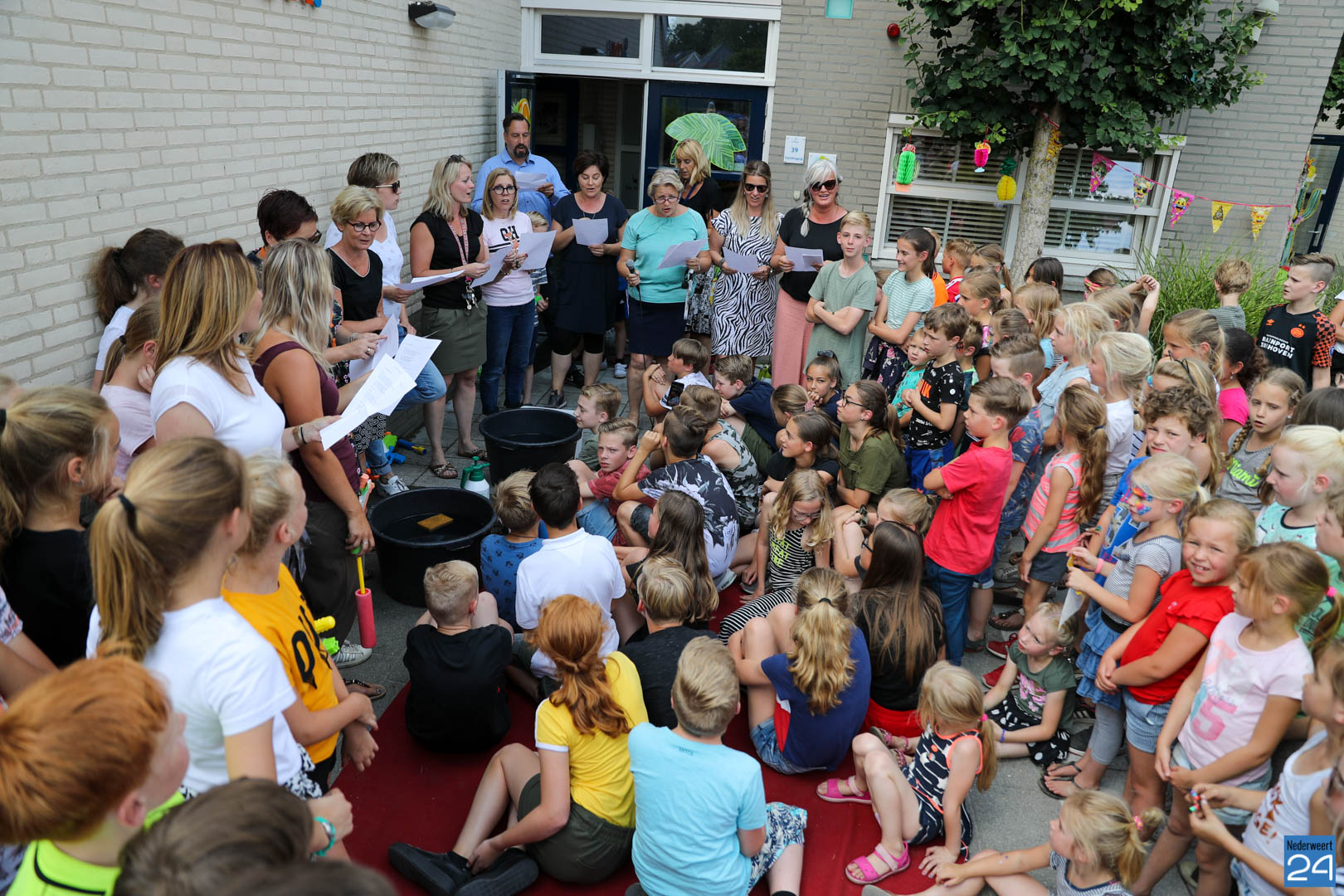 Alle leerlingen en leerkrachten stonden samen met ouders, grootouders, oud leerlingen en andere belangstellenden buiten om de schoolverlaters letterlijk naar buiten te spuiten. De leerlingen van groep 8 liepen tussen de menigte door en werden natgespoten met water. Een fantastische happening. De vakantie kan beginnen.