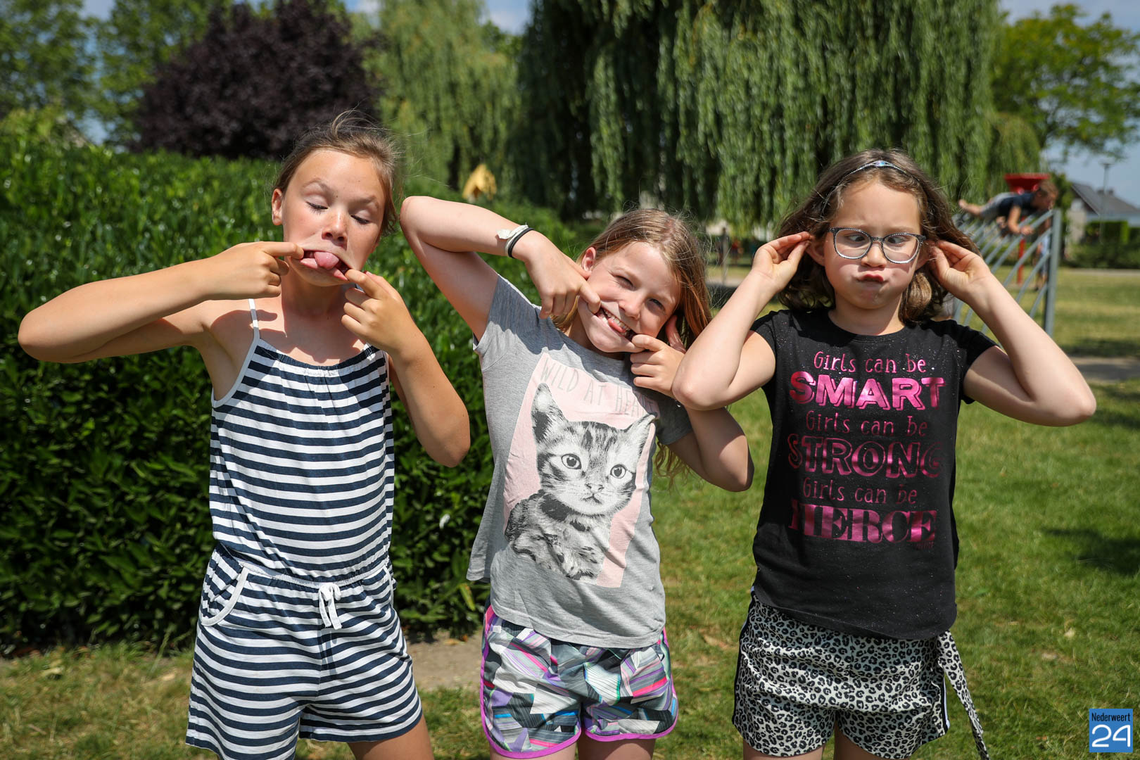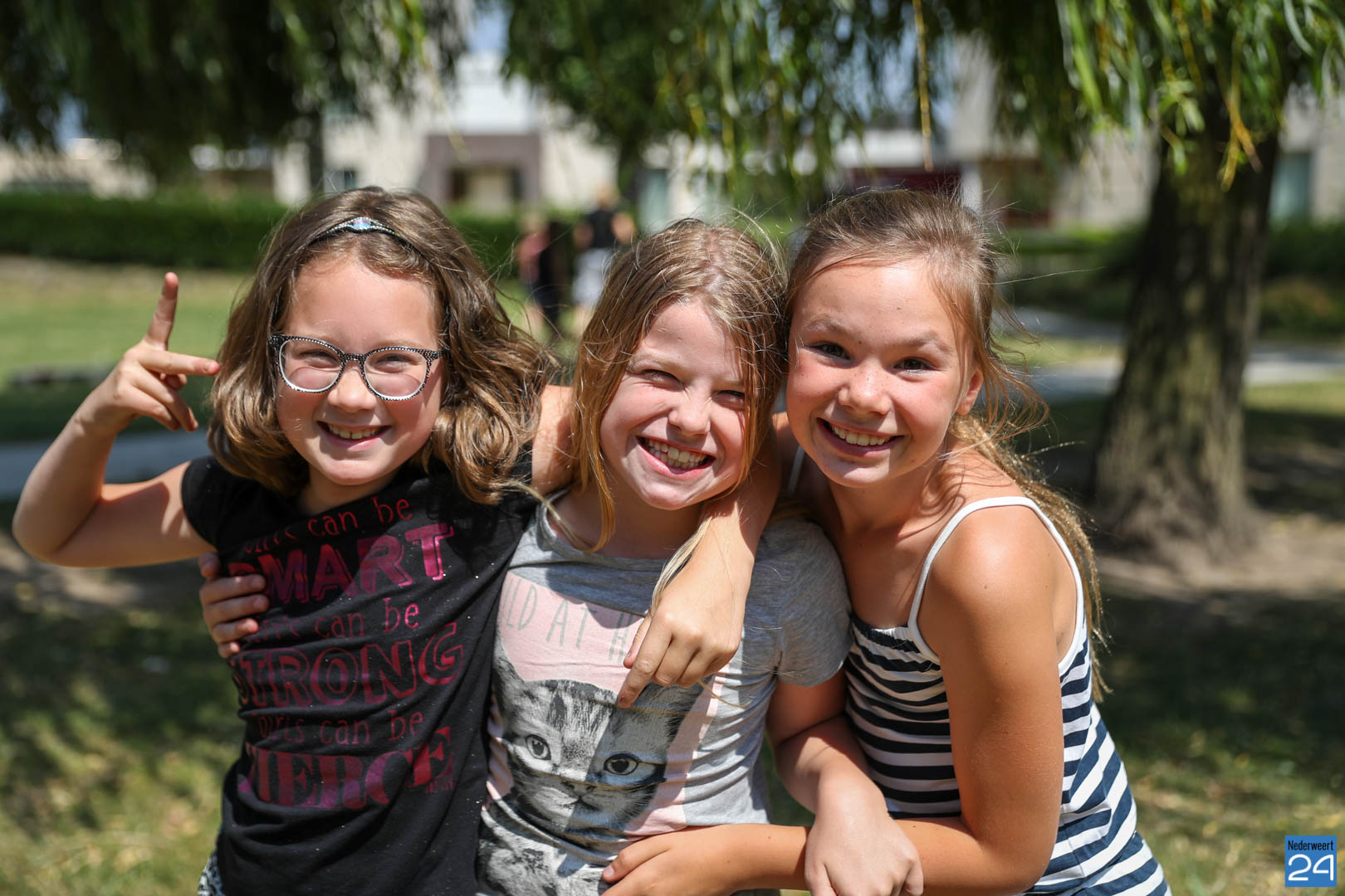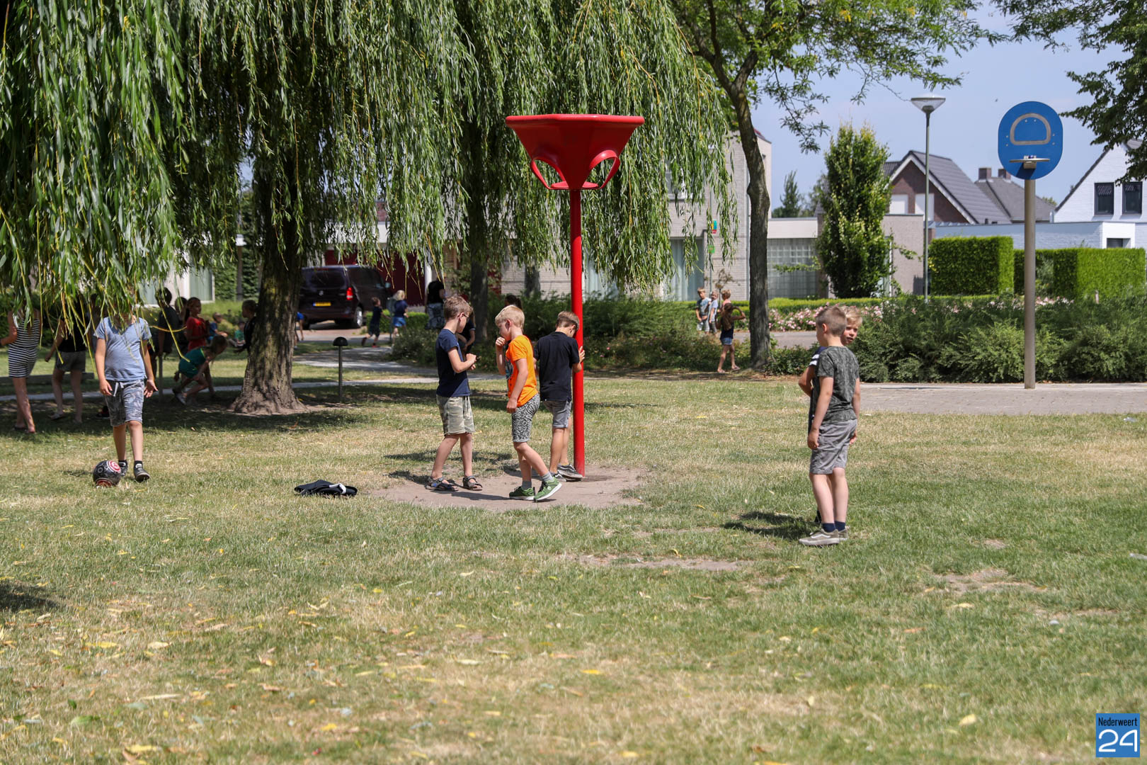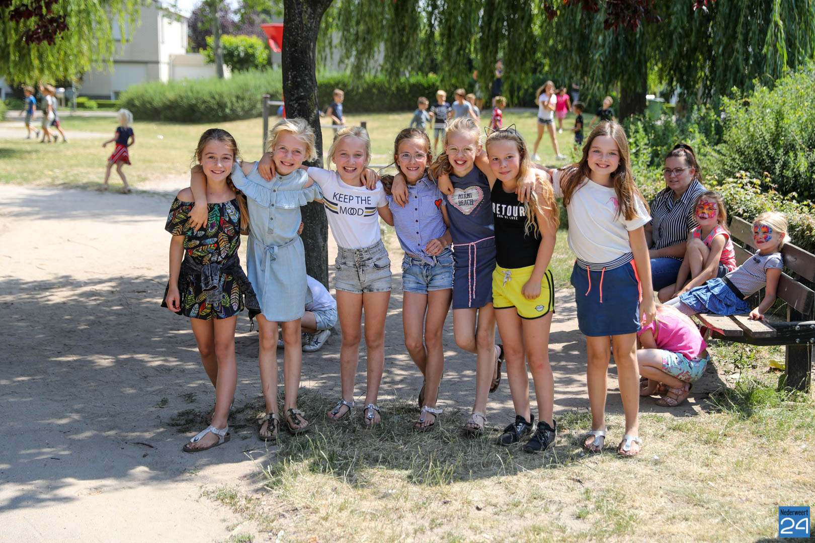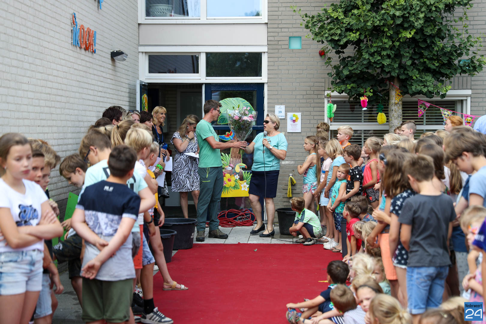 Alle leerlingen en leerkrachten stonden samen met ouders, grootouders, oud leerlingen en andere belangstellenden buiten om de schoolverlaters letterlijk naar buiten te spuiten. De leerlingen van groep 8 liepen tussen de menigte door en werden natgespoten met water. Een fantastische happening. De vakantie kan beginnen.