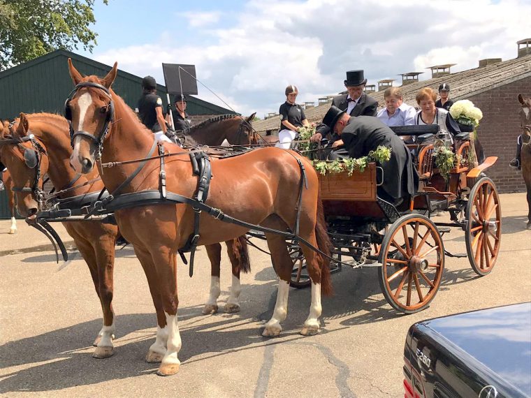 Het paar werd van huis uit met een prachtige koets en onder begeleiding van paarden naar de feestzaal gereden. Op deze zonnige dag was een dekentje over de knieën niet nodig, maar wel een borreltje voor de goede afloop. Dit geeft het feest een extra gouden randje.